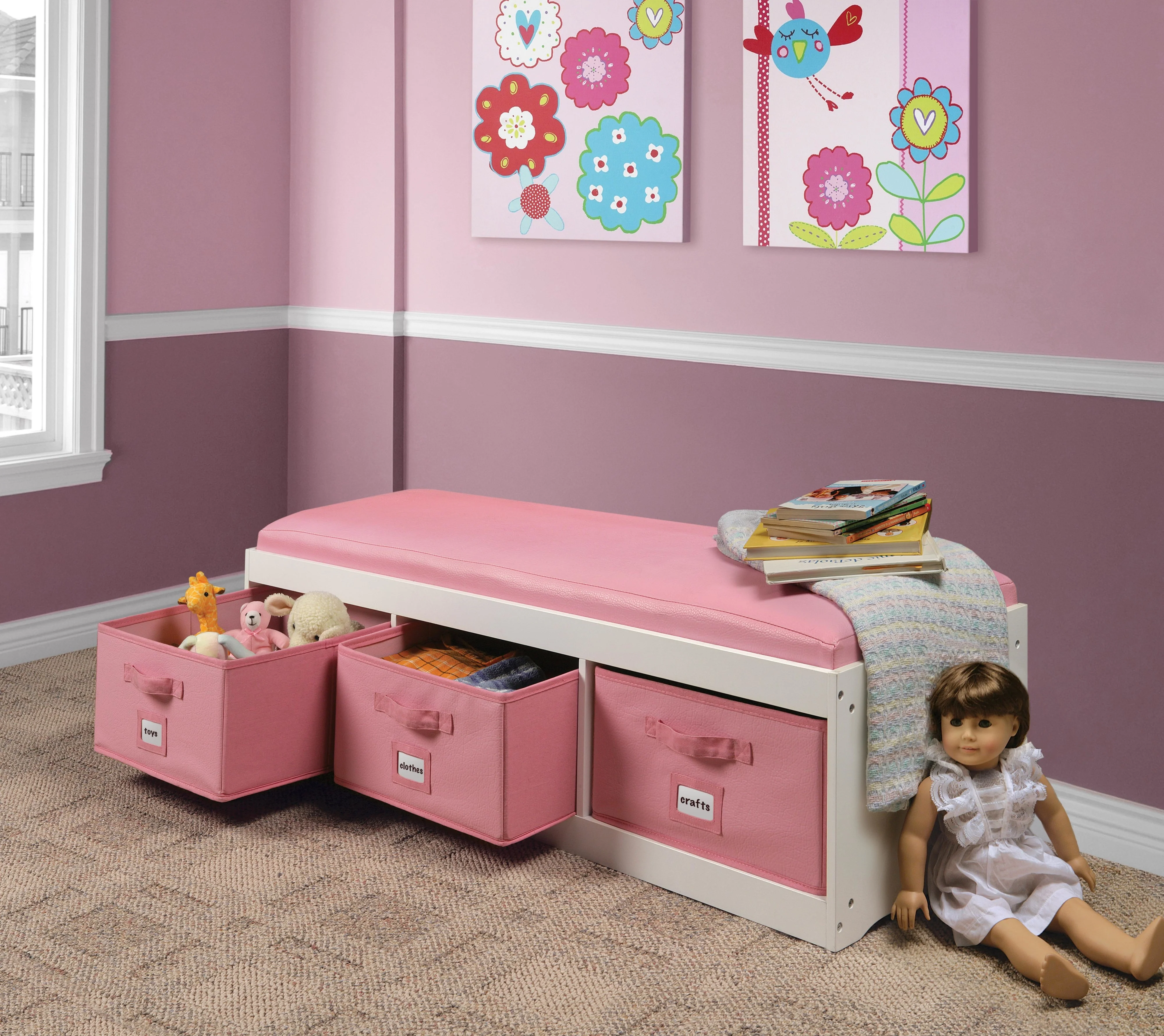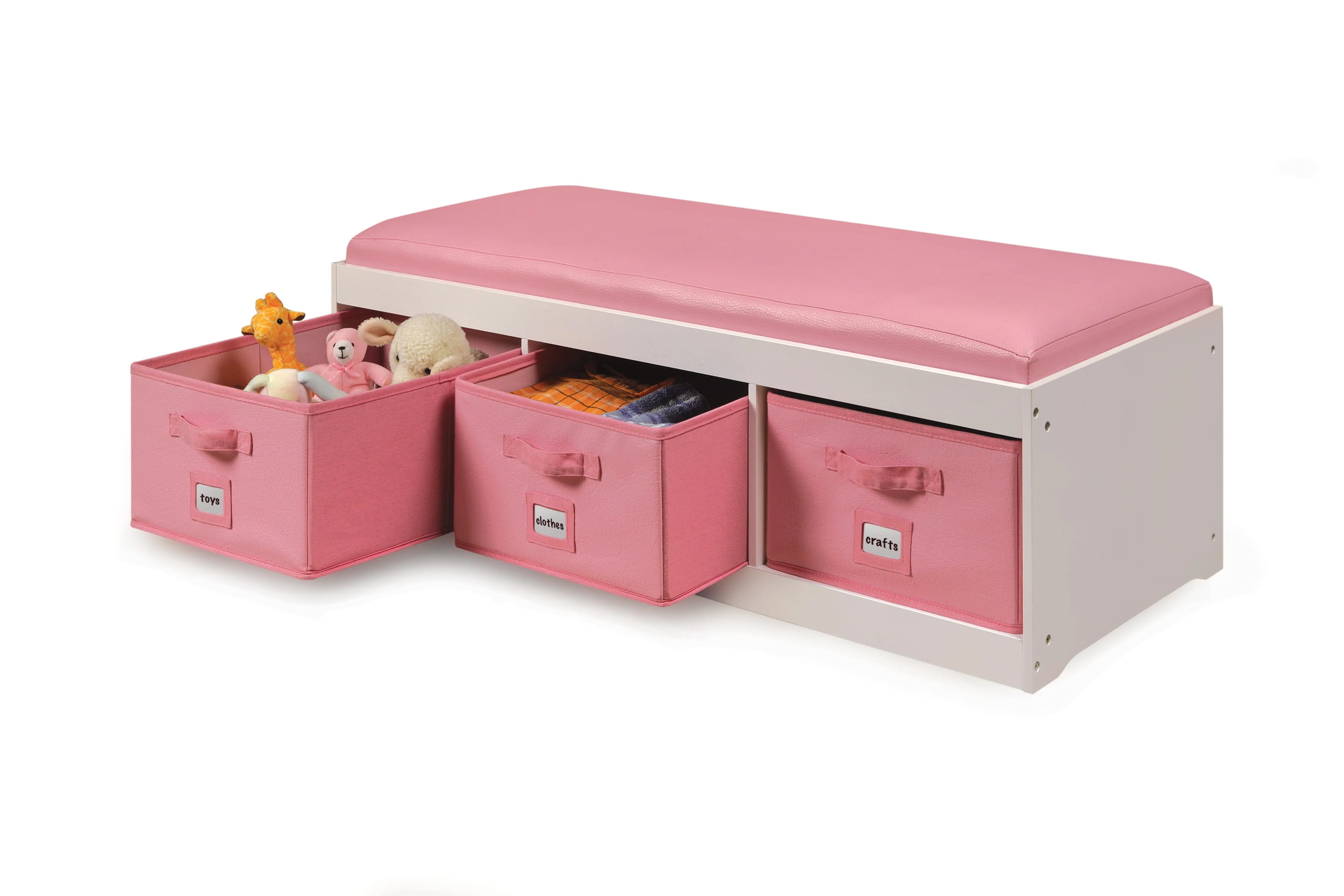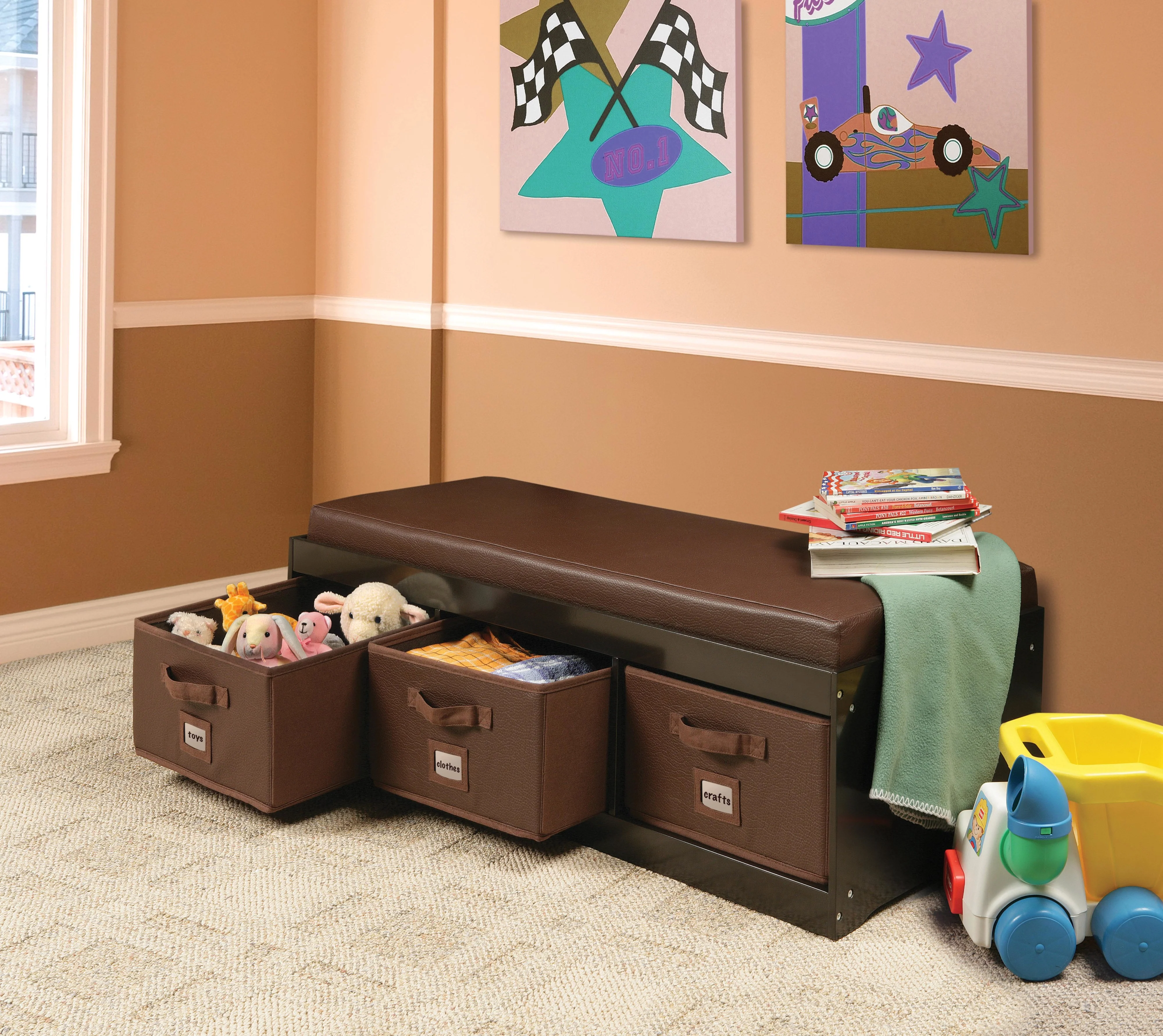 - A comfortable and padded Kid’s Storage Bench from Badger Basket with ample storage below to organize toys, games, and more.