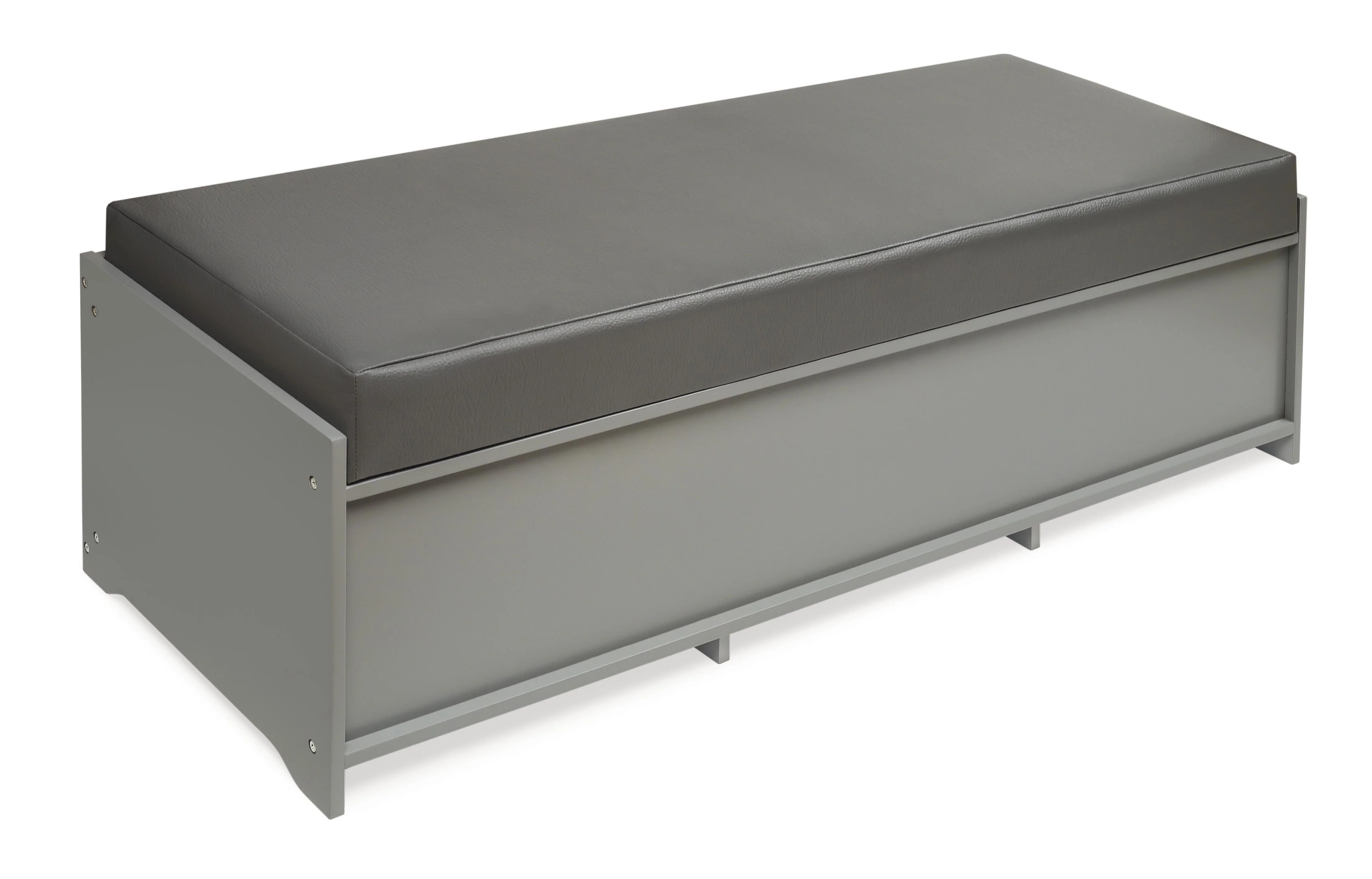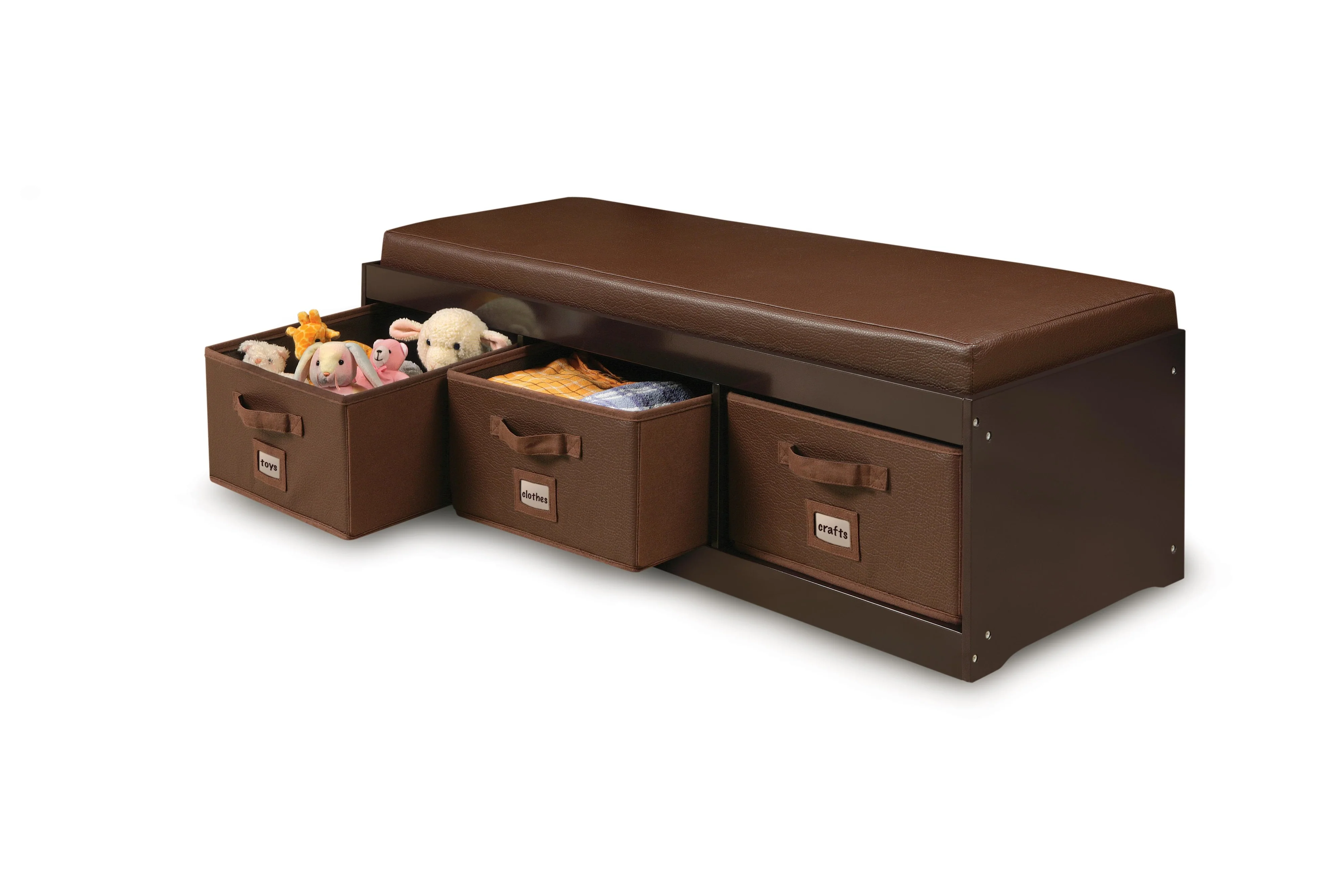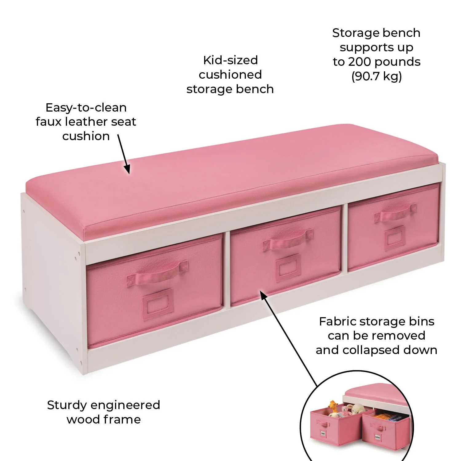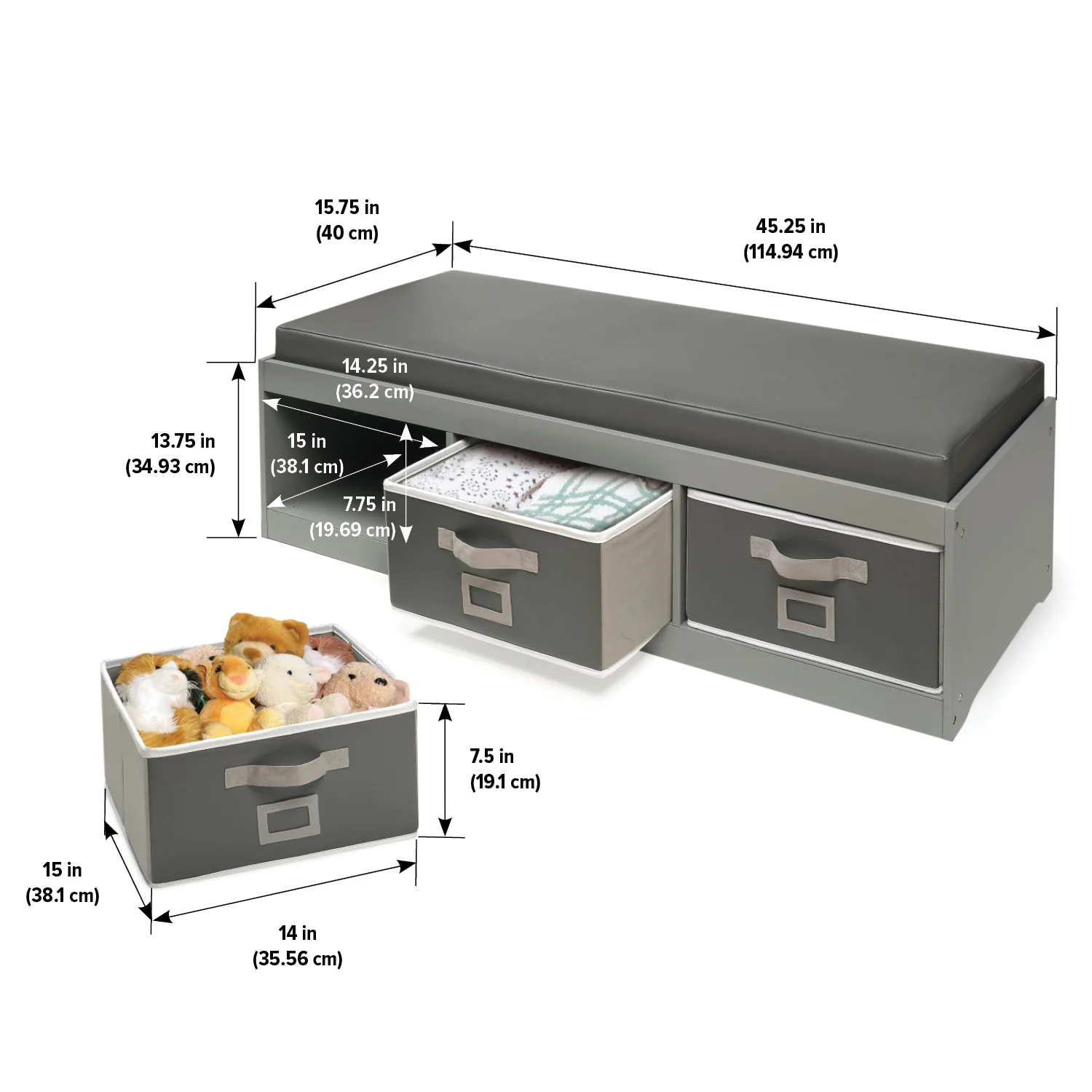 - A comfortable and padded Kid’s Storage Bench from Badger Basket with ample storage below to organize toys, games, and more.