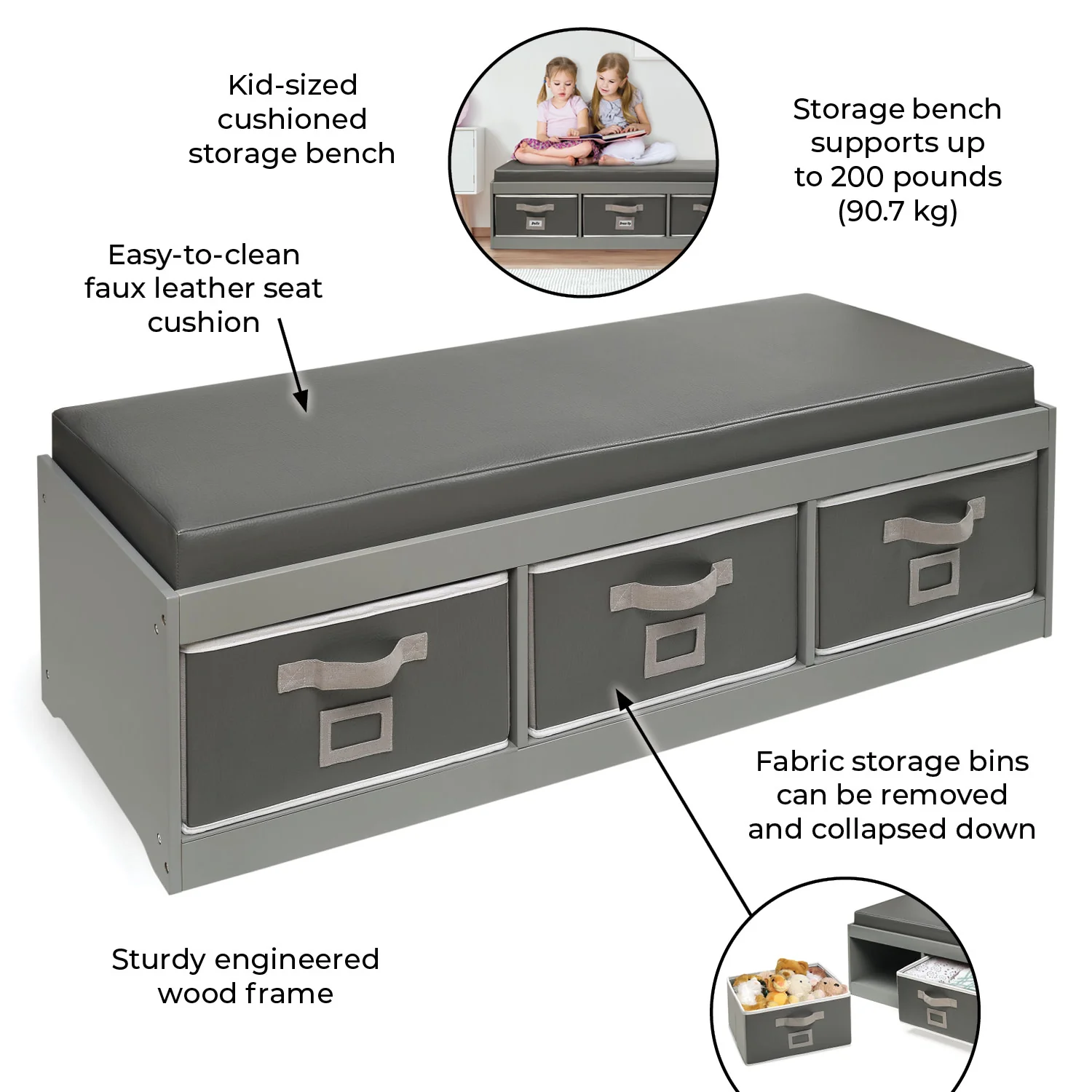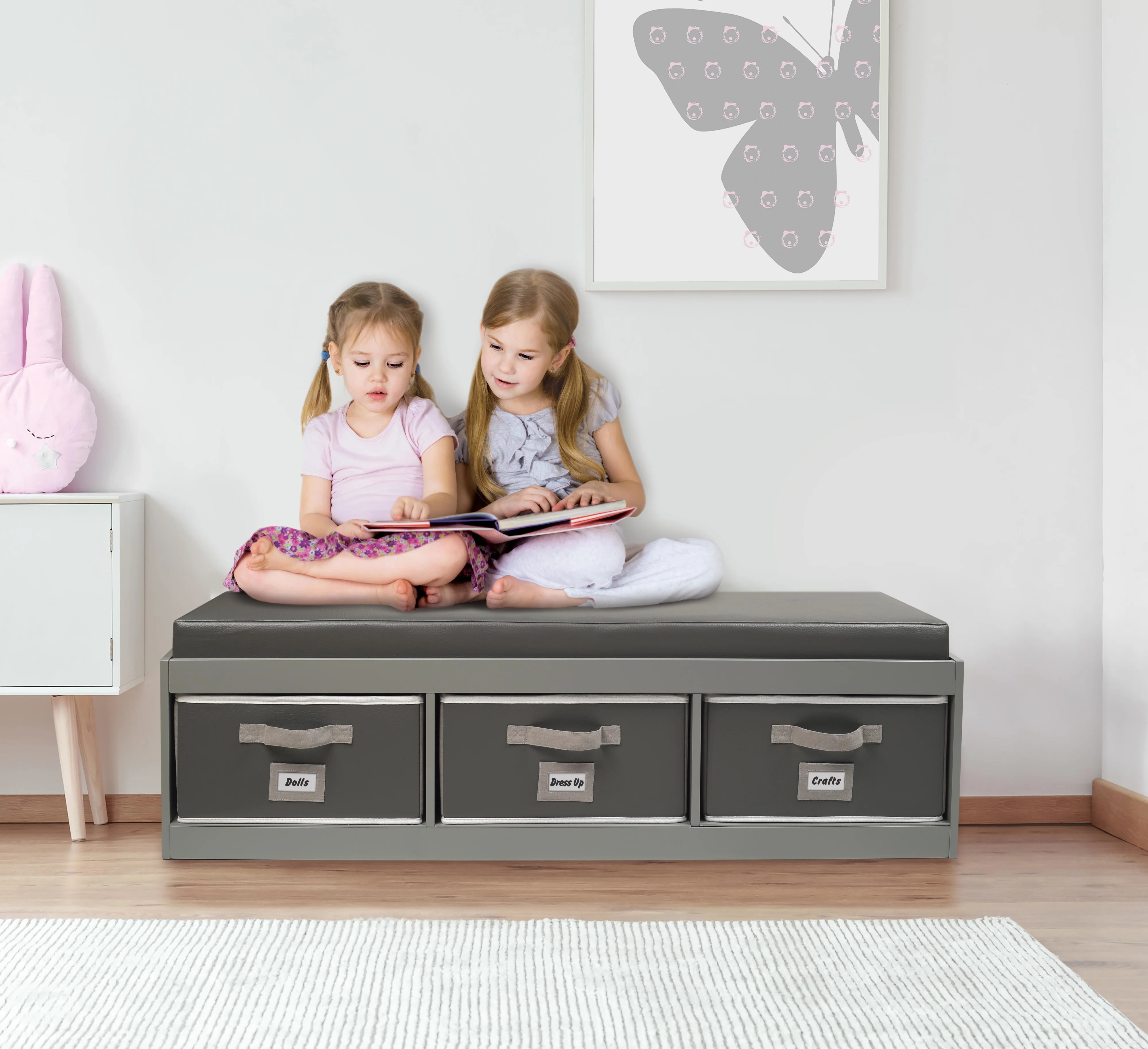 Badger Basket's Kid's Storage Bench is a thickly cushioned bench for children with storage to organize toys, stuffed animals, blankets and more. A nice place to read or have a seat to put on shoes. Fits nicely under a window or at the end of a bed.