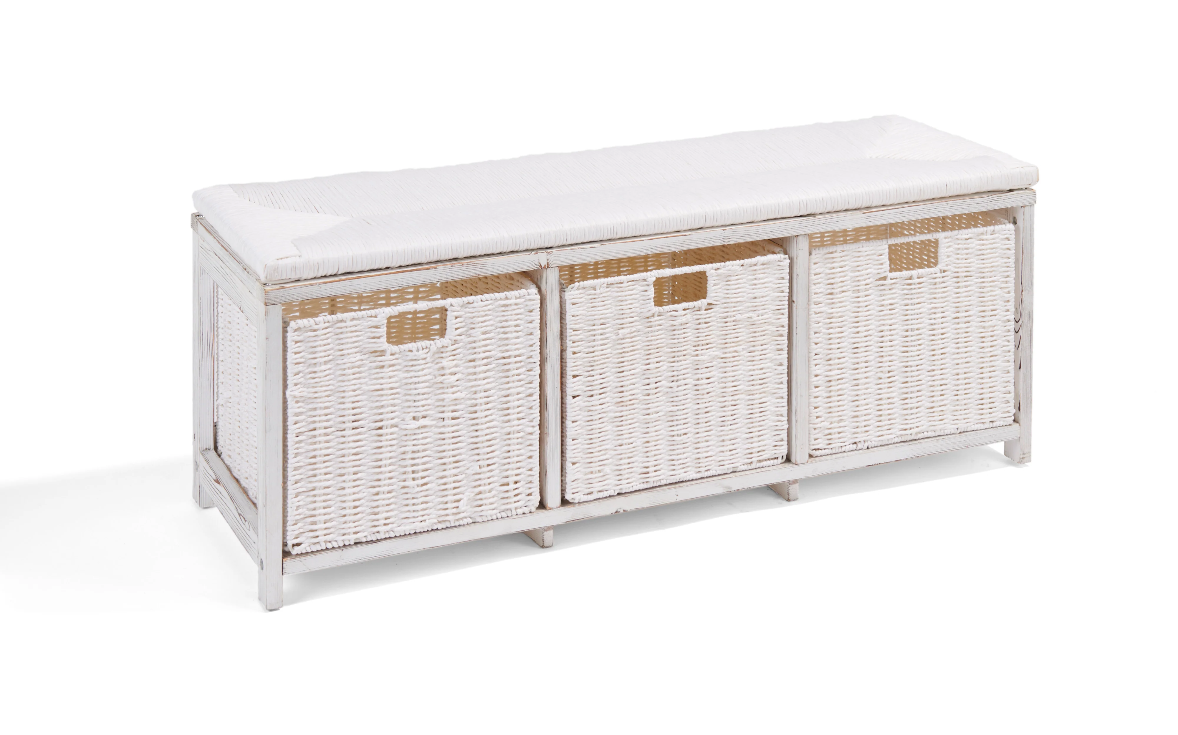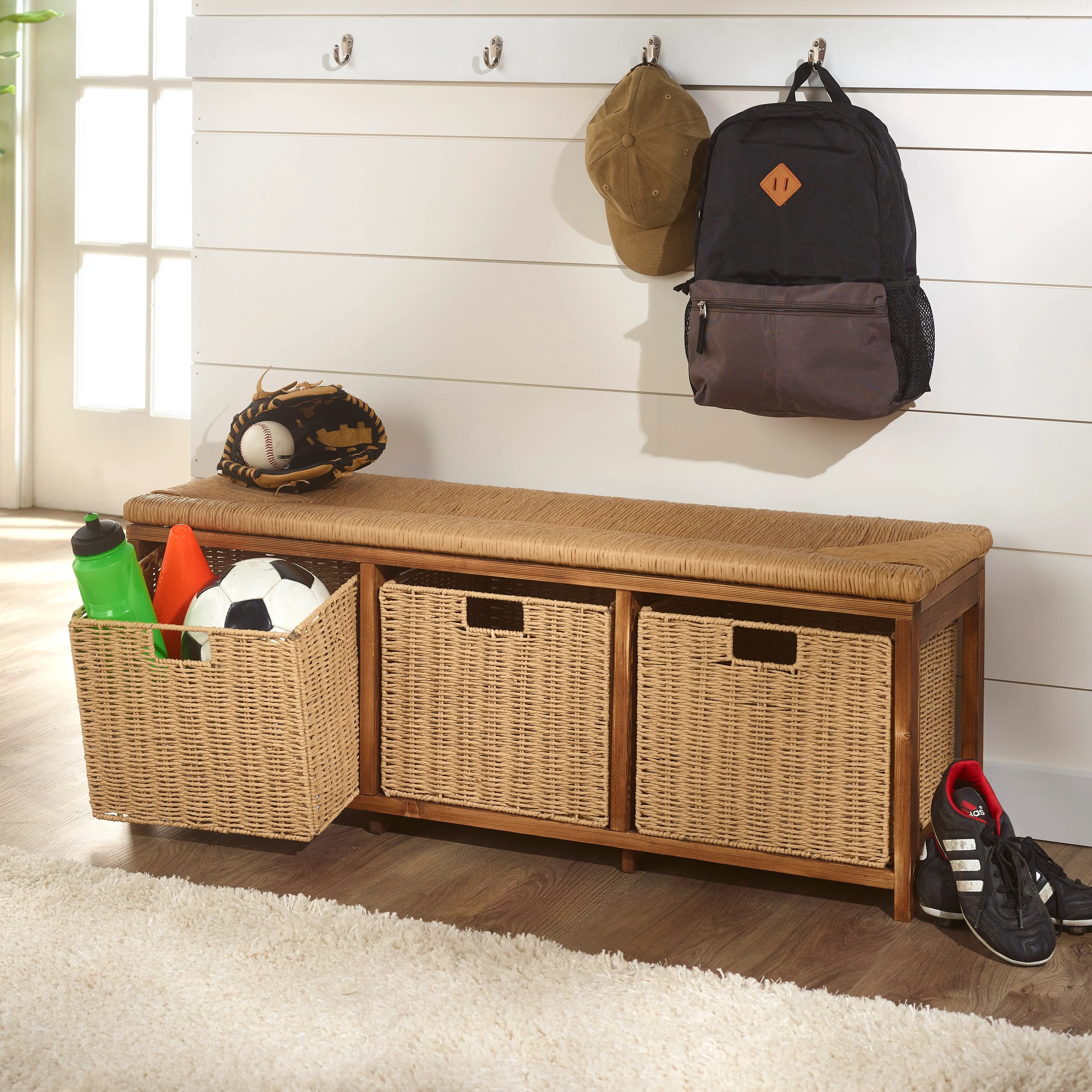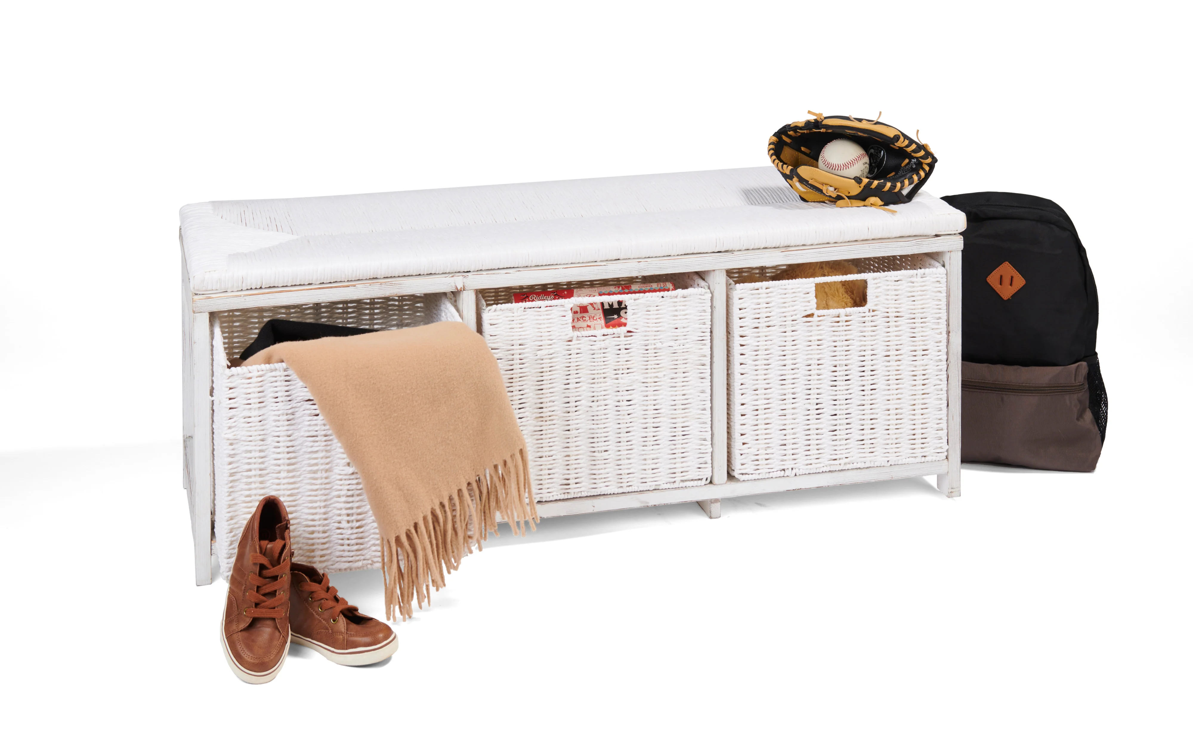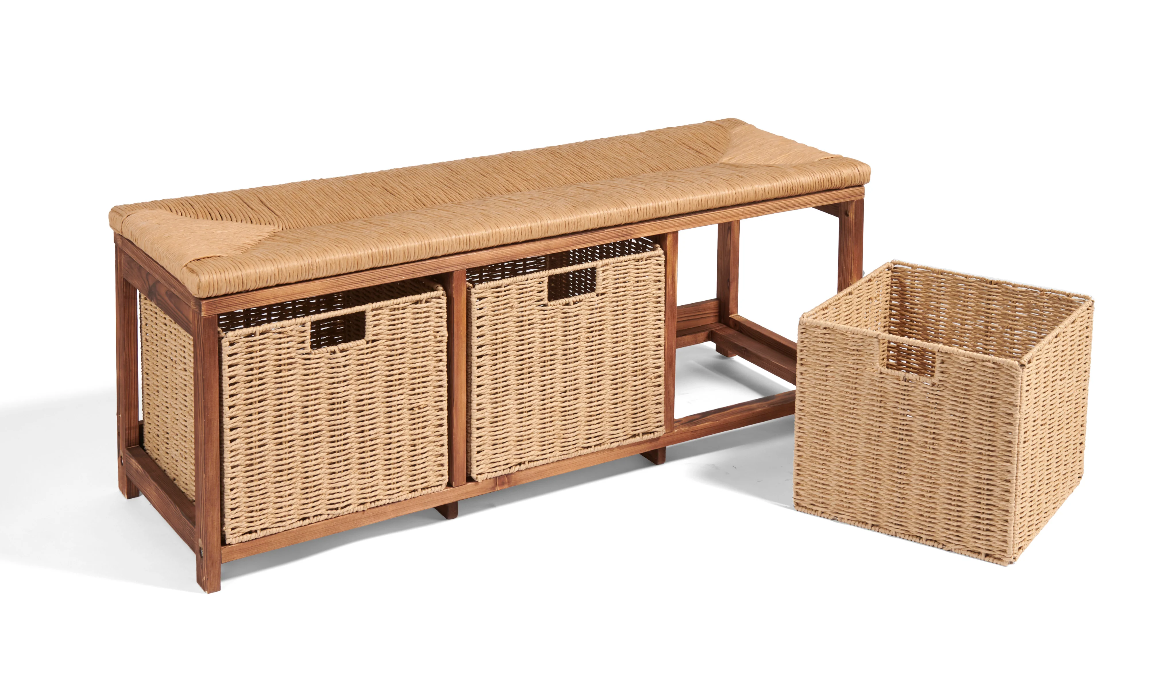 - Badger Basket’s classic Wicker-style Storage Bench includes 3 removable and collapsible storage baskets and a sturdy woven bench top.