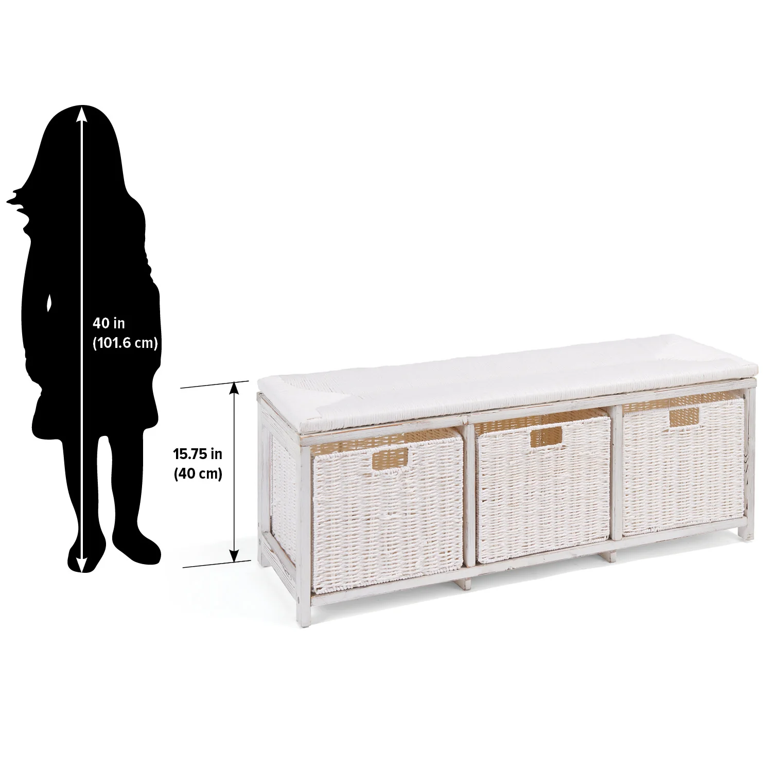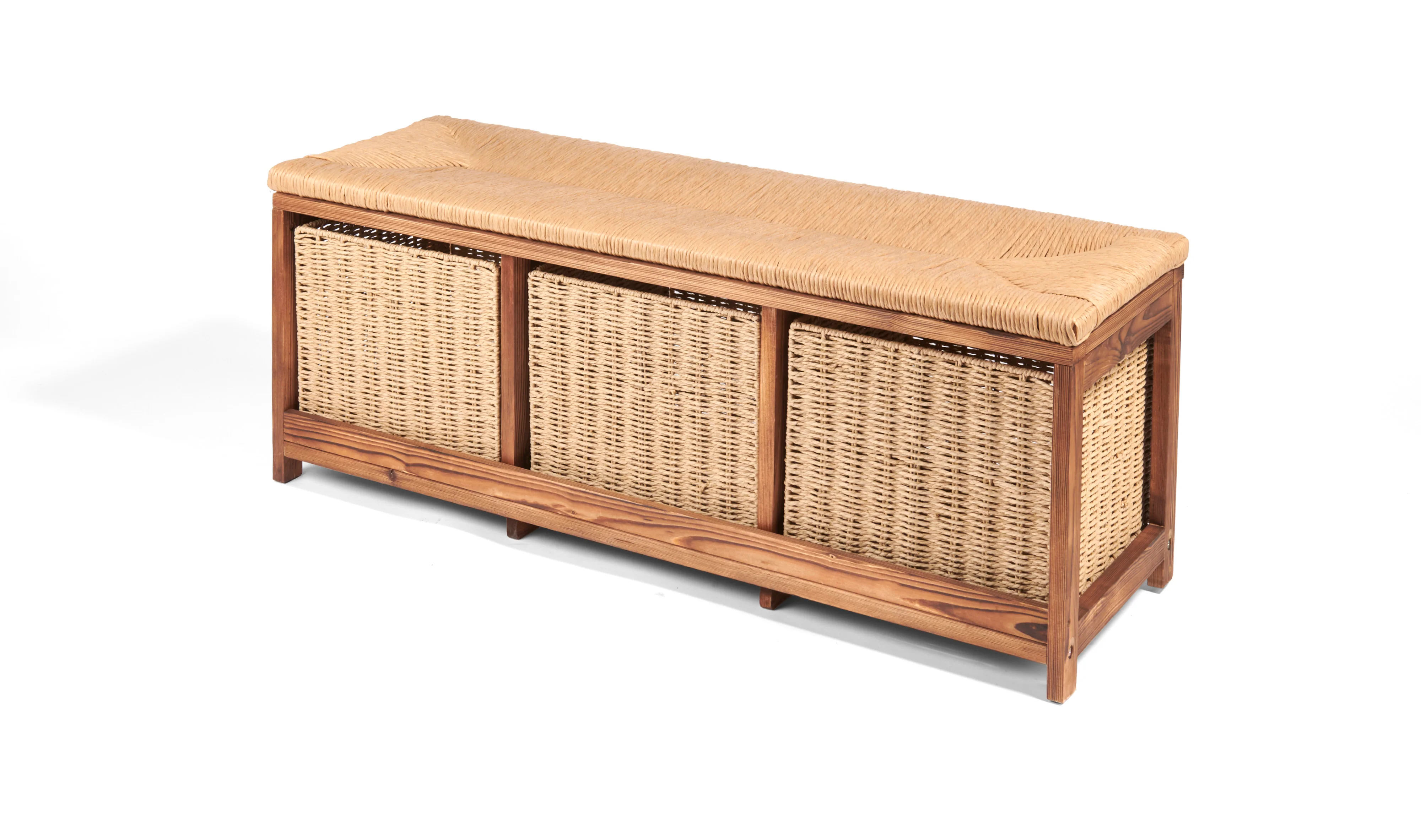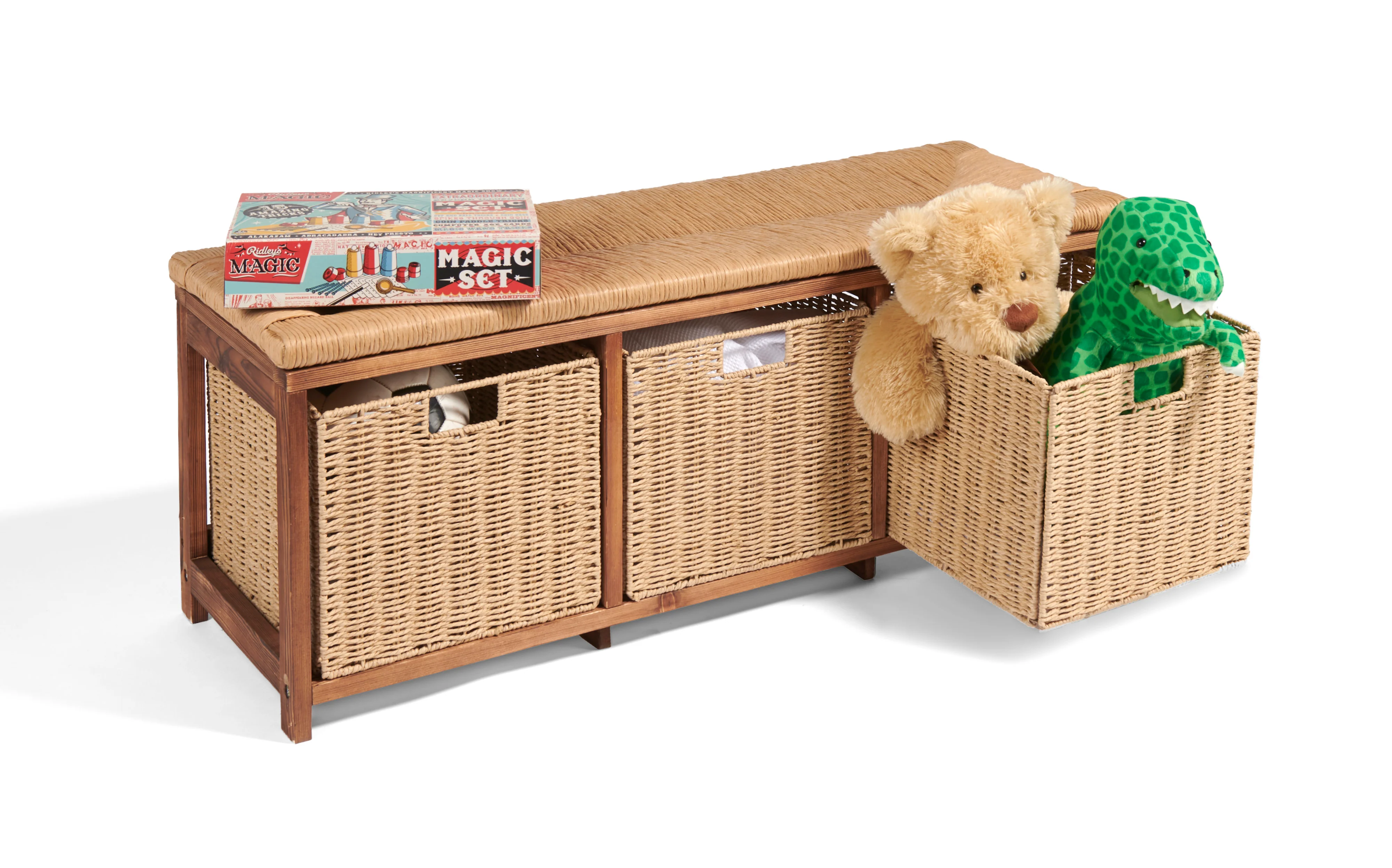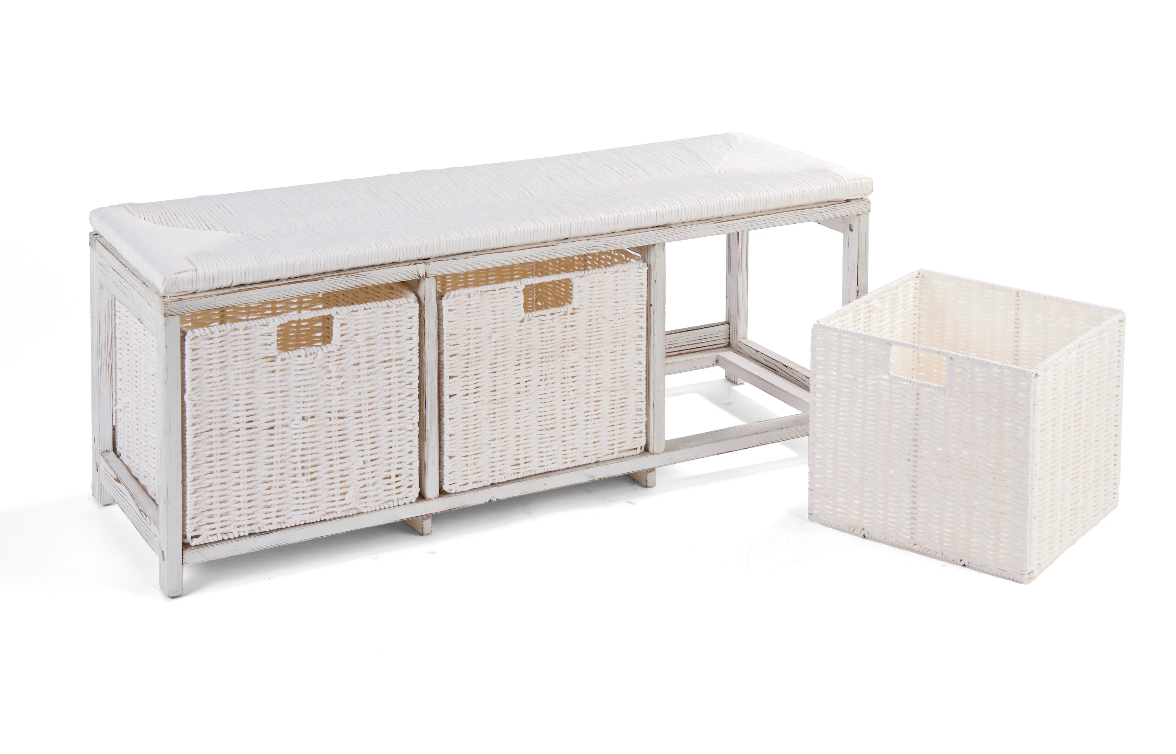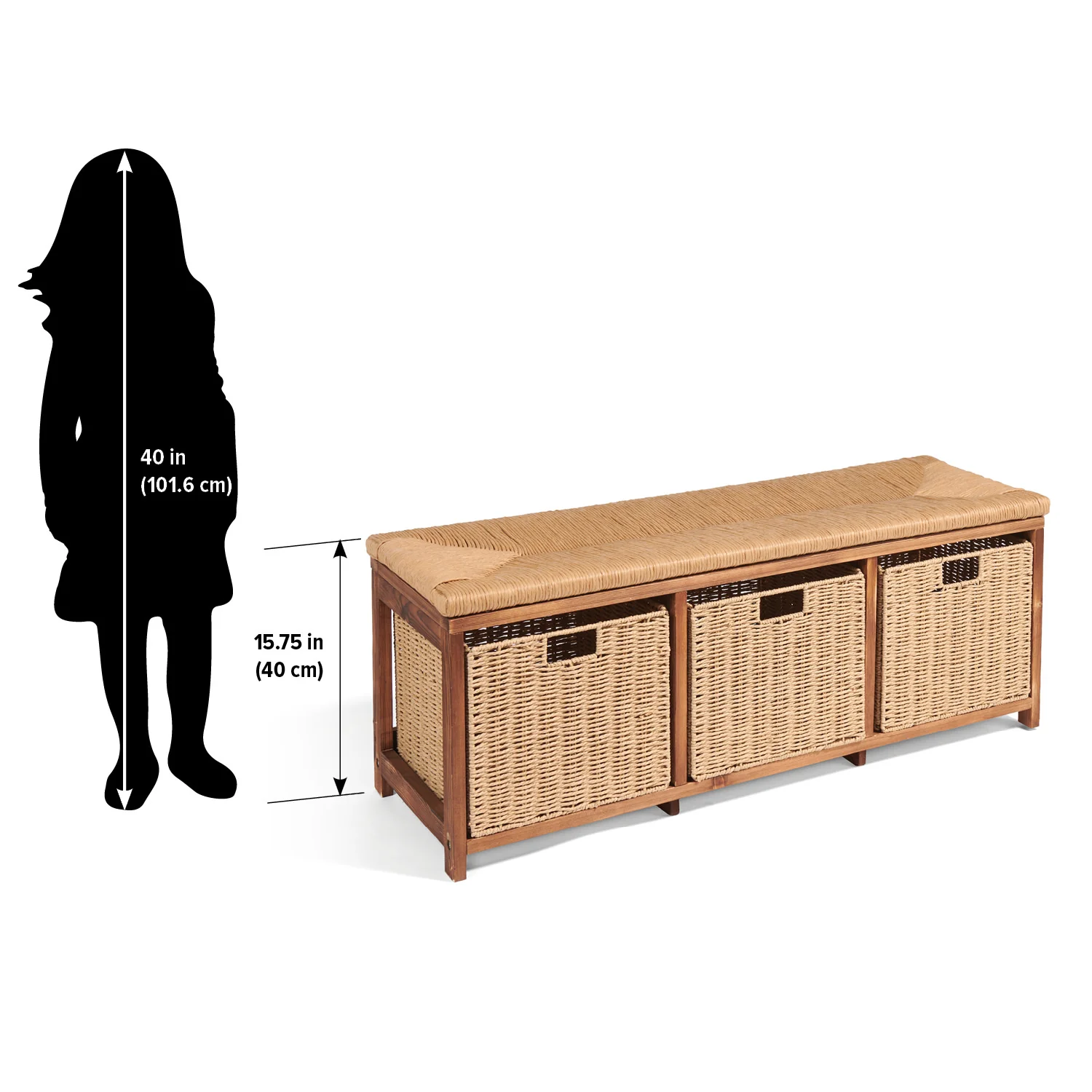 - Badger Basket’s classic Wicker-style Storage Bench includes 3 removable and collapsible storage baskets and a sturdy woven bench top.