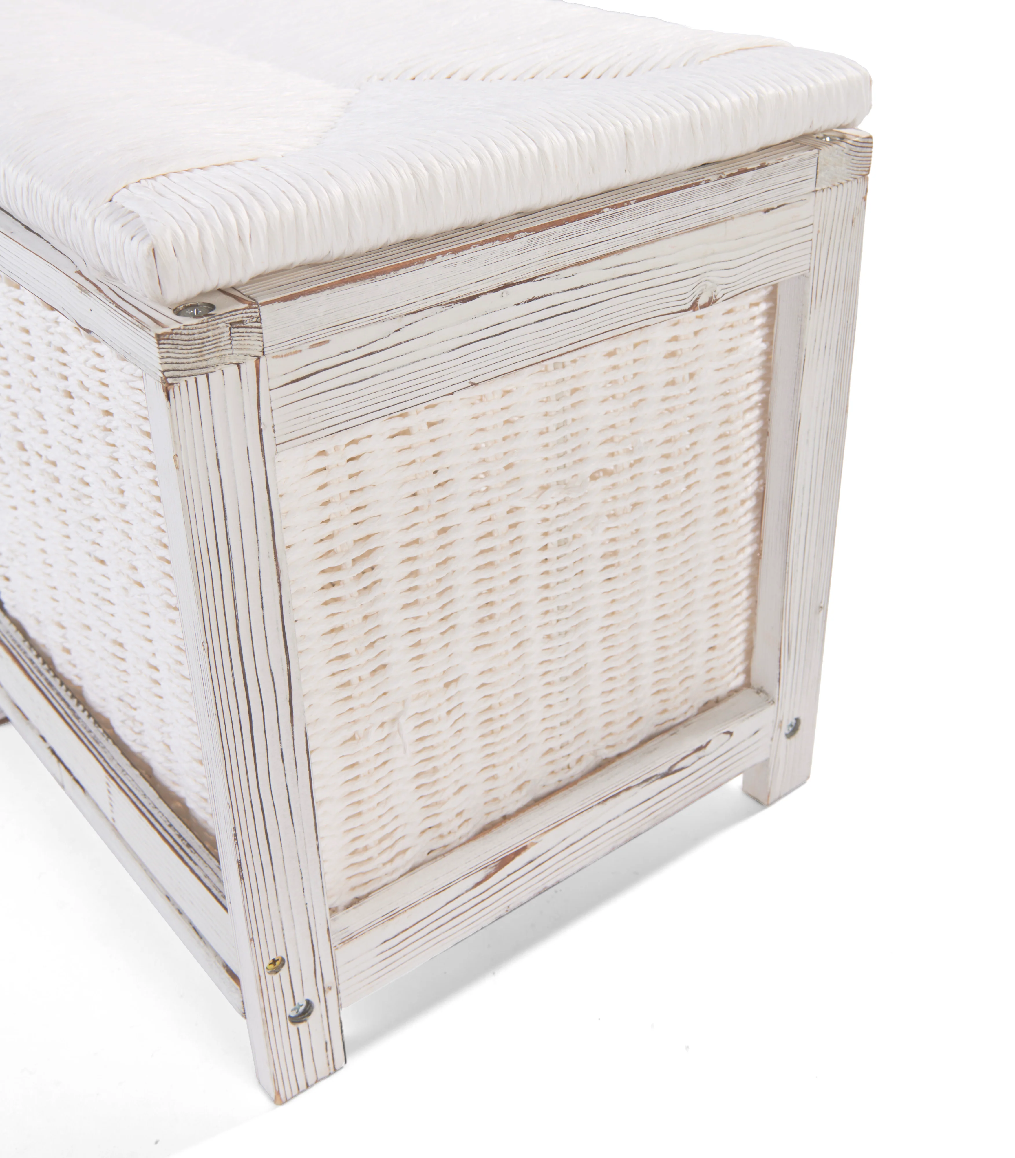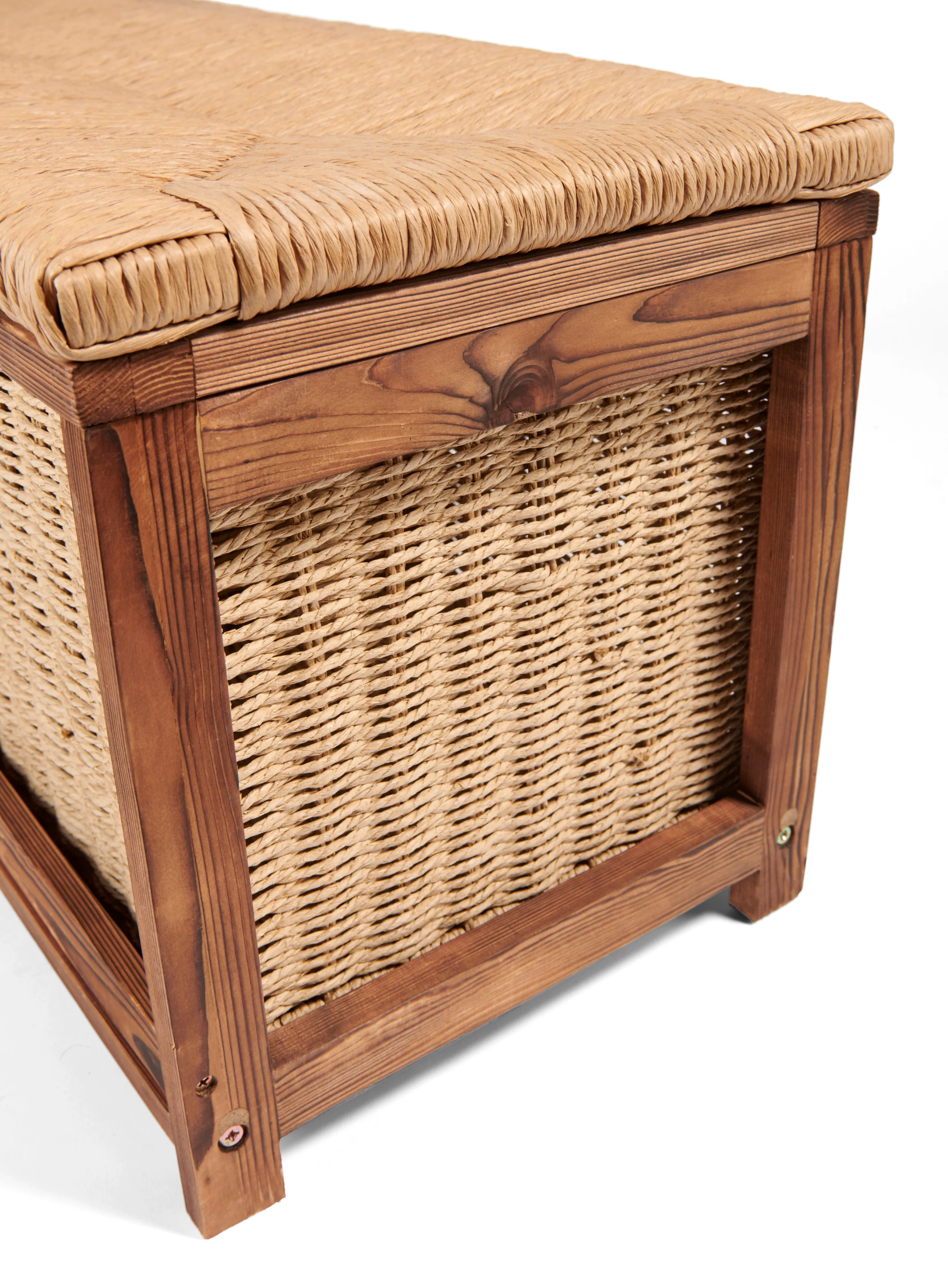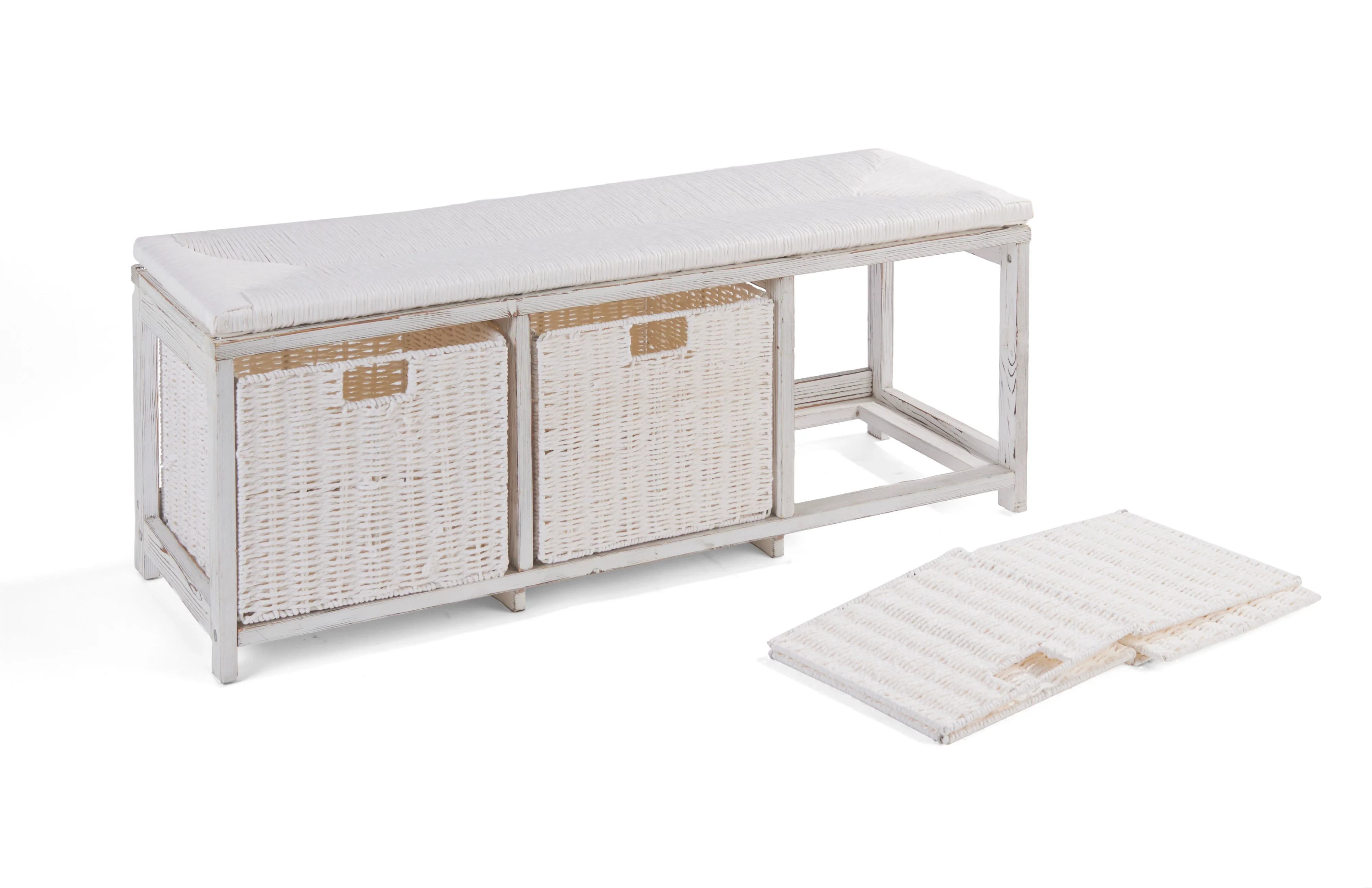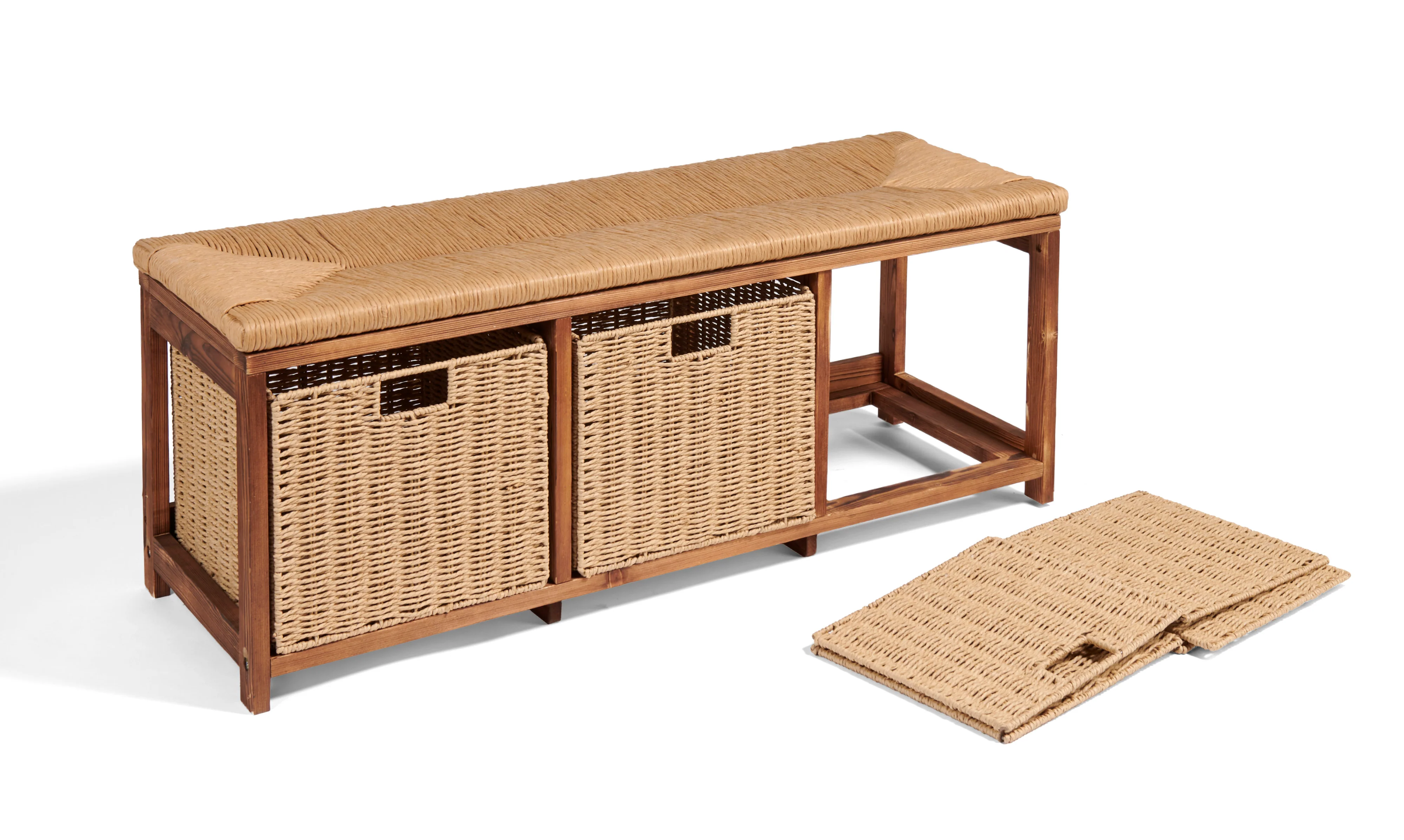 - Badger Basket’s classic Wicker-style Storage Bench includes 3 removable and collapsible storage baskets and a sturdy woven bench top.