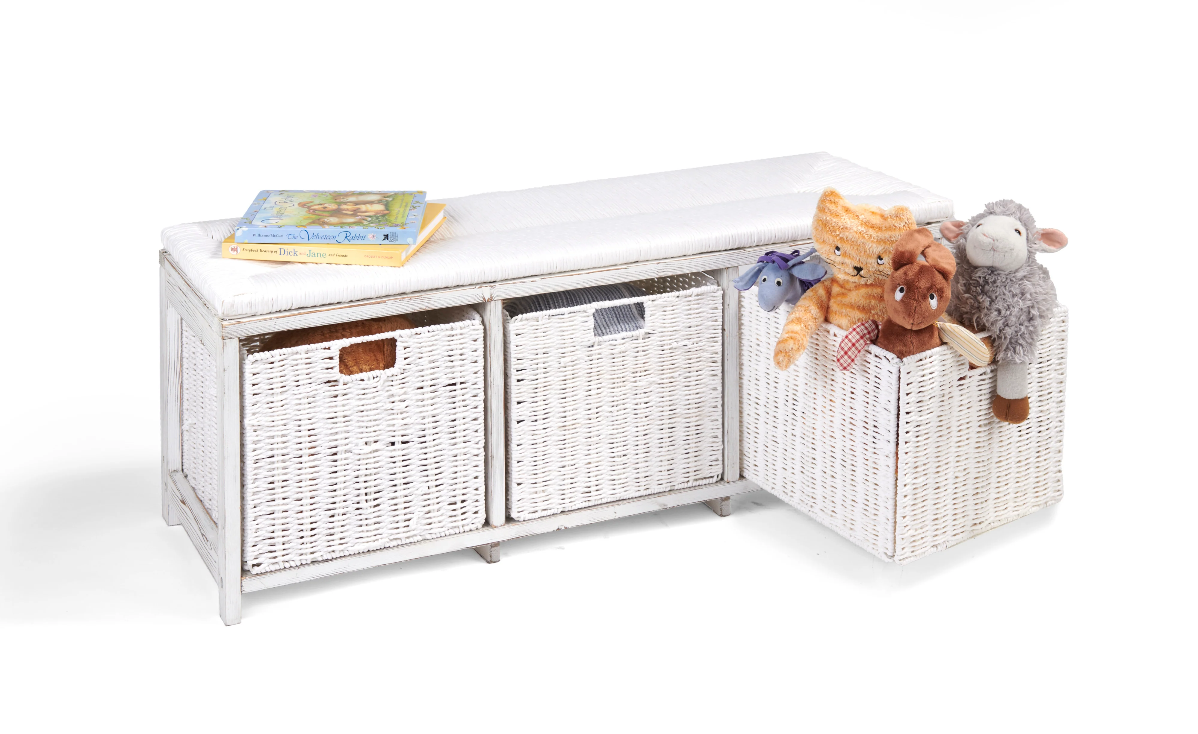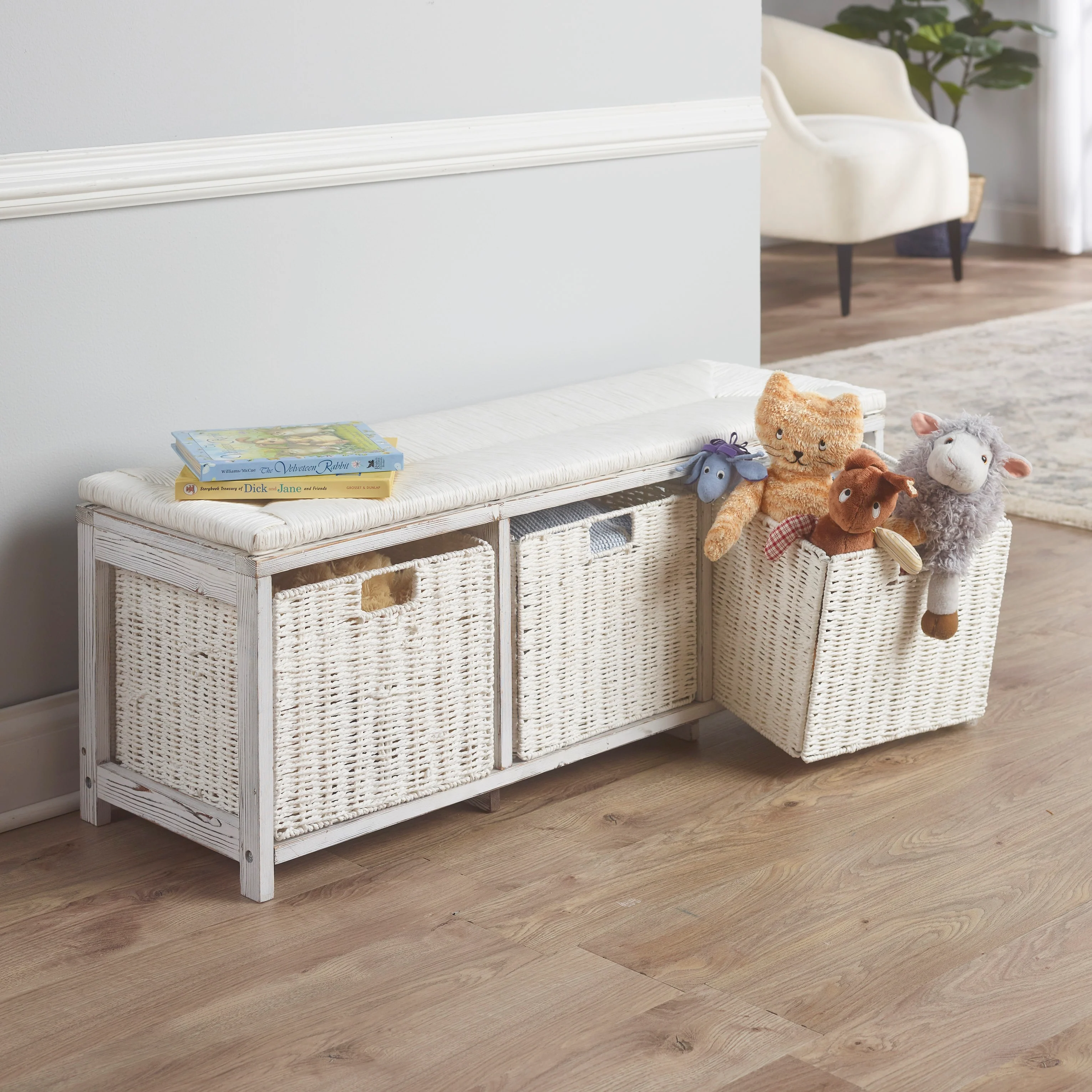 The Kid's Storage Bench by Badger Basket includes 3 removable and collapsible baskets and a sturdy wicker-style bench top. Perfect for toy storage in the playroom, or a bench with shoe storage for the mudroom. The bench supports up to 200 pounds.