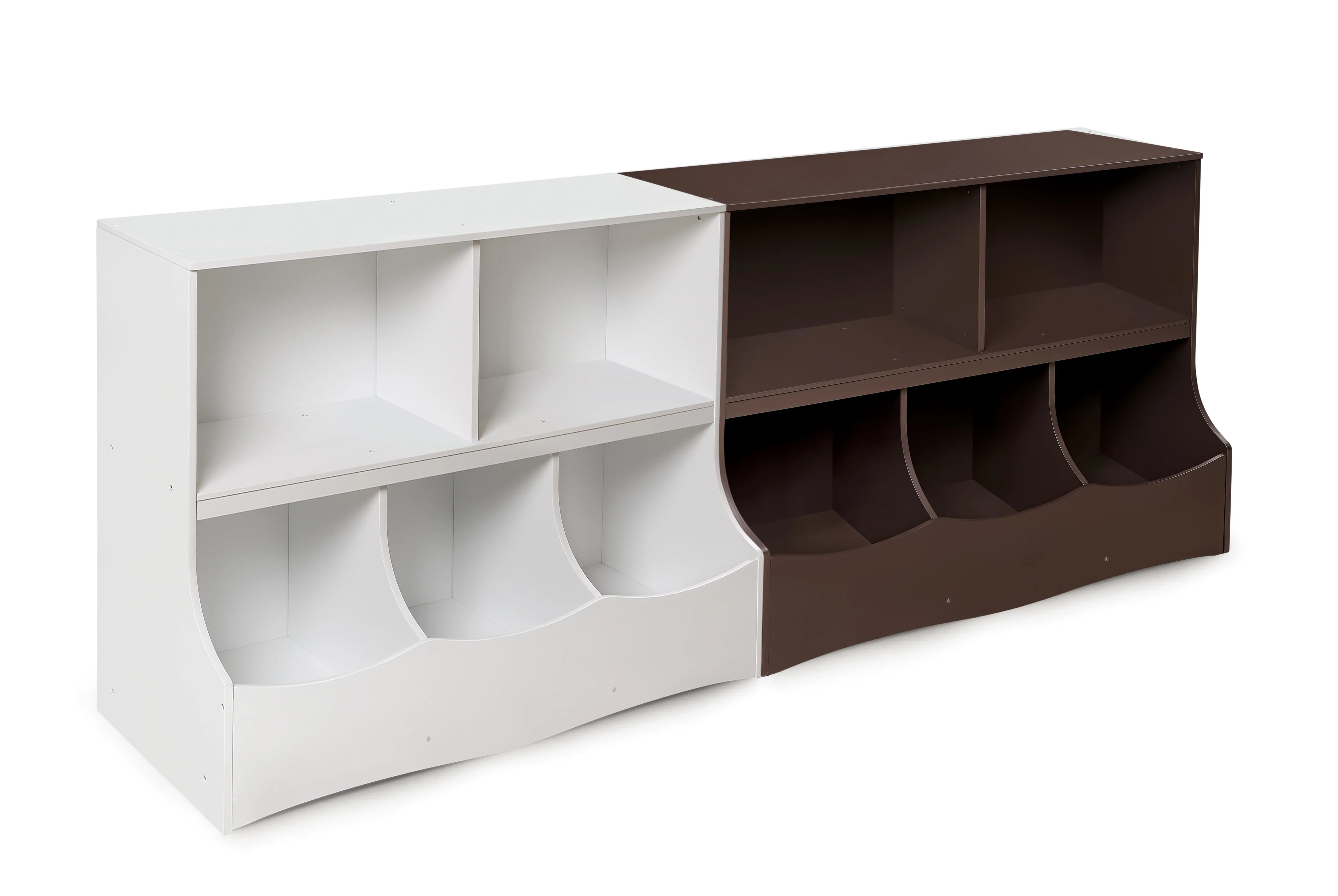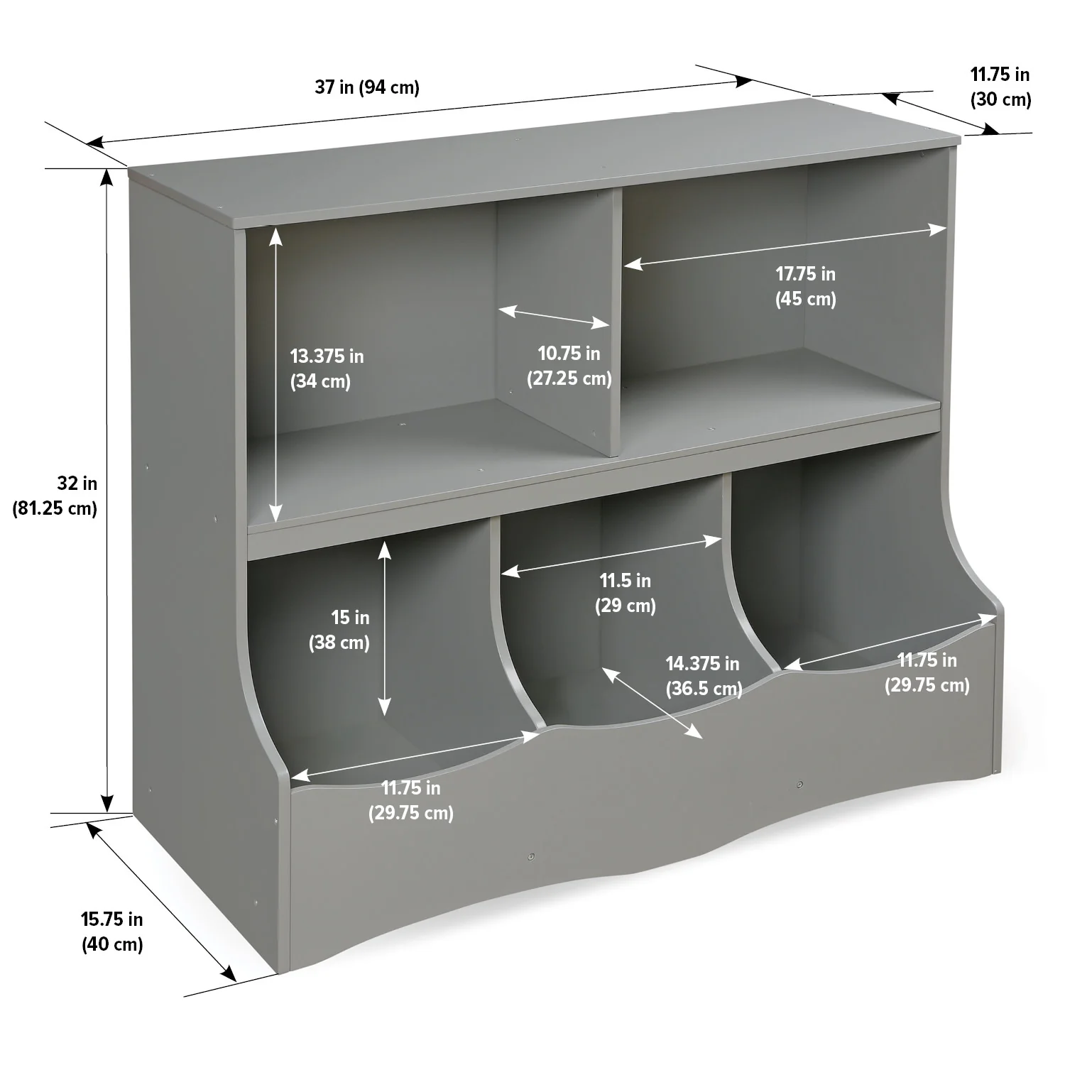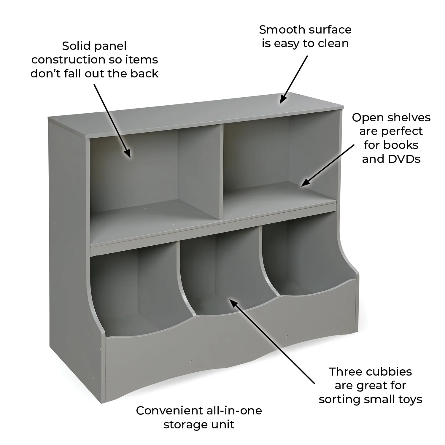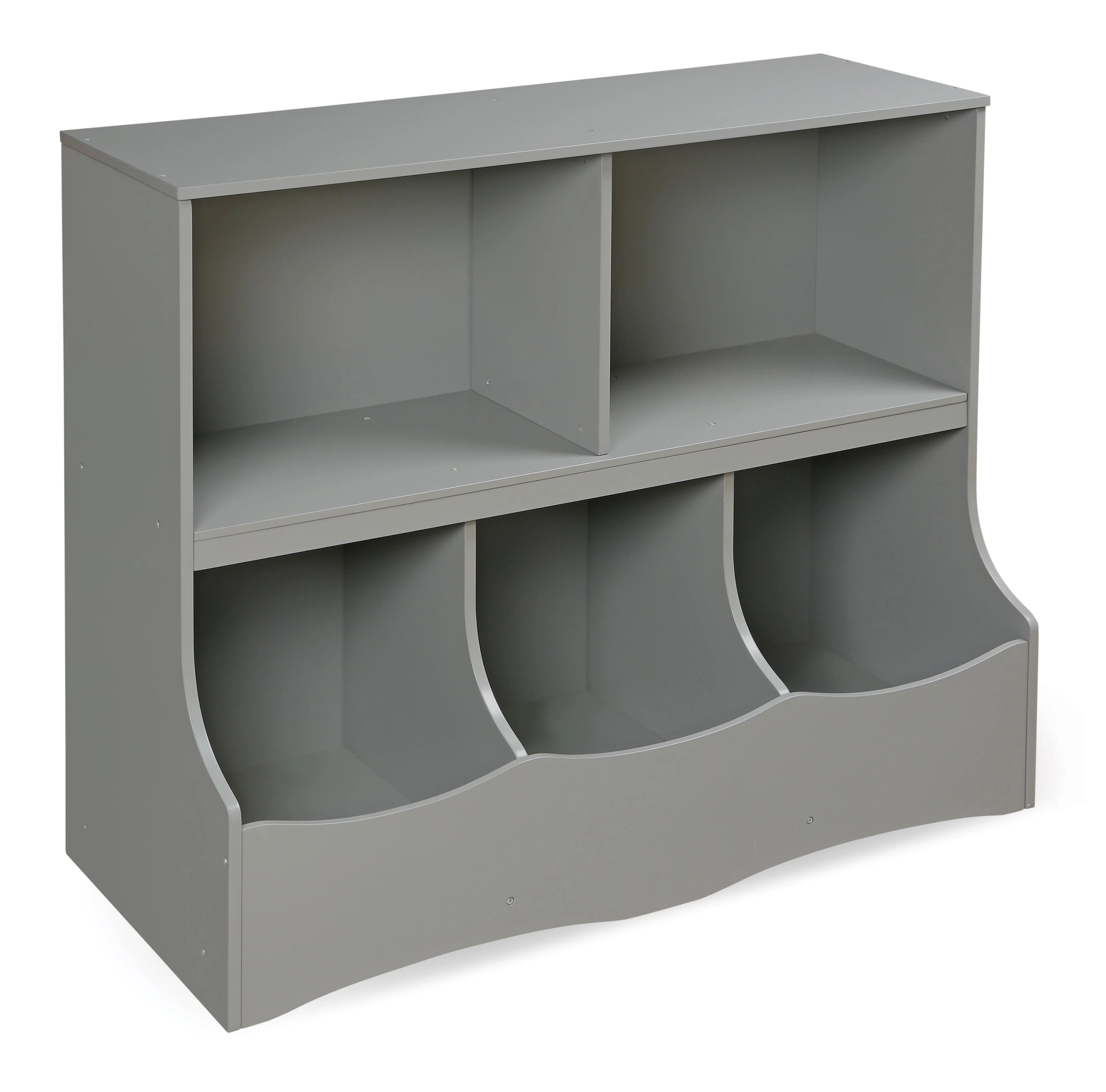 - Features two generously sized open shelves and three cubby bins.