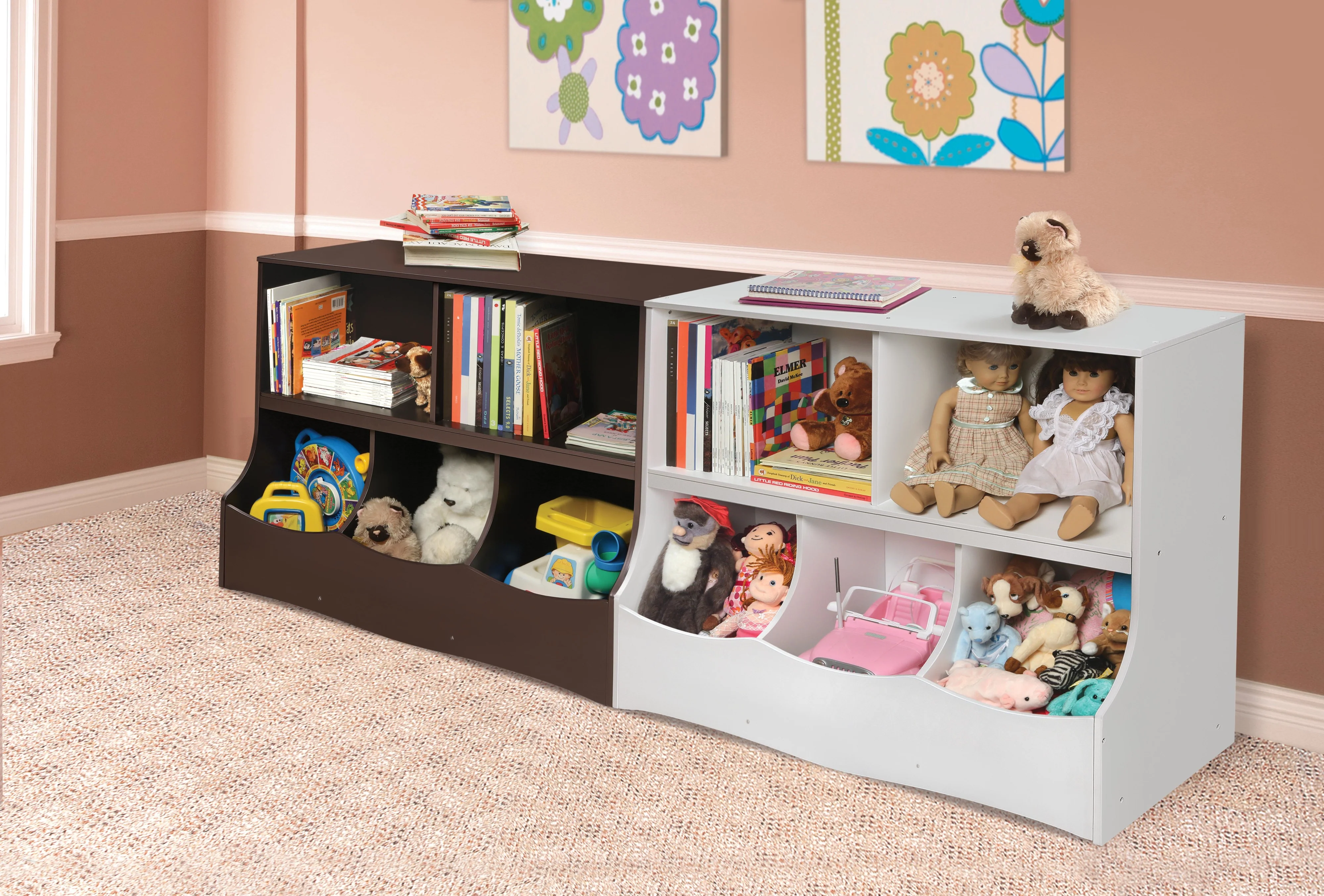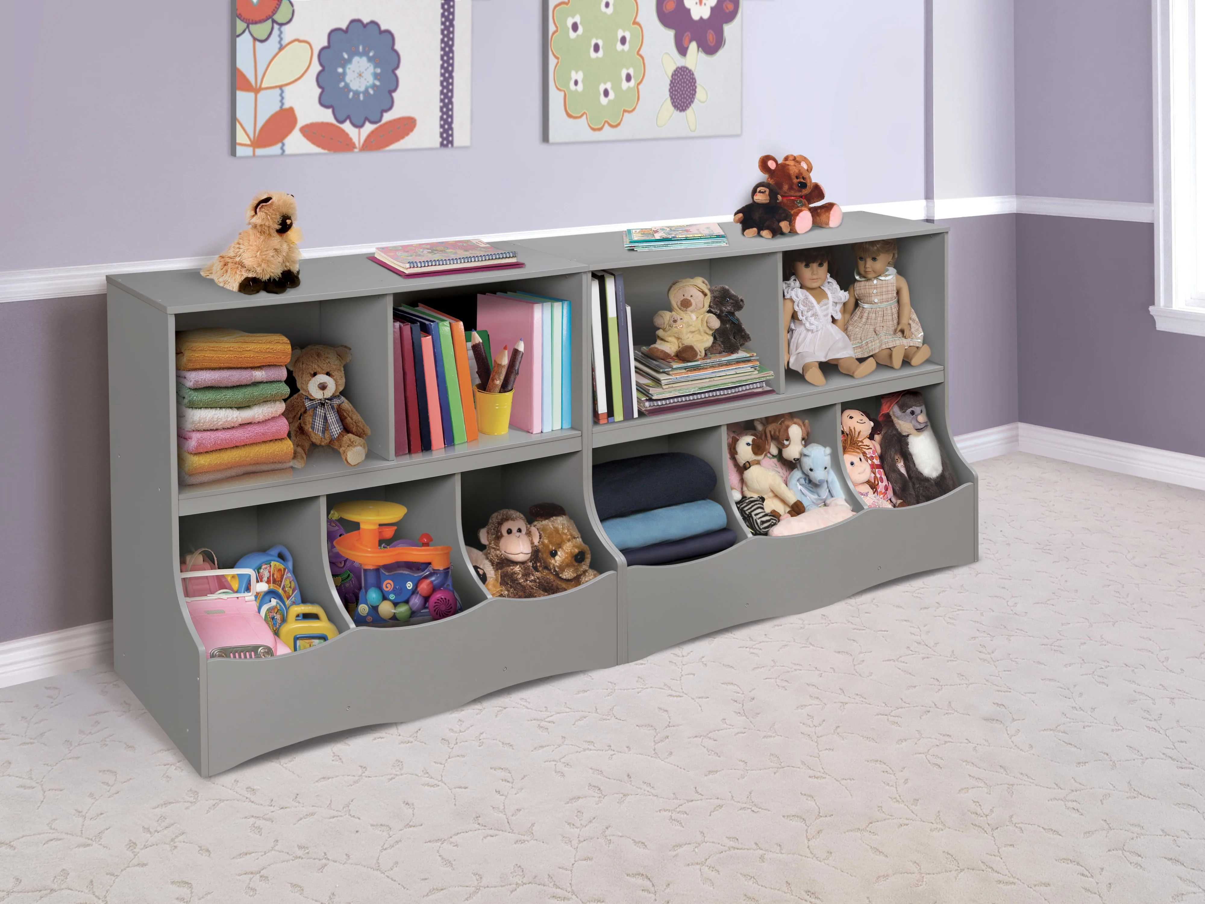 Badger Basket's smart Multi-Bin Storage Cubby controls messy toys, crazy crafts, and disorganized supplies. Gather it all in one unit featuring two open shelves and three cubby bins. A perfect size for nursery, child's room, foyer or family room.