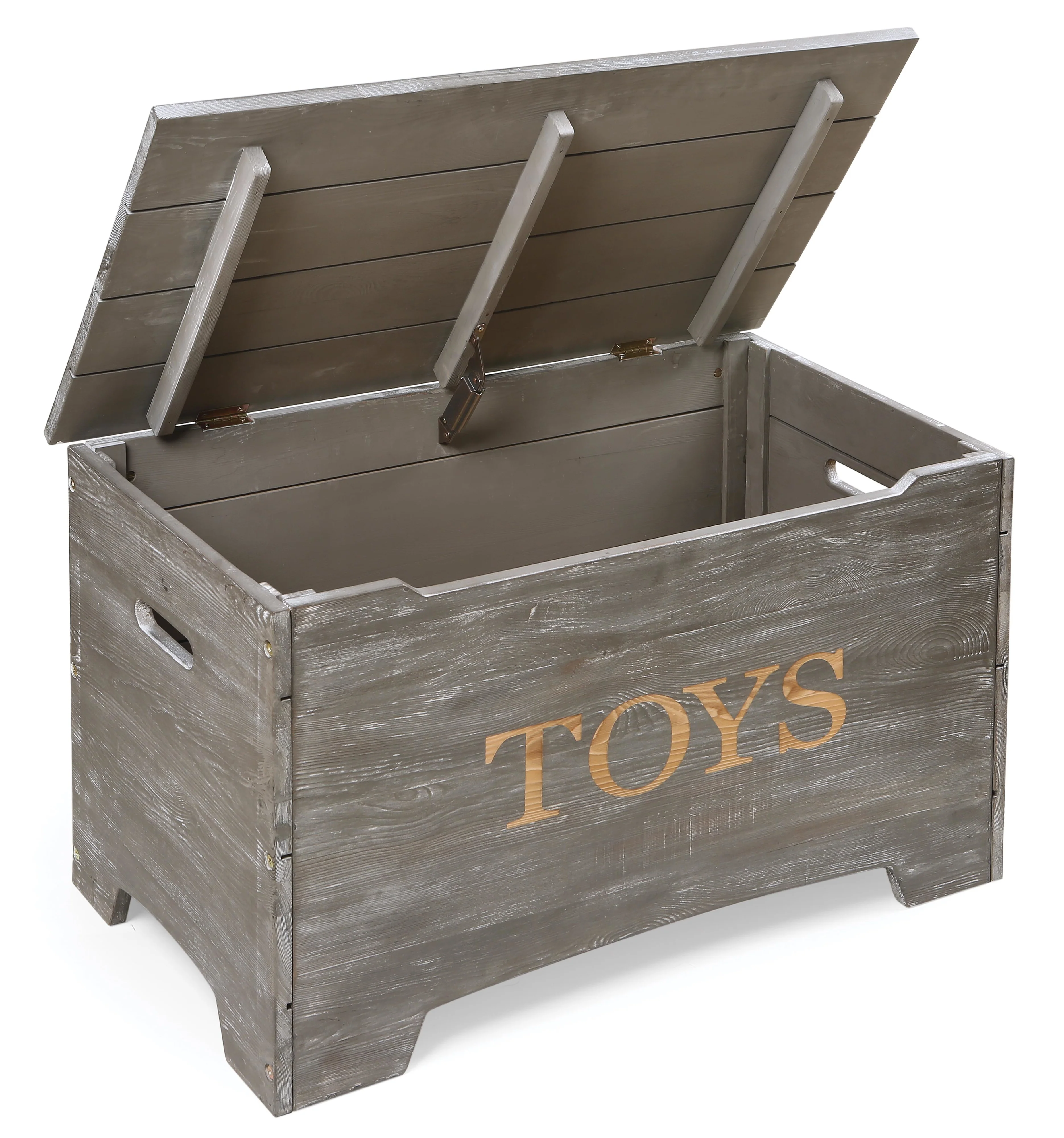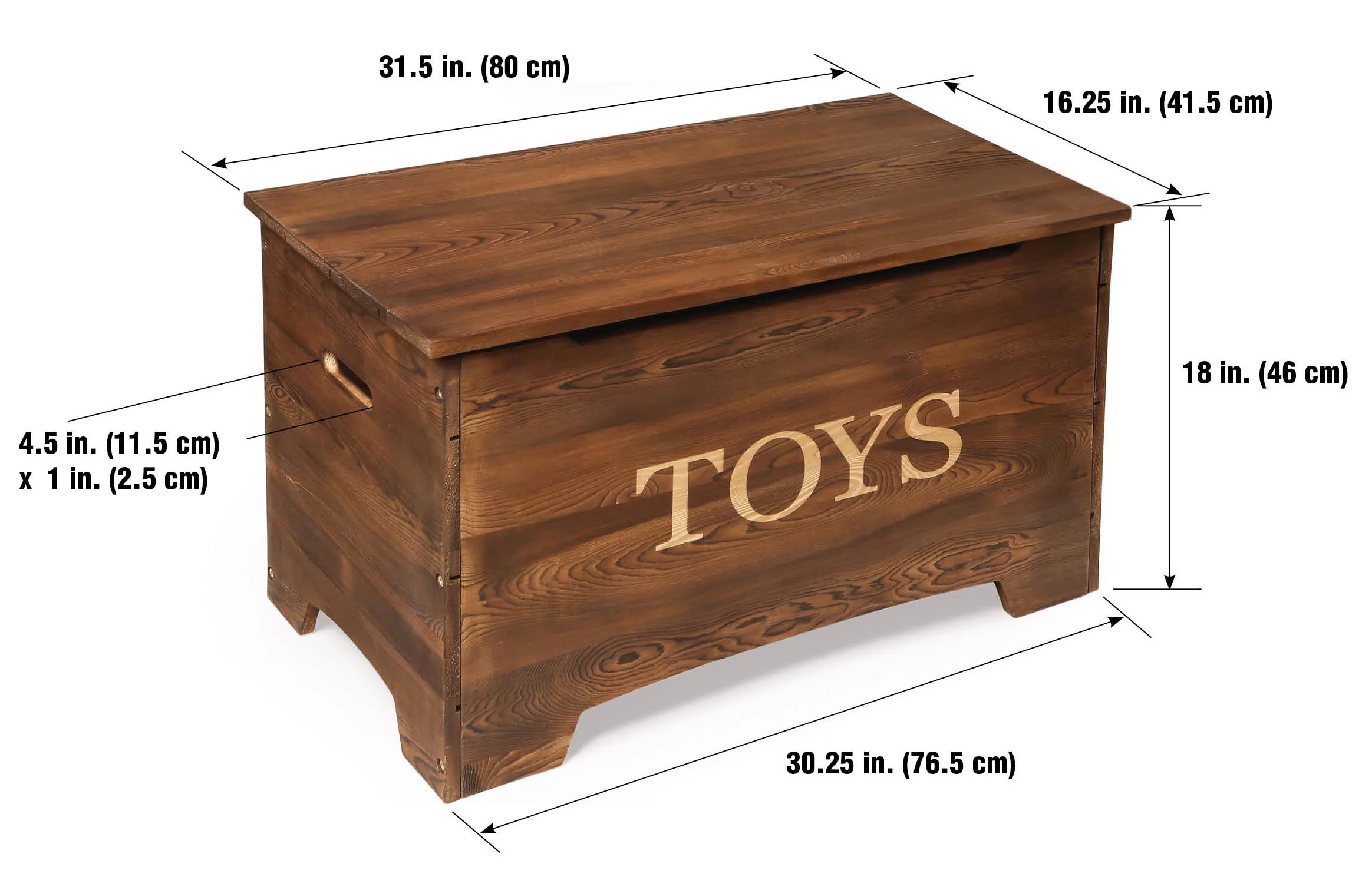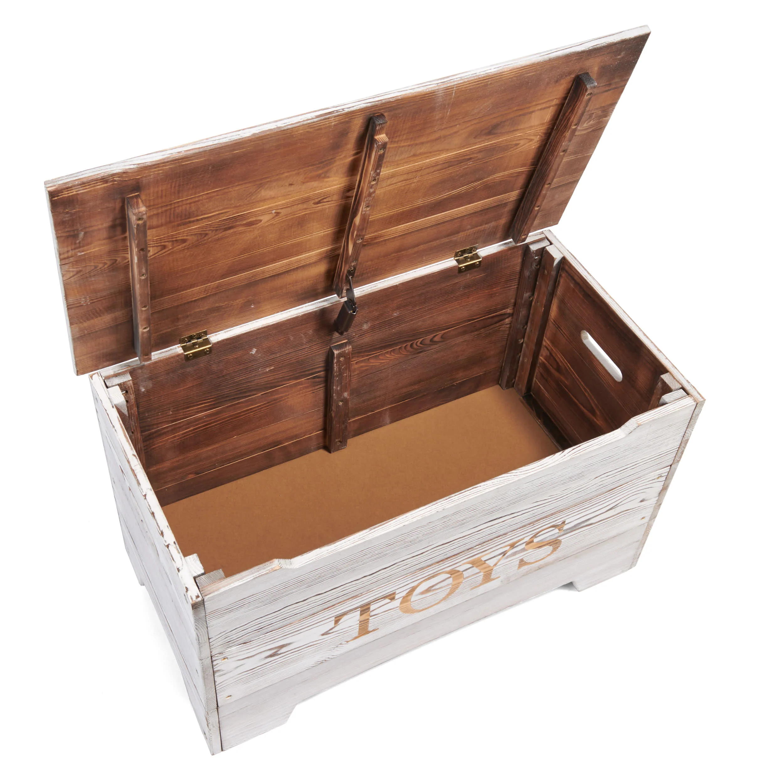 - Bold TOYS lettering engraved on the front exposes the plain wood for a contrasting, two-tone effect.