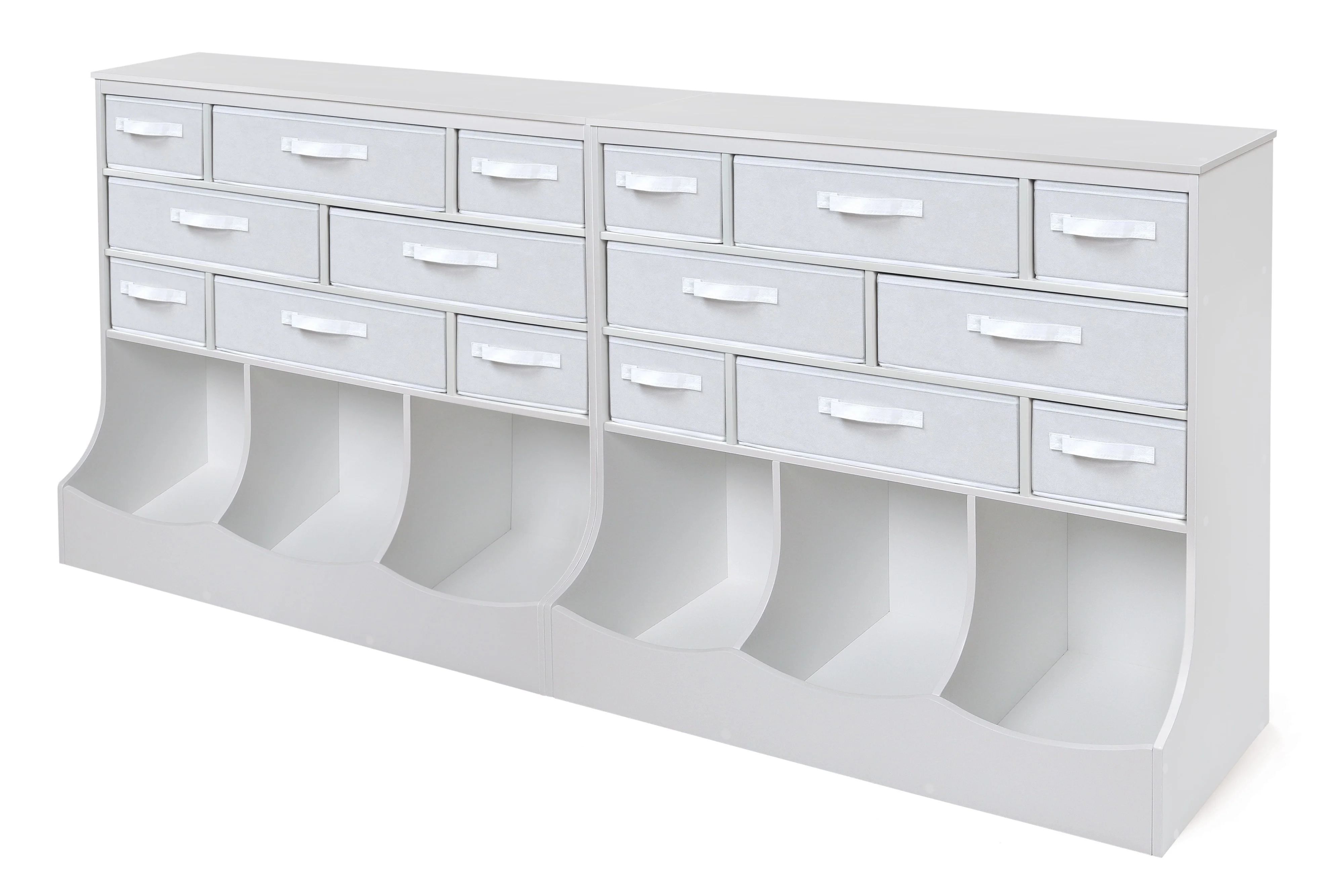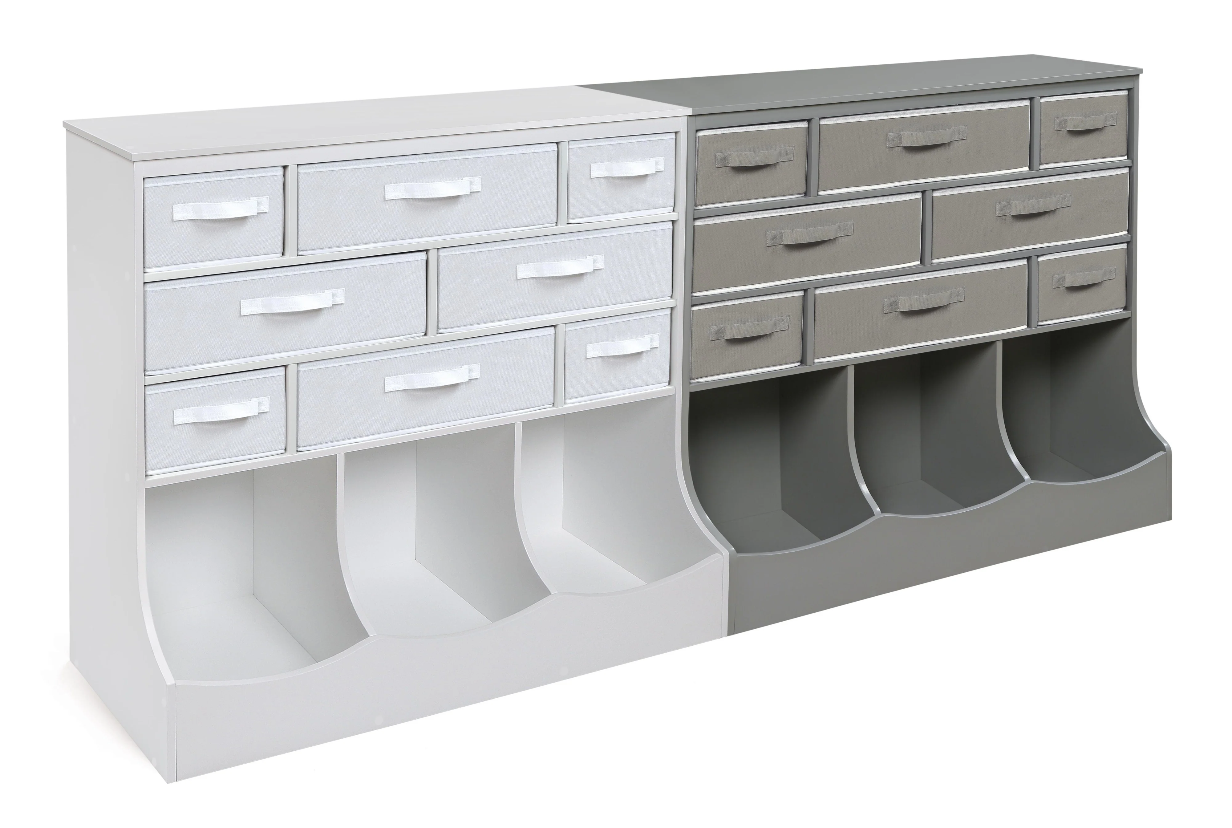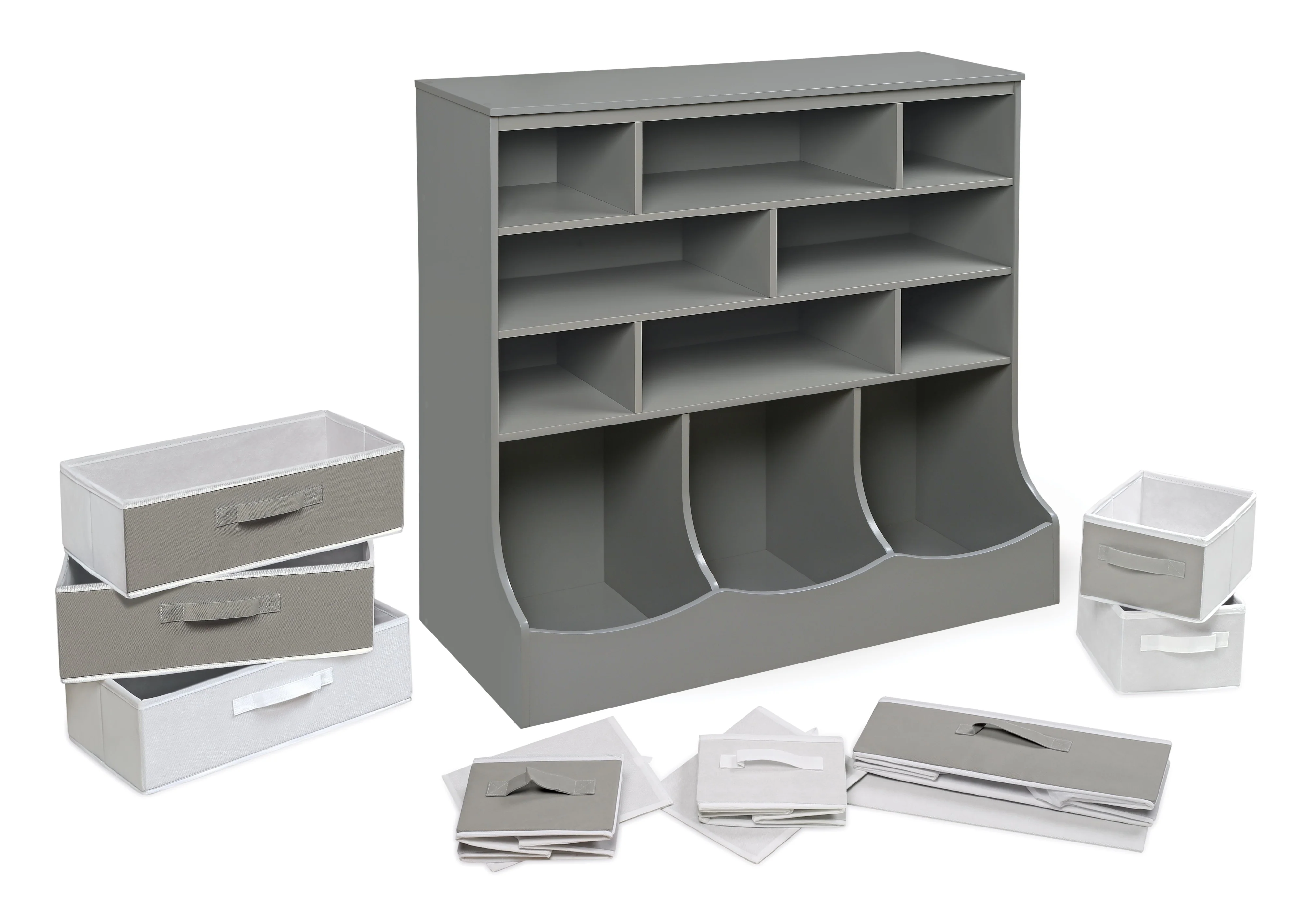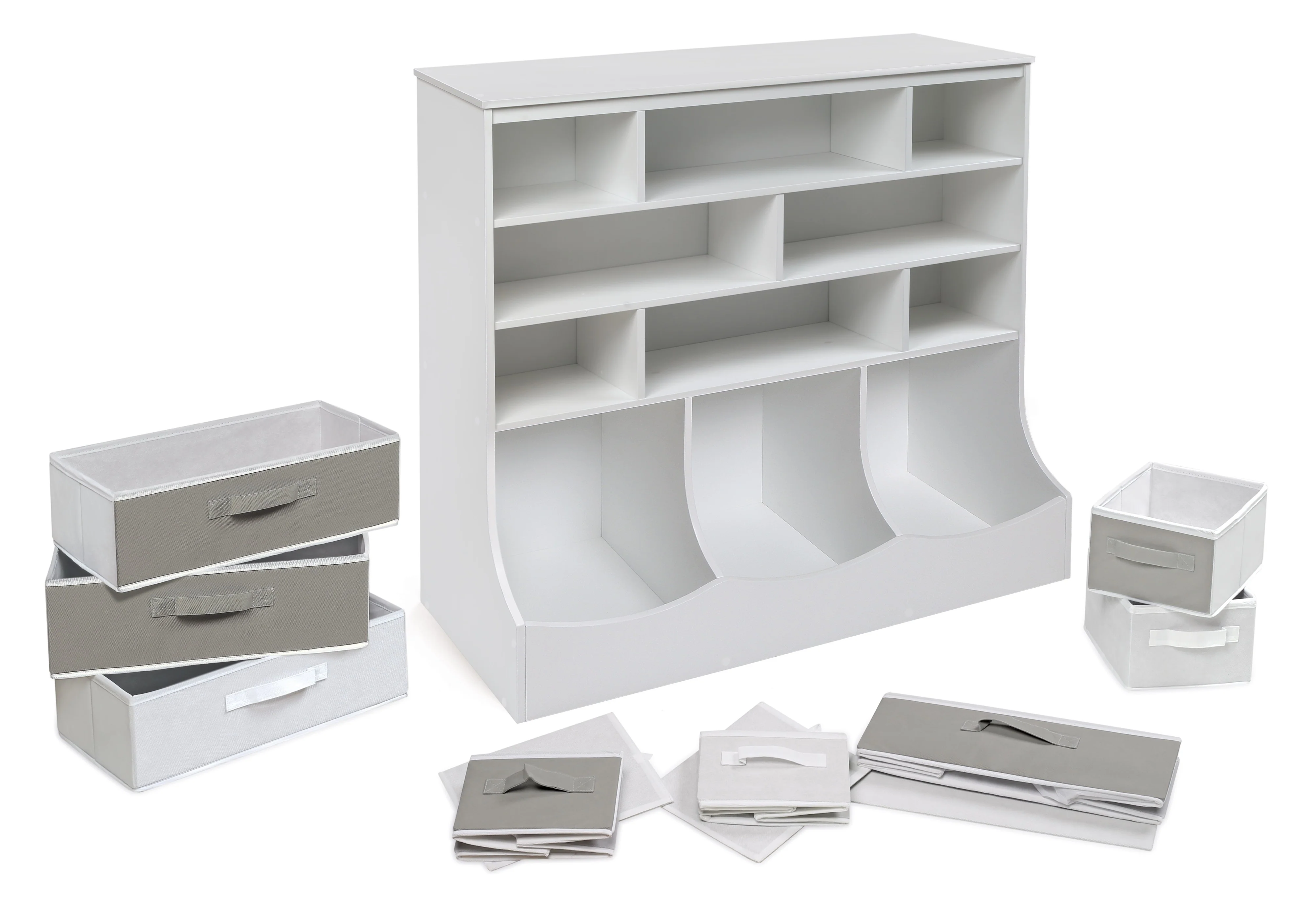 - Two-color baskets can be reversed to customize the look! You may choose not to use the baskets and instead have open cubbies. Or, remove the large baskets, and fit two of the smaller baskets in the large cubbies! There are endless combinations to suit your storage needs.