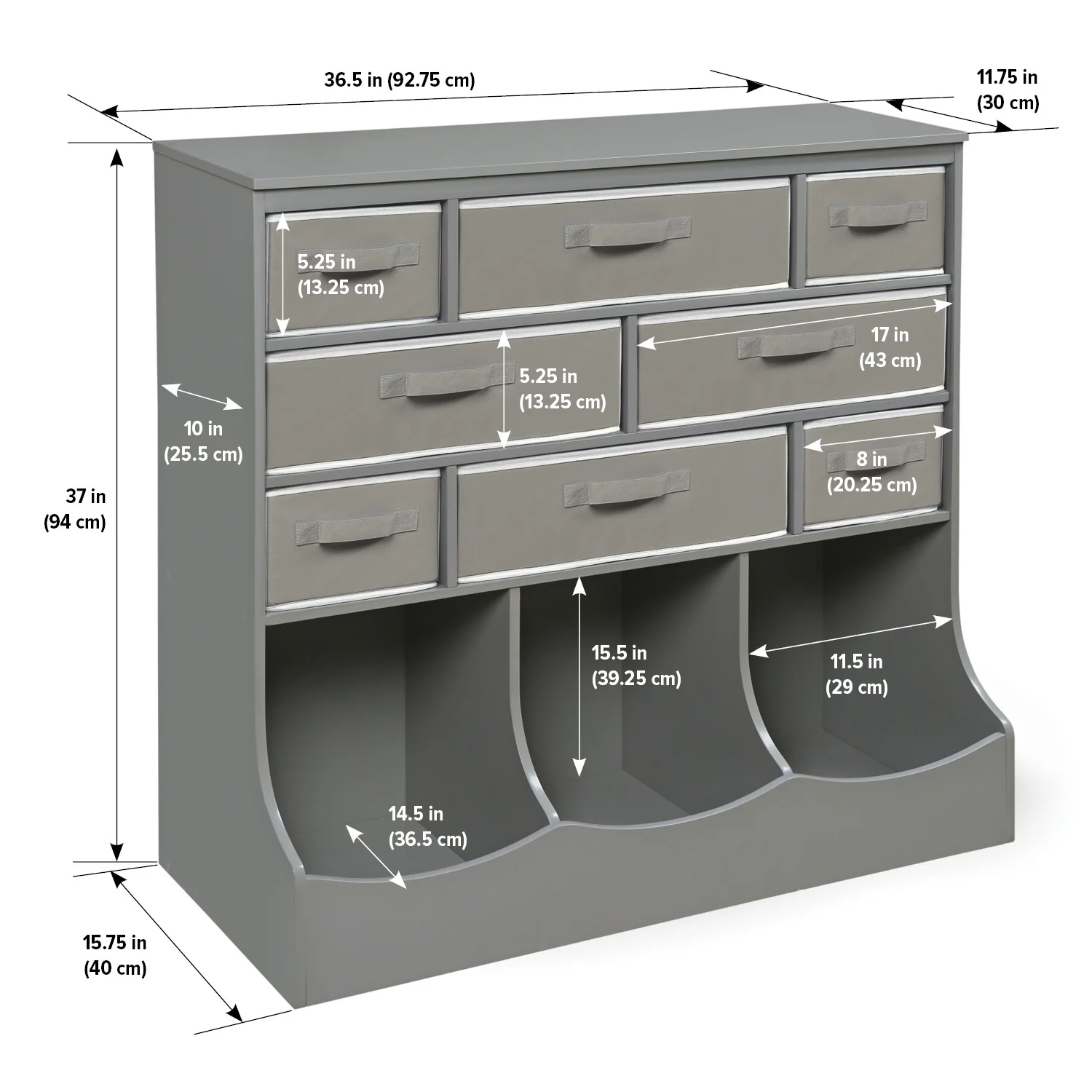 - Storage Bins: 11.5 inches L x 14.25 inches W x 15.5 inches H.