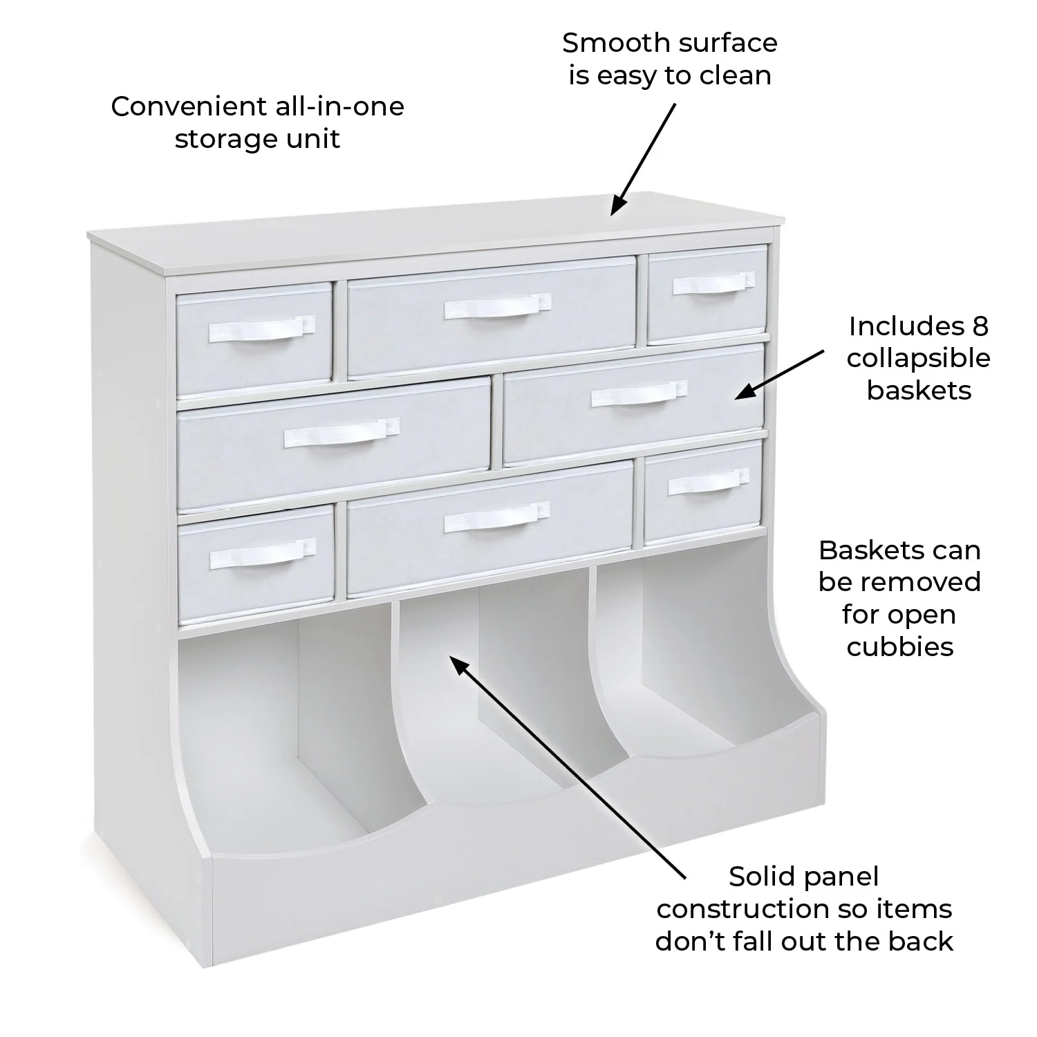 - Corral and conceal numerous items in the four large and four small removable and reversible baskets.