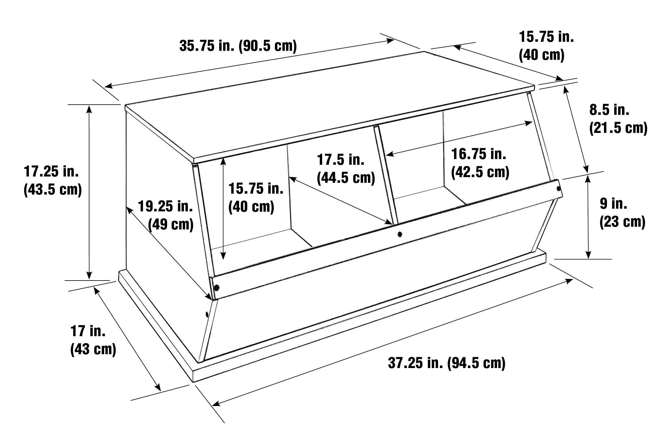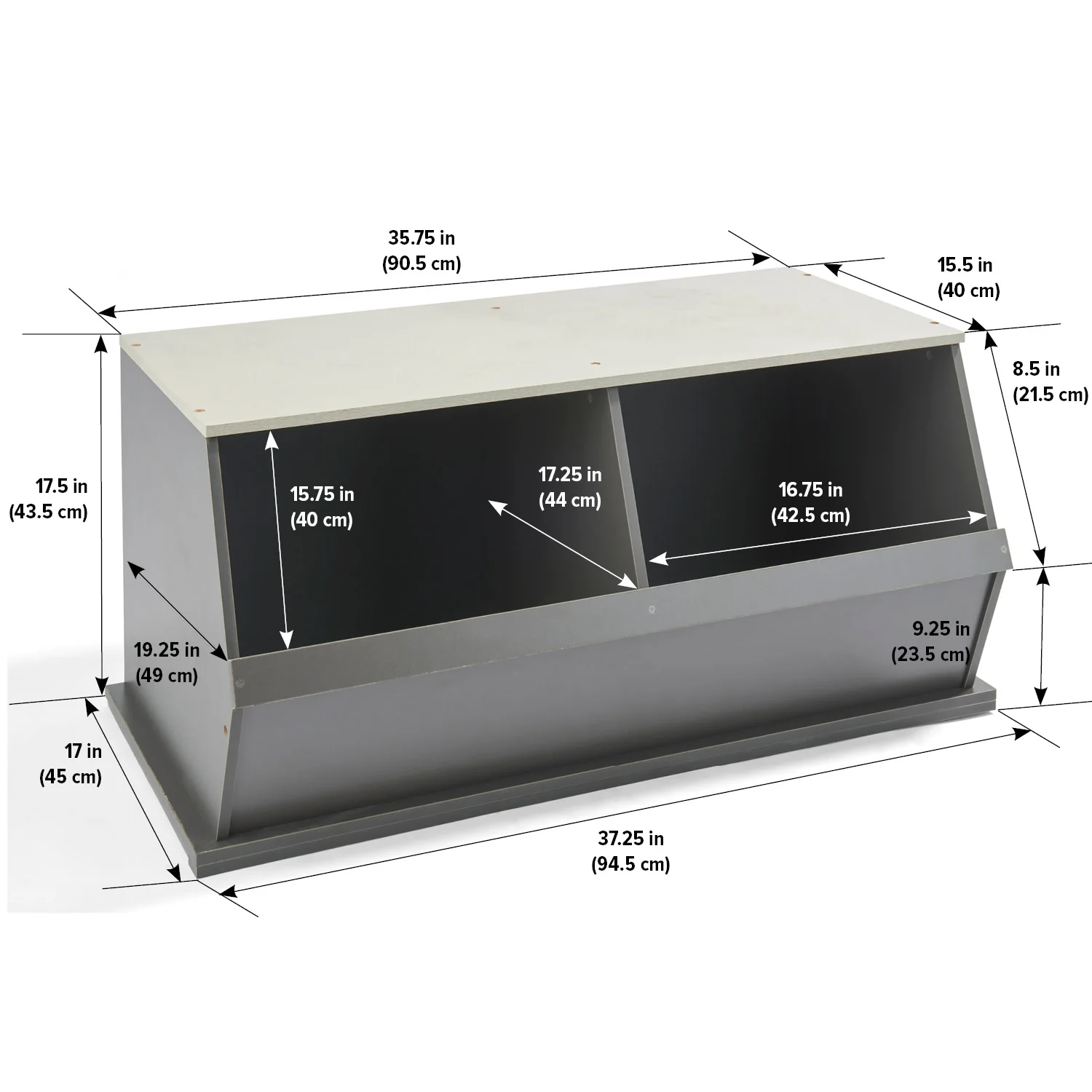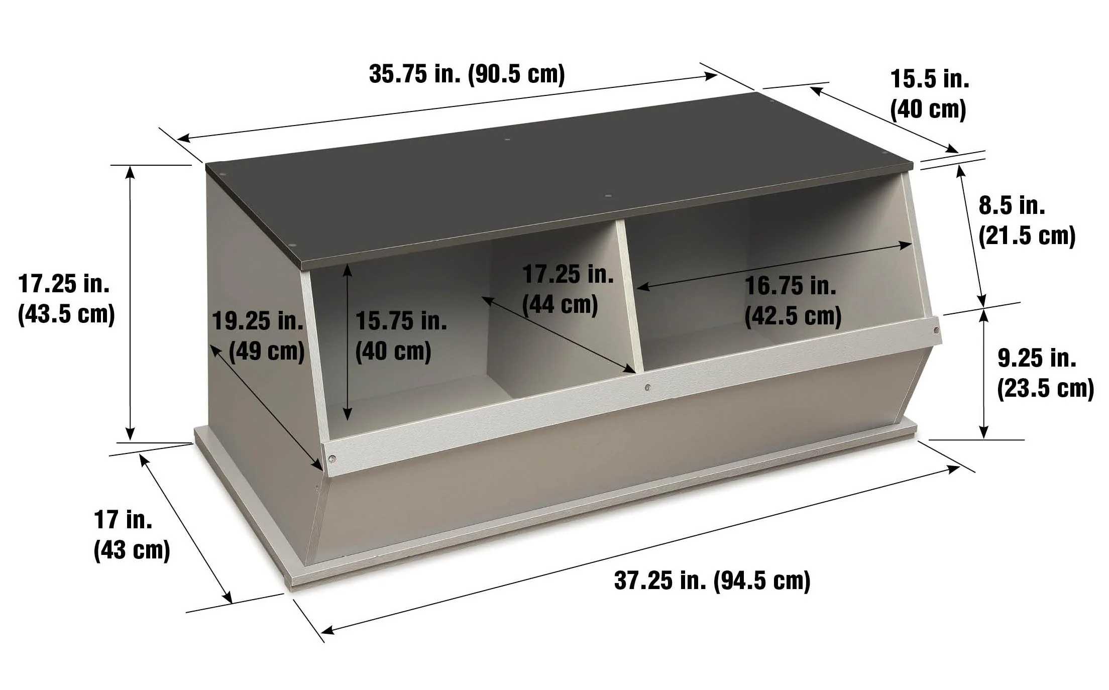 - Smooth surfaces are easy to maintain. Badger Basket's Two-Bin units mix and match with Badger's Three-Bin units and Badger's Shelf Storage units. Made with engineered wood. Overall unit measures approximately 37.25 inches L x 19.25 inches W x 17.125 inches H.