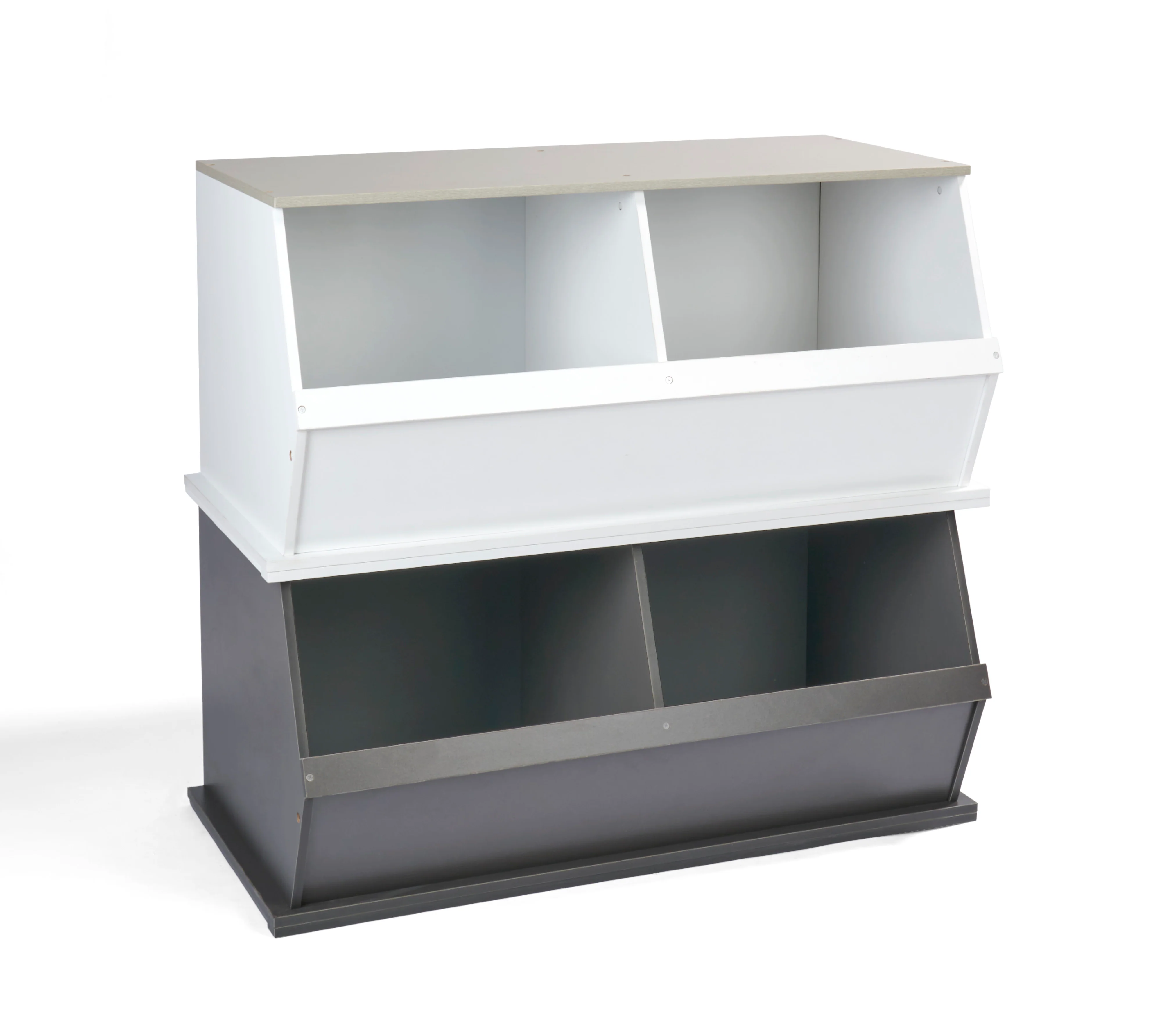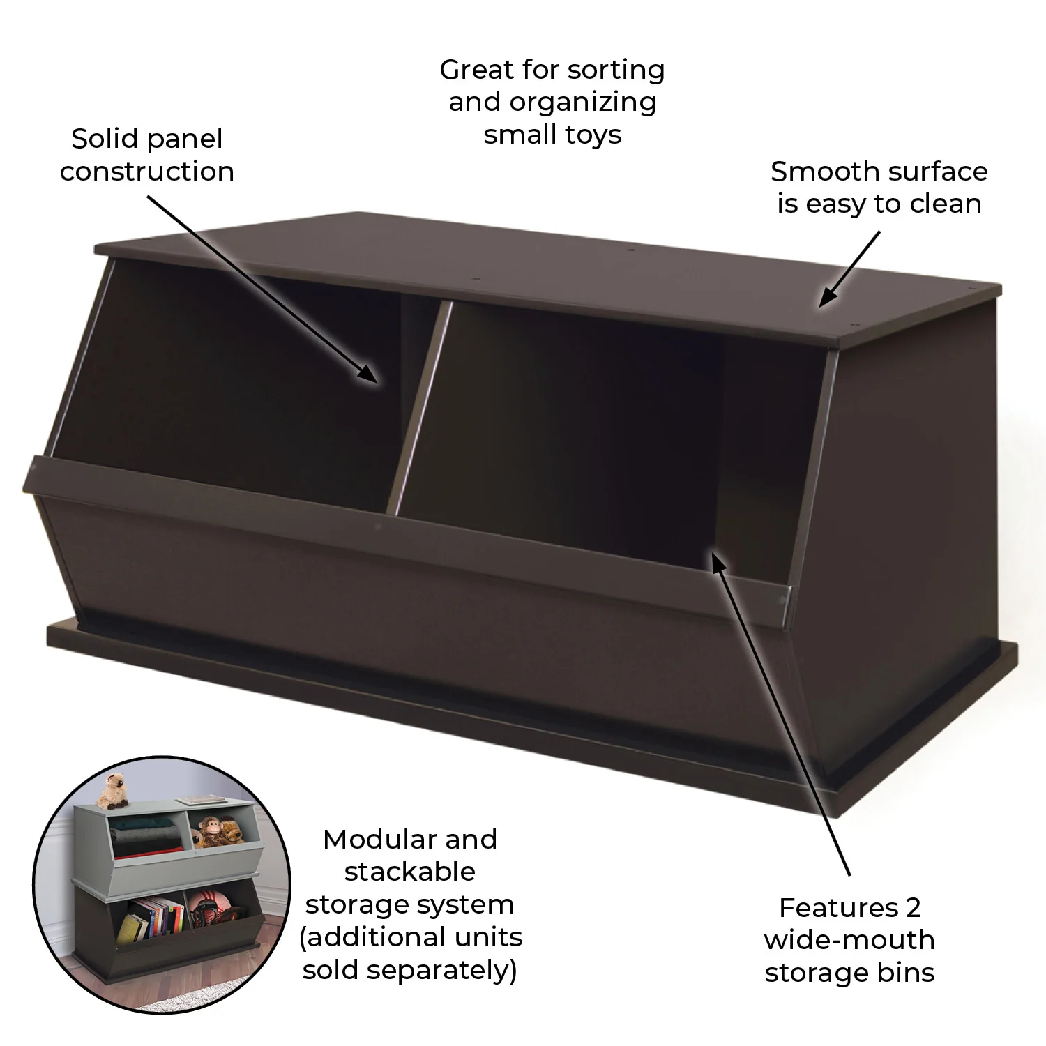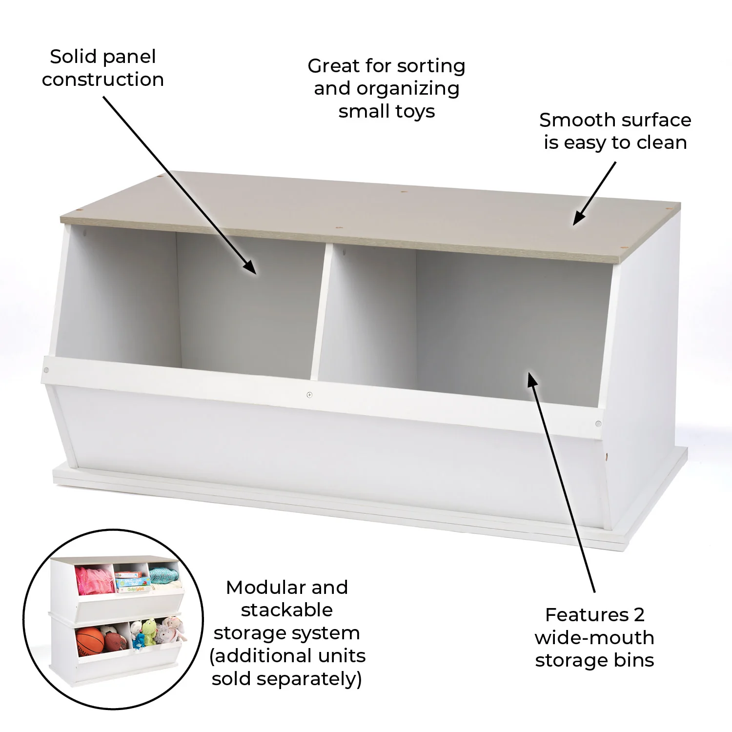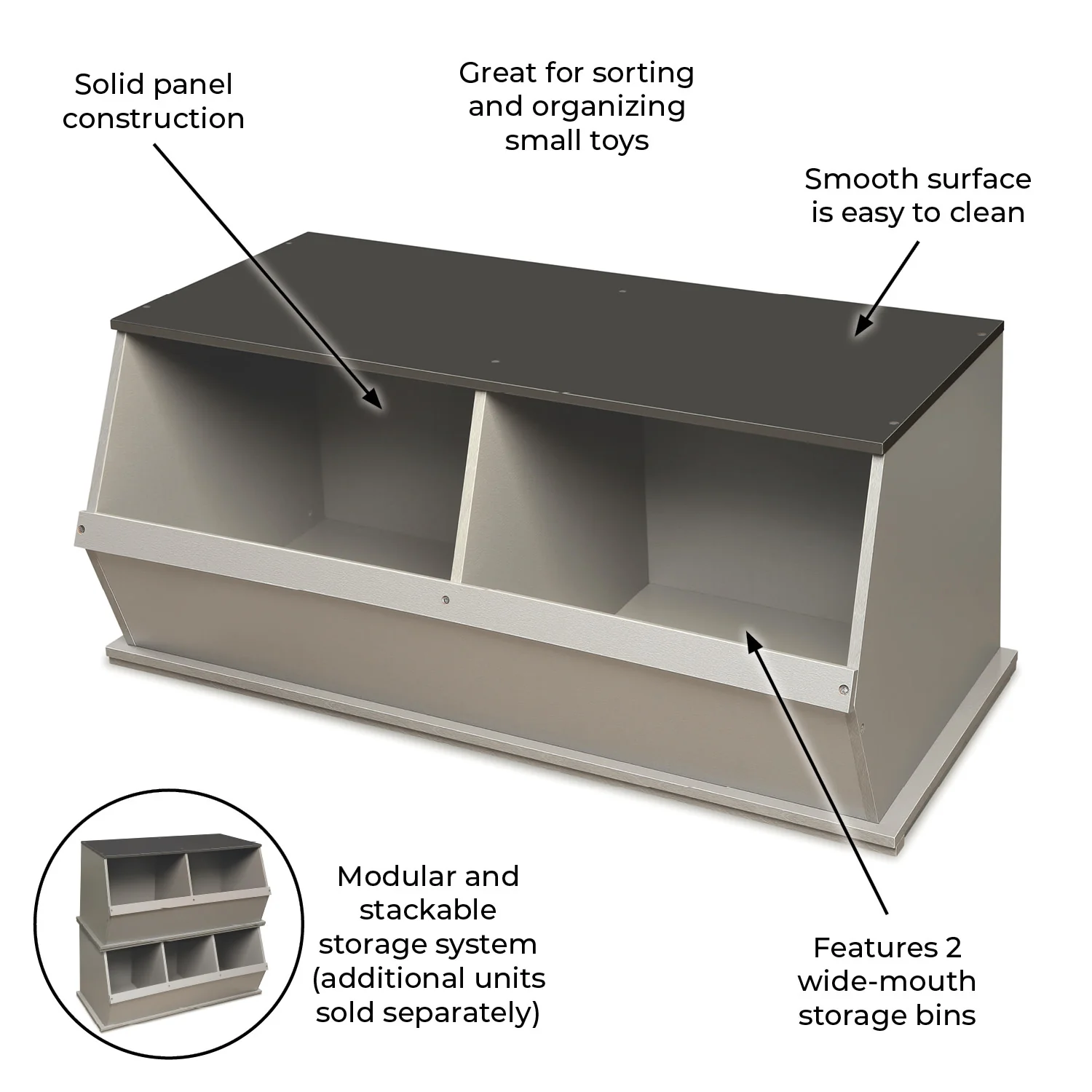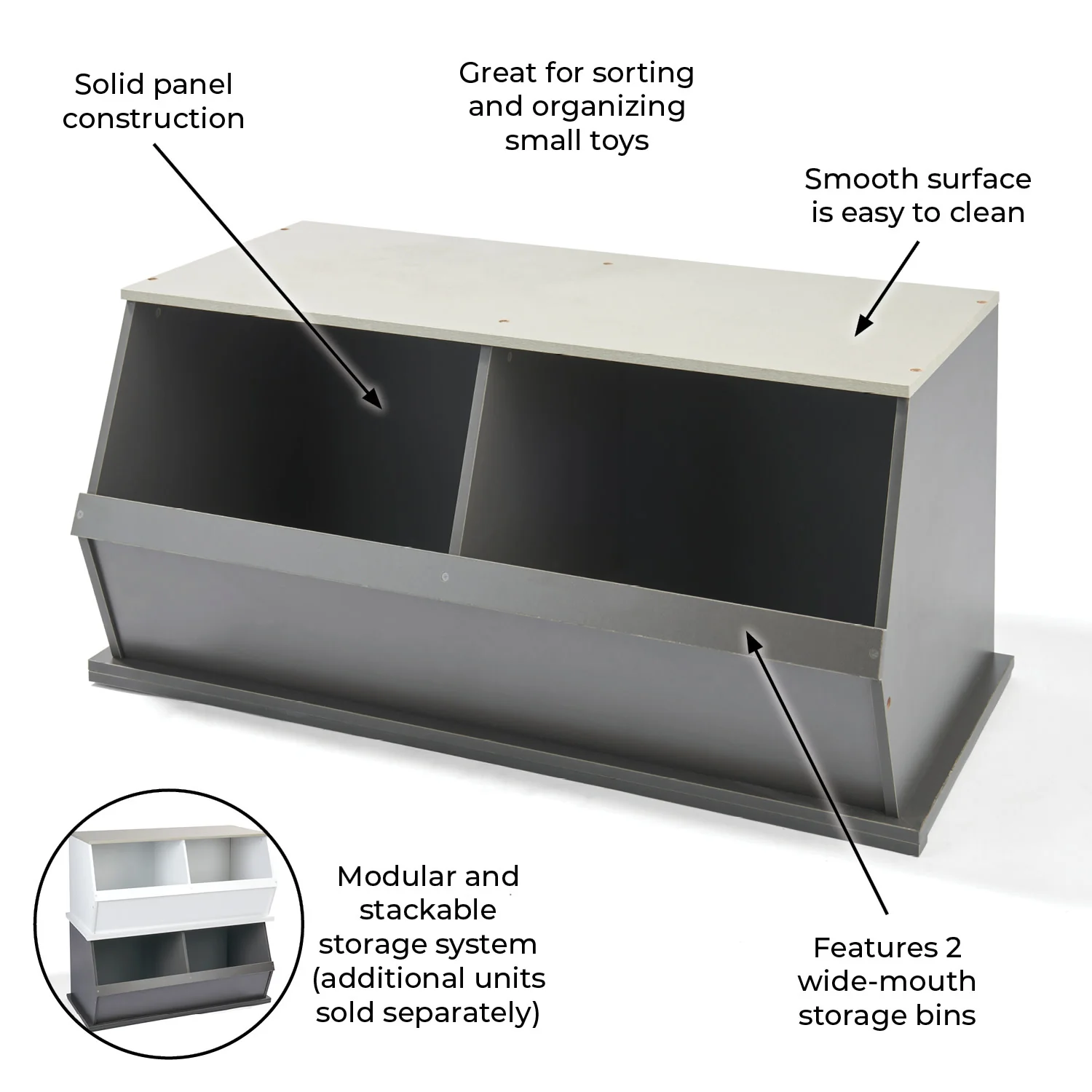 - Features two very generously sized open bins that can be stacked with other bins to expand your storage capacity (each bin unit sold separately).