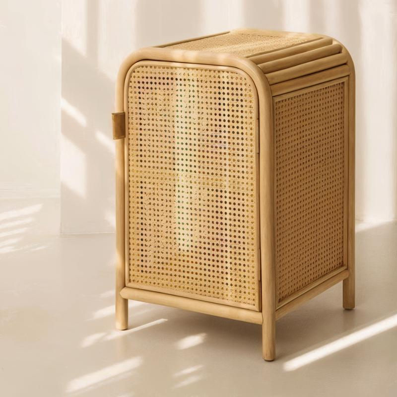 Add an exotic accent to your personal space with the refined yet elegant rattan-paneled design of the Birch Side Table. Featuring a sturdy bamboo frame and exotic rattan paneled door in natural color, and a leather handle, it is made up of 2 interior shelves. Including in it a large storage space, this side table/cabinet proves to be a great method to keep your home or office free of clutter. Birch is the ideal option for when you need extra space for art items, reading books, food, games, or simply adding a classic yet decorative touch to your interior. It is distinguished by a blend of natural and modern elements and is a great complement to your living room, hallway, or bedroom.