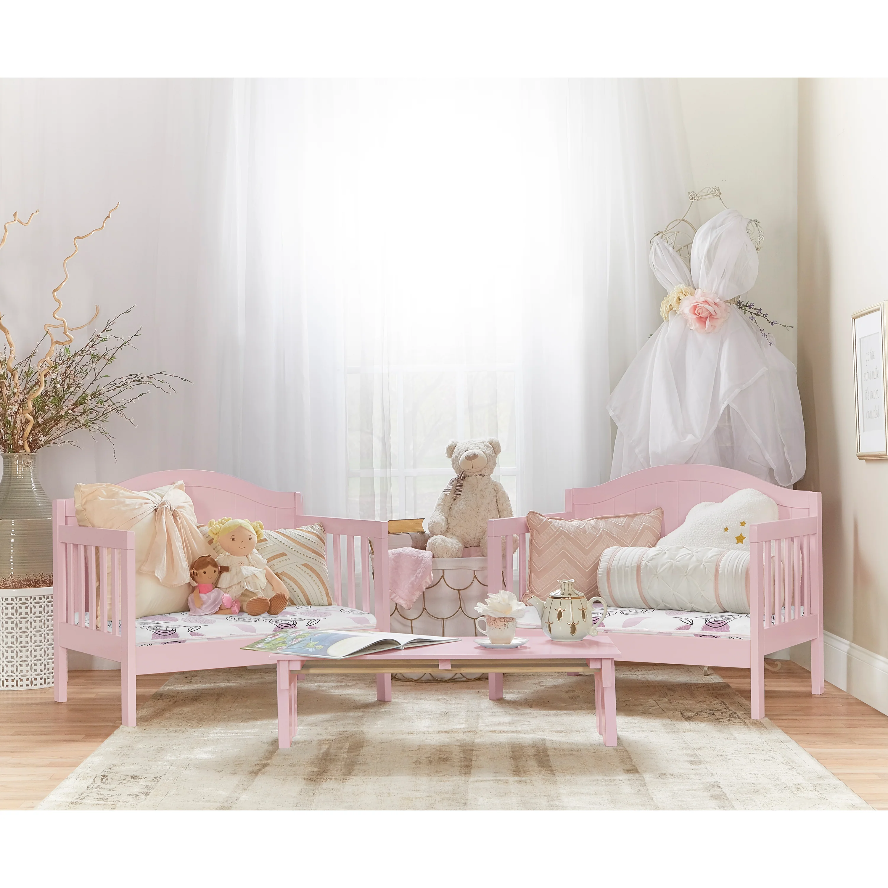 - The toddler bed is designed low to the floor, used as safety guard rails