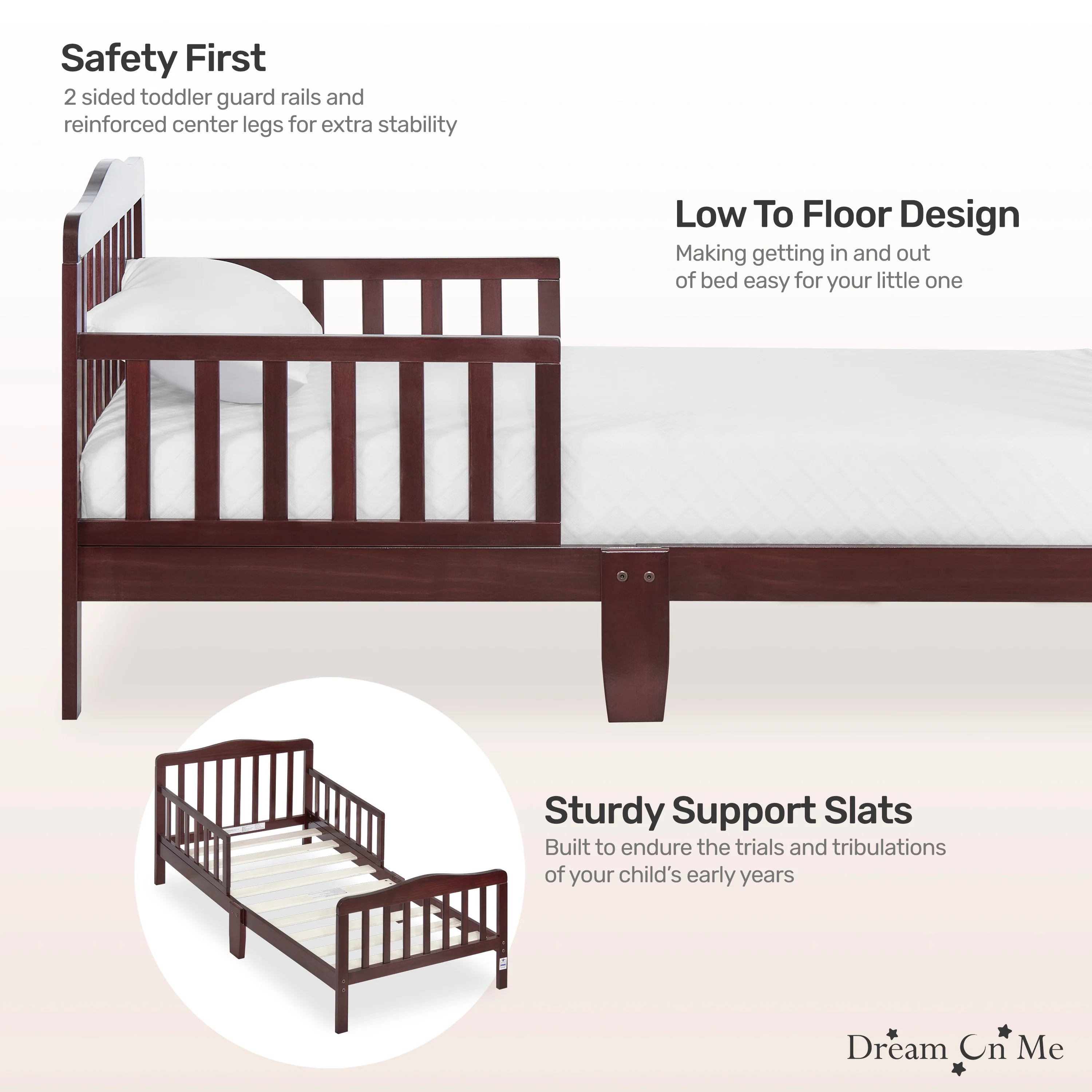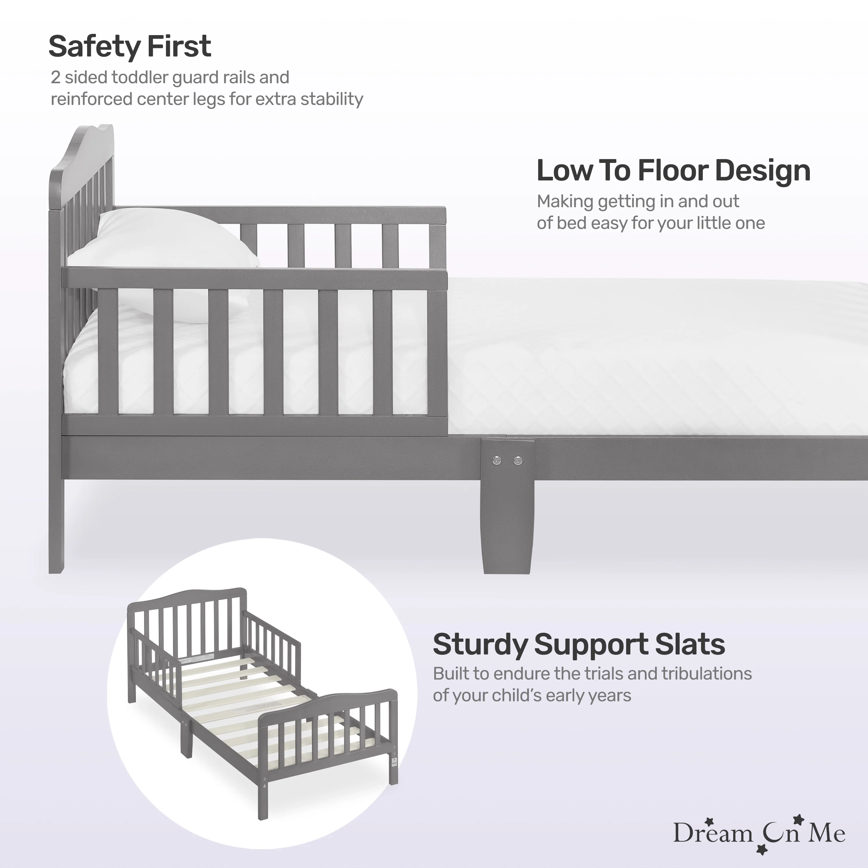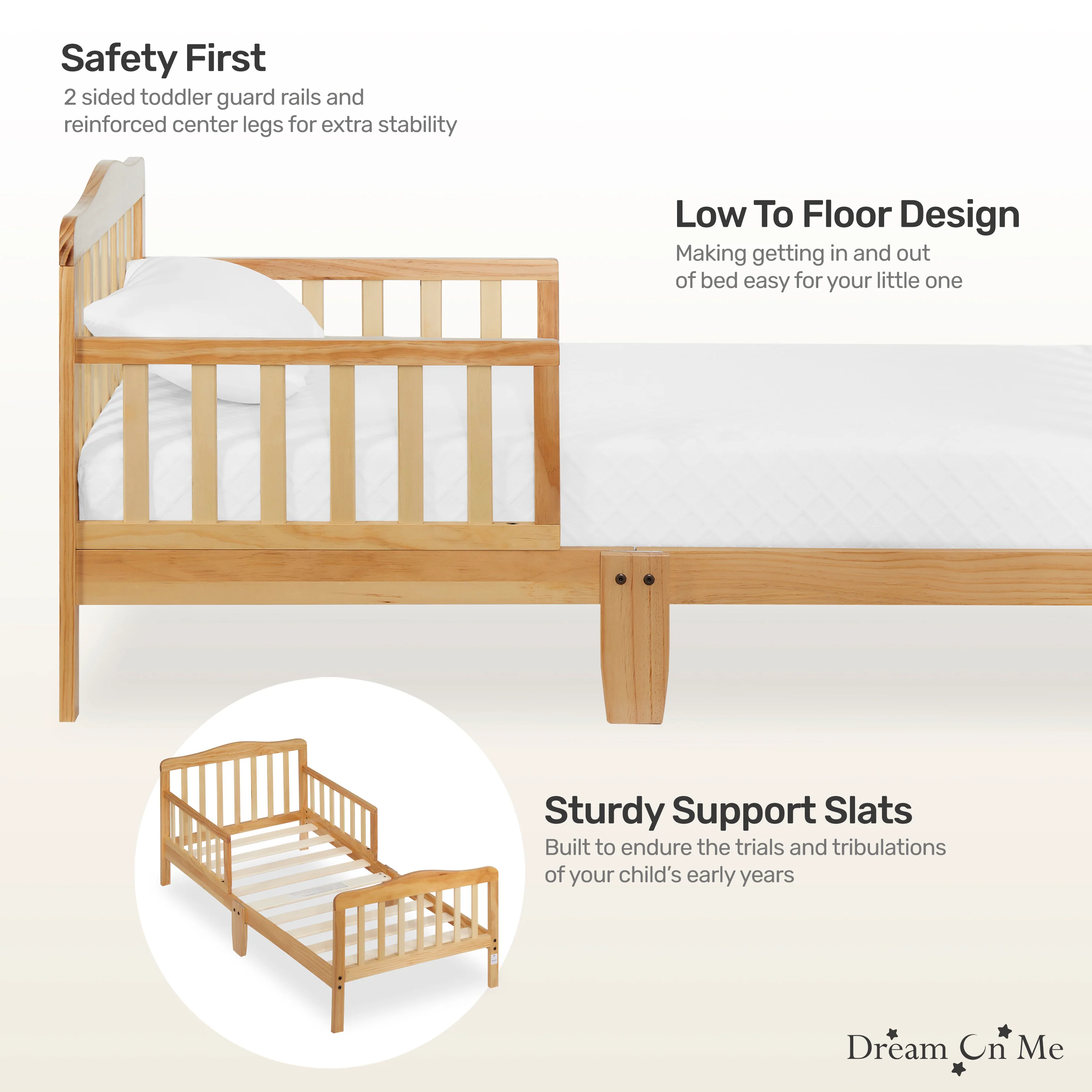 - STYLISH DESIGN: The Dream On Me Classic Design Toddler Bed is ideal for toddlers as they make the transition from a crib to a bed; Minimalist in design, the solid wooden bed has gently arched head and footboards and smooth curving rails and beams