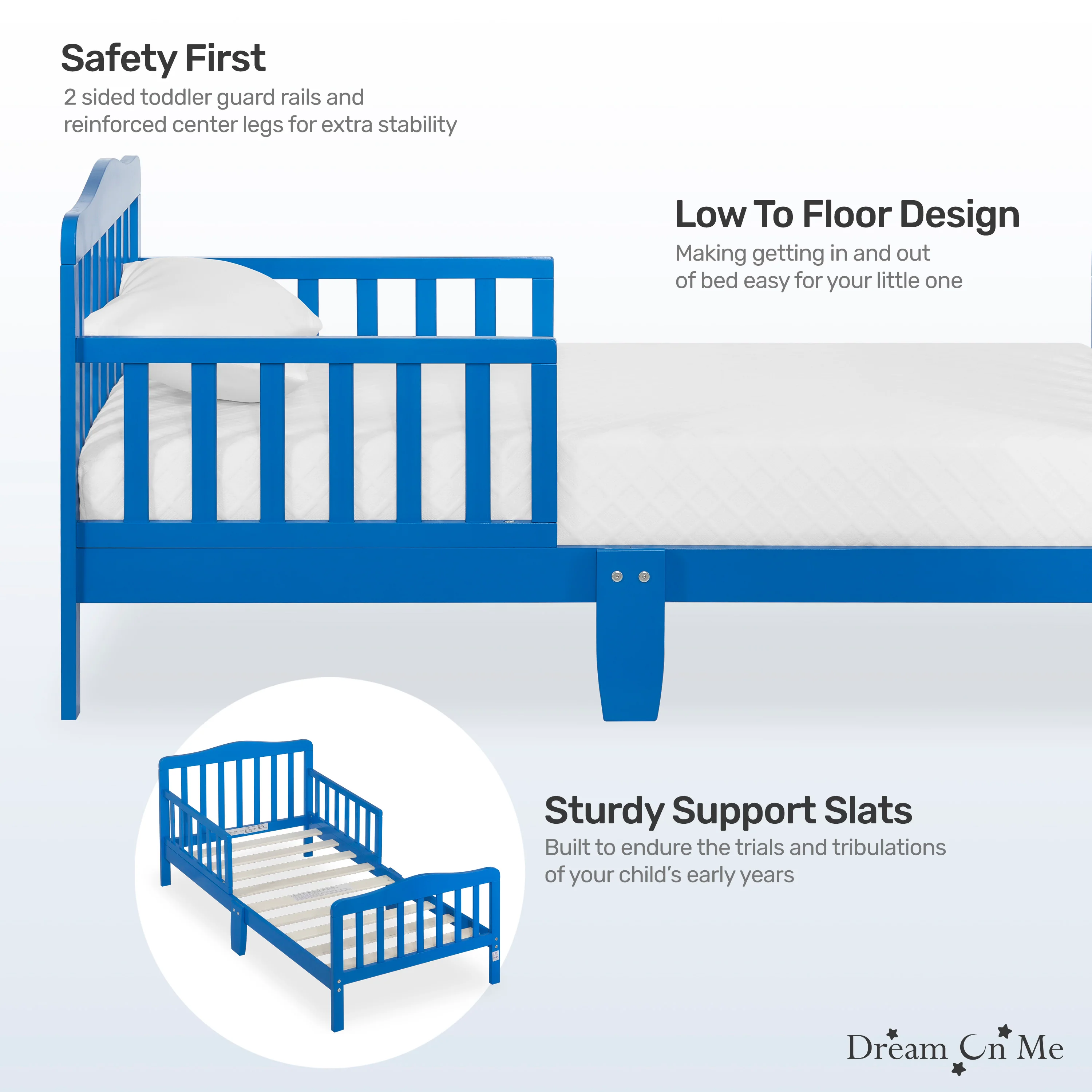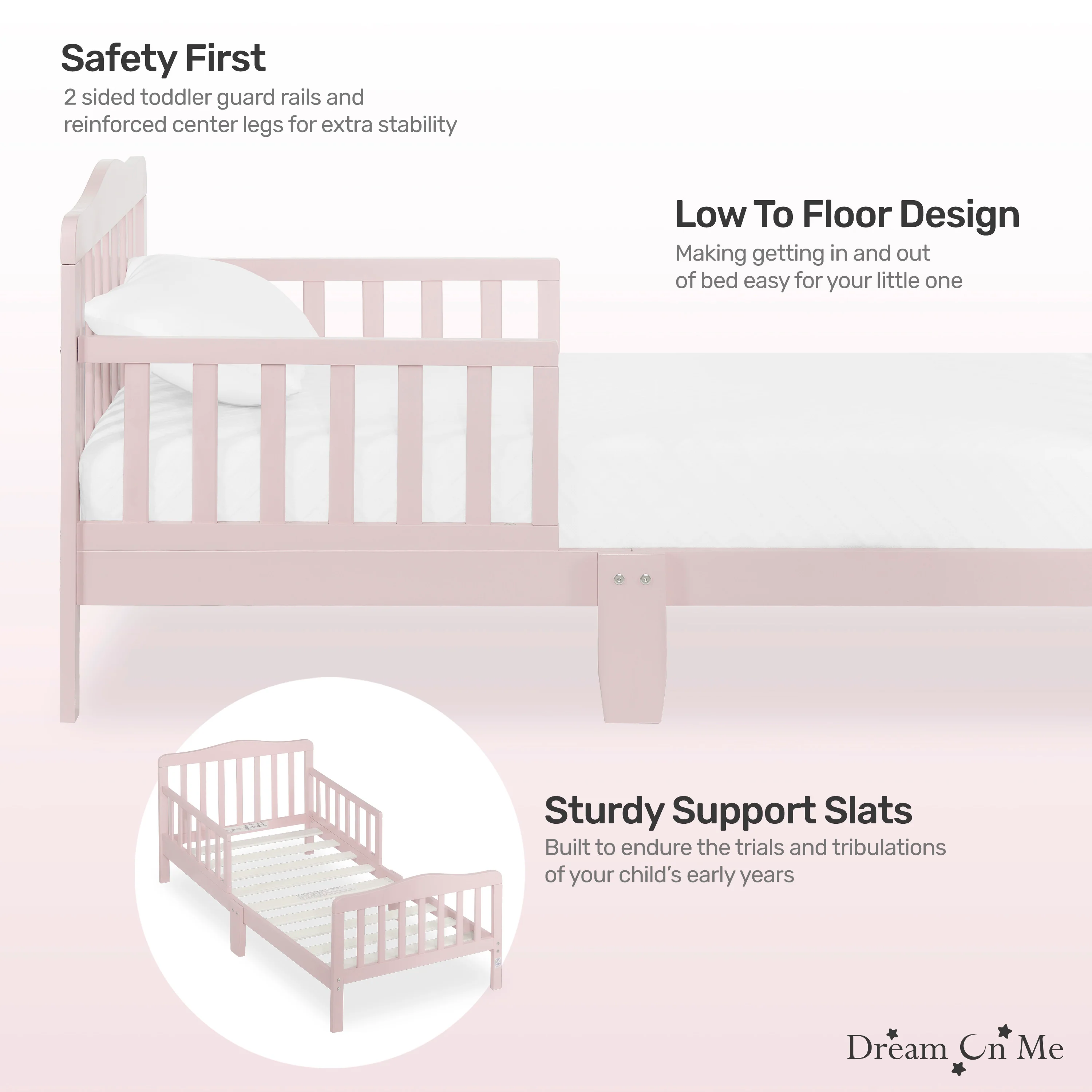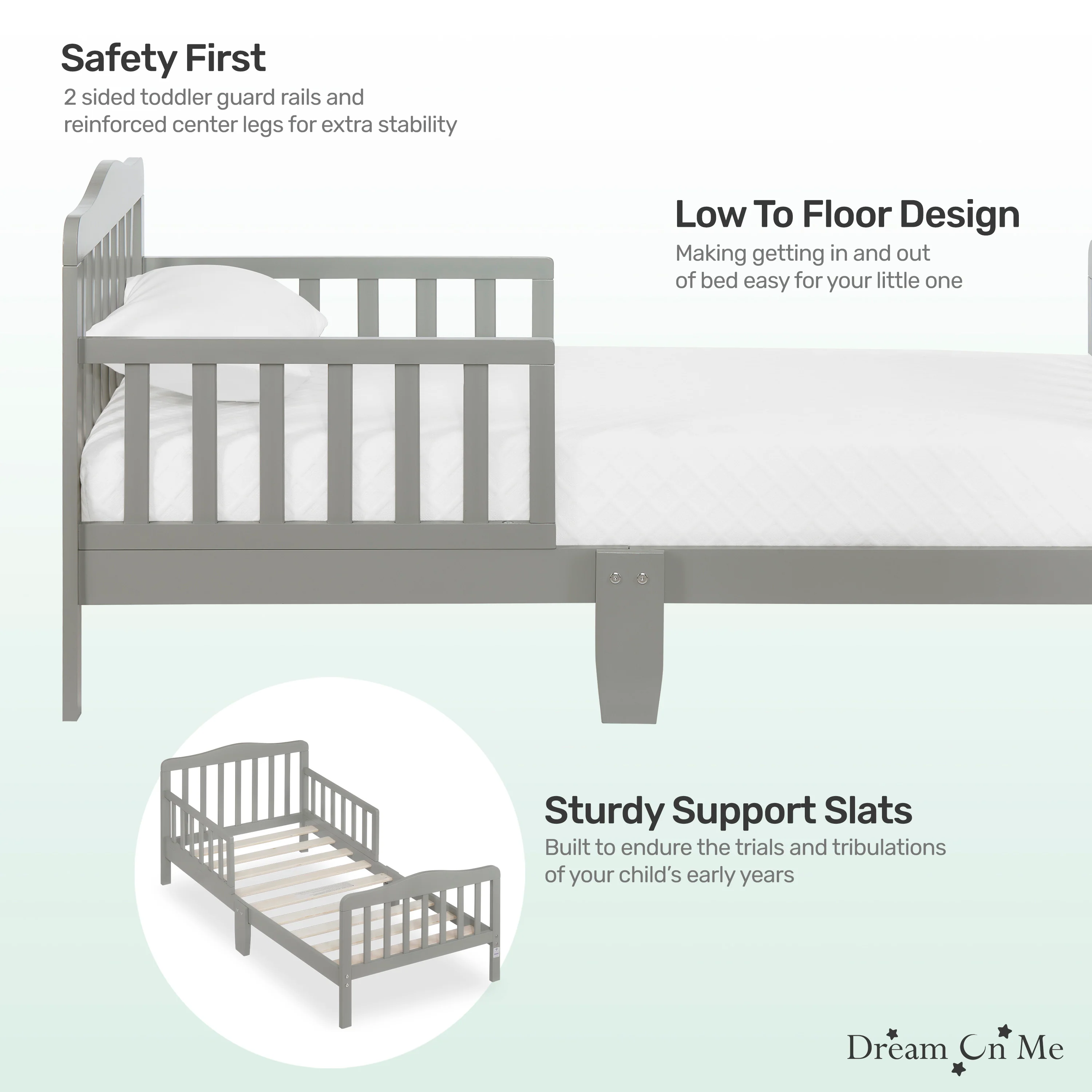 - STYLISH DESIGN: The Dream On Me Classic Design Toddler Bed is ideal for toddlers as they make the transition from a crib to a bed; Minimalist in design, the solid wooden bed has gently arched head and footboards and smooth curving rails and beams