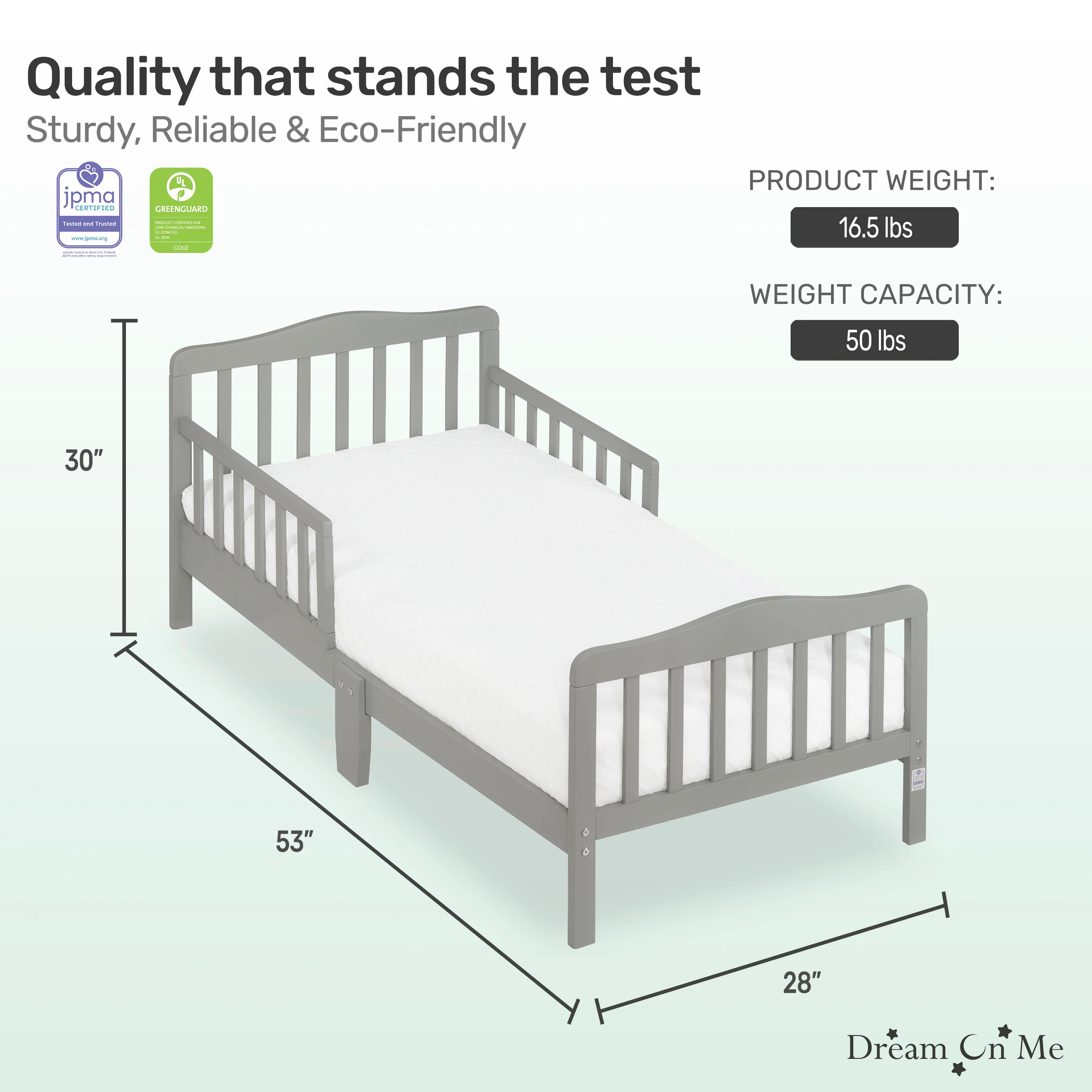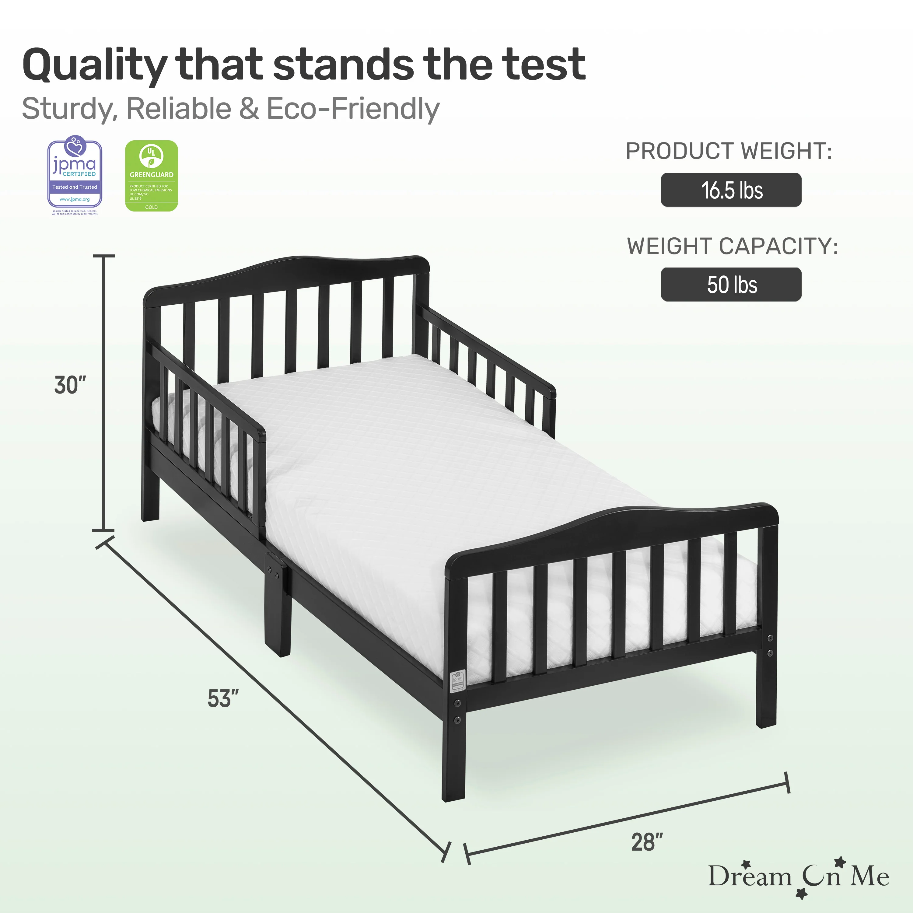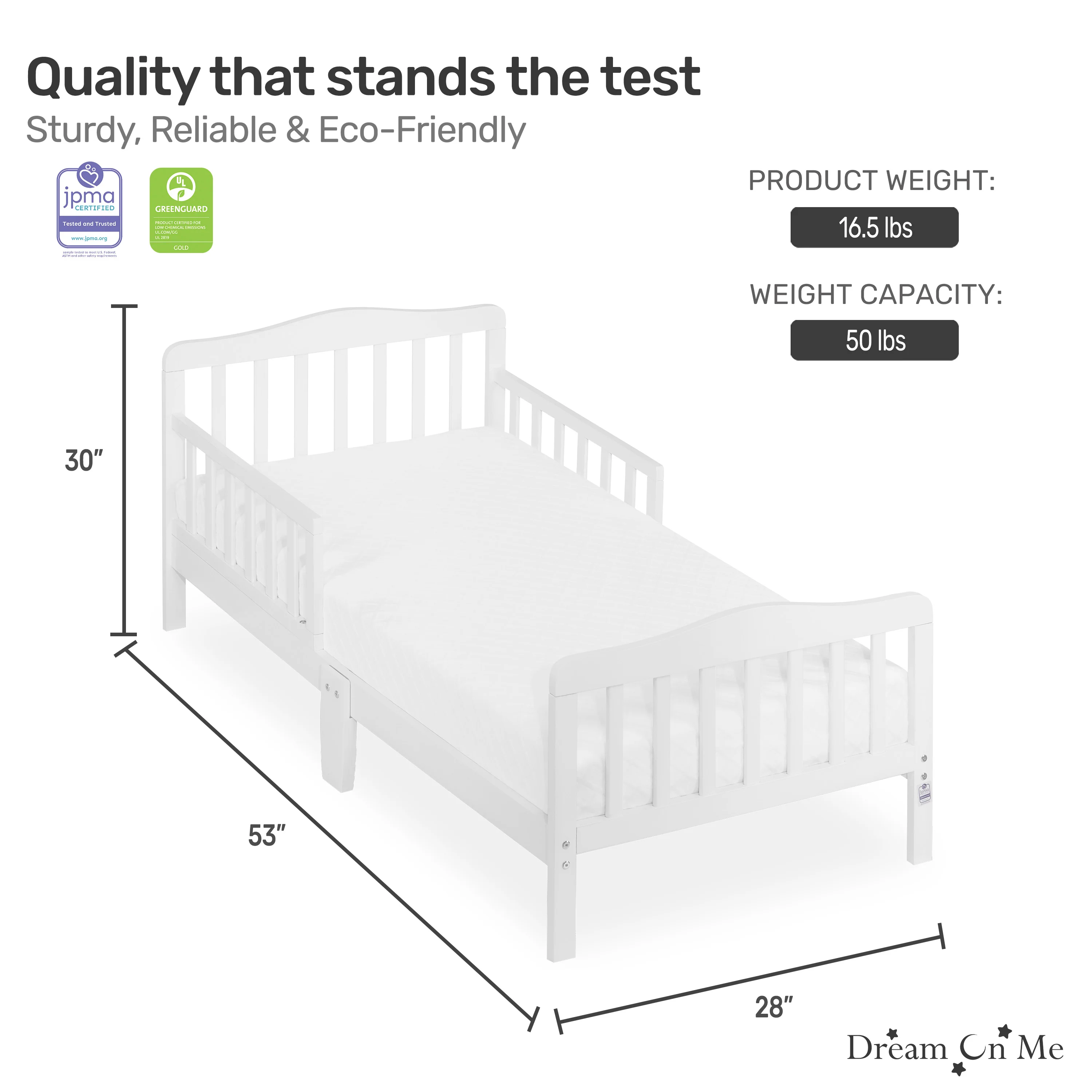 - PRODUCT SPECS: The dimensions are 53 L x 28 W x 30 H inches and it weighs 16.5 lbs; It can accommodate a child up to 50lbs; Choose any Dream On Me non-toxic, Greenguard certified standard crib mattress for a perfect fit