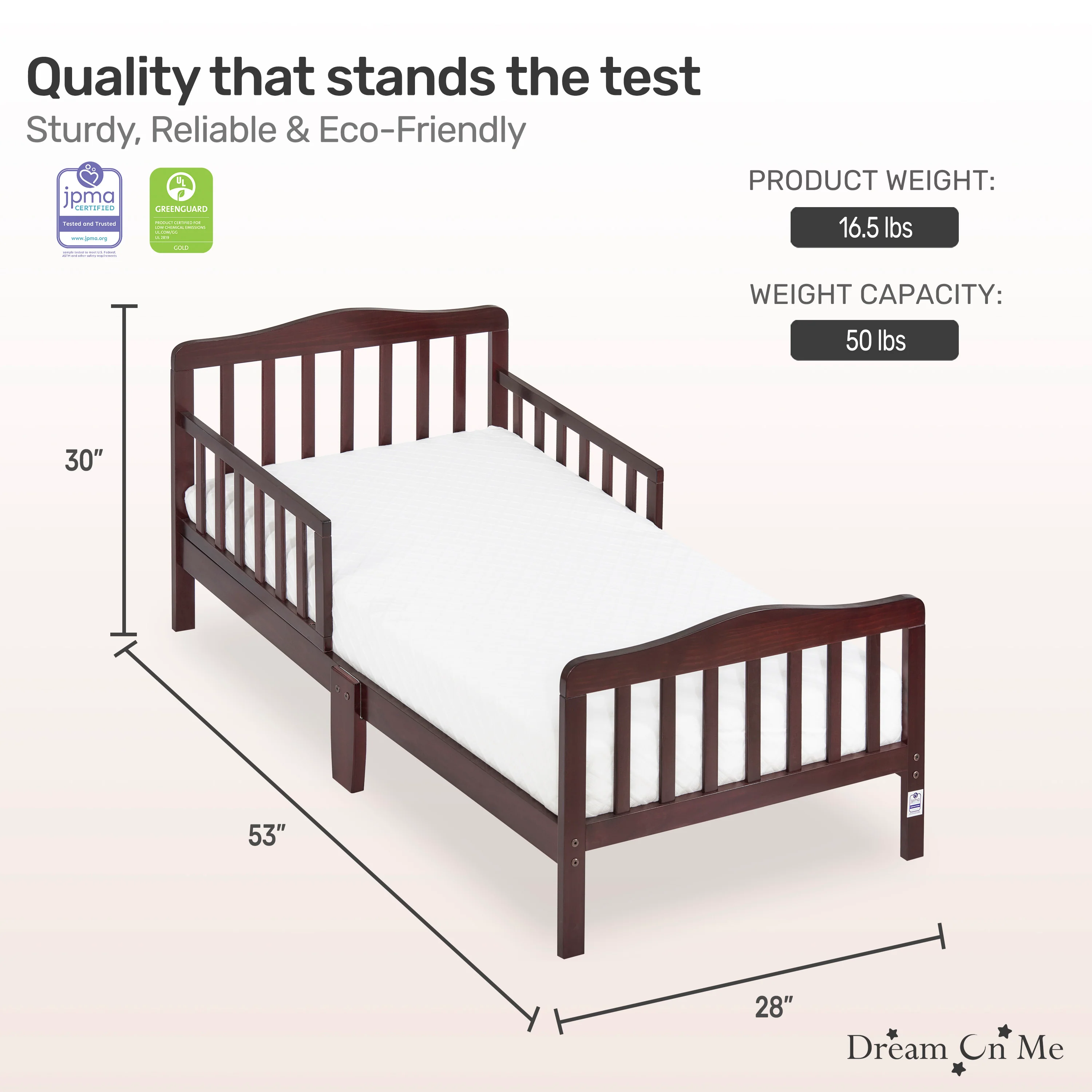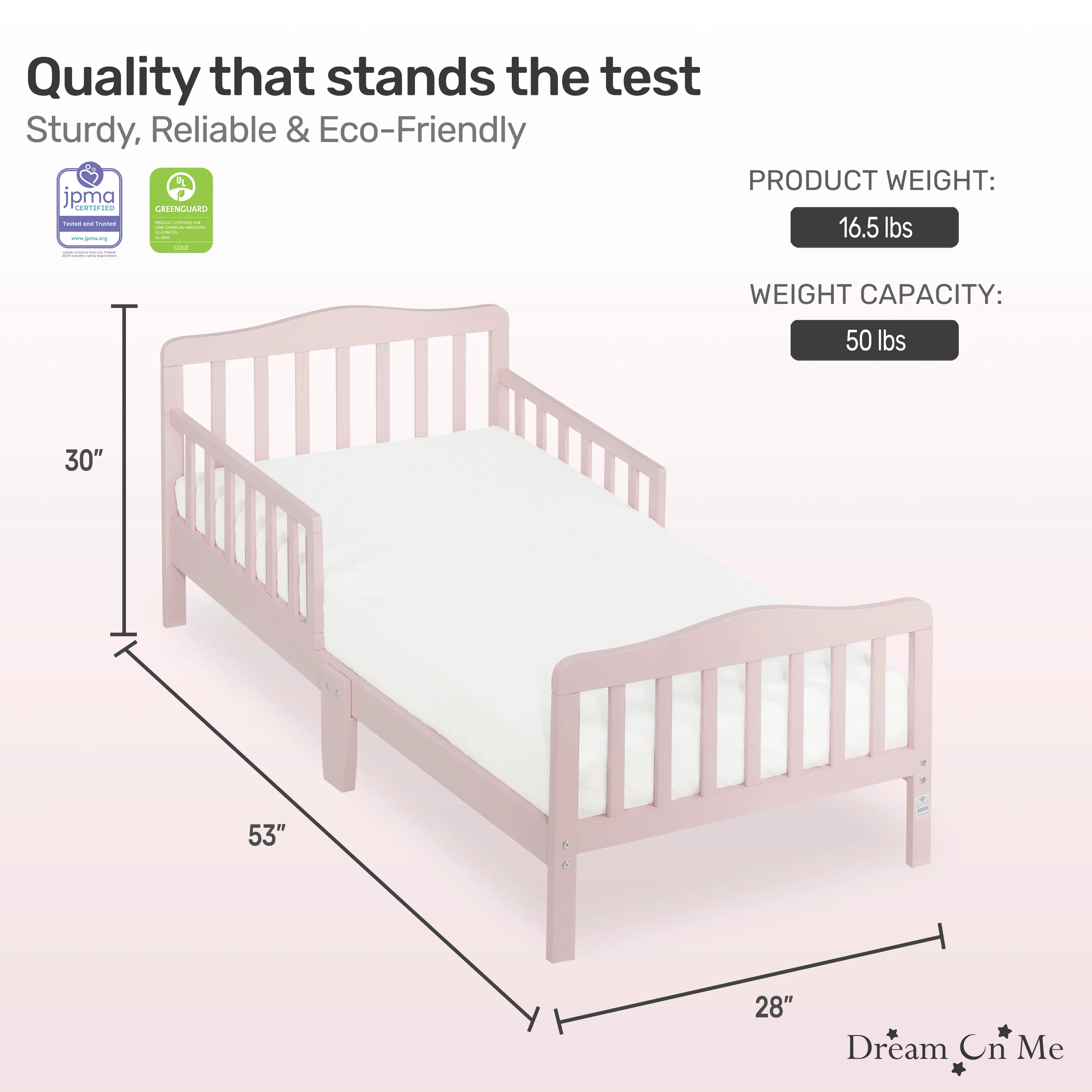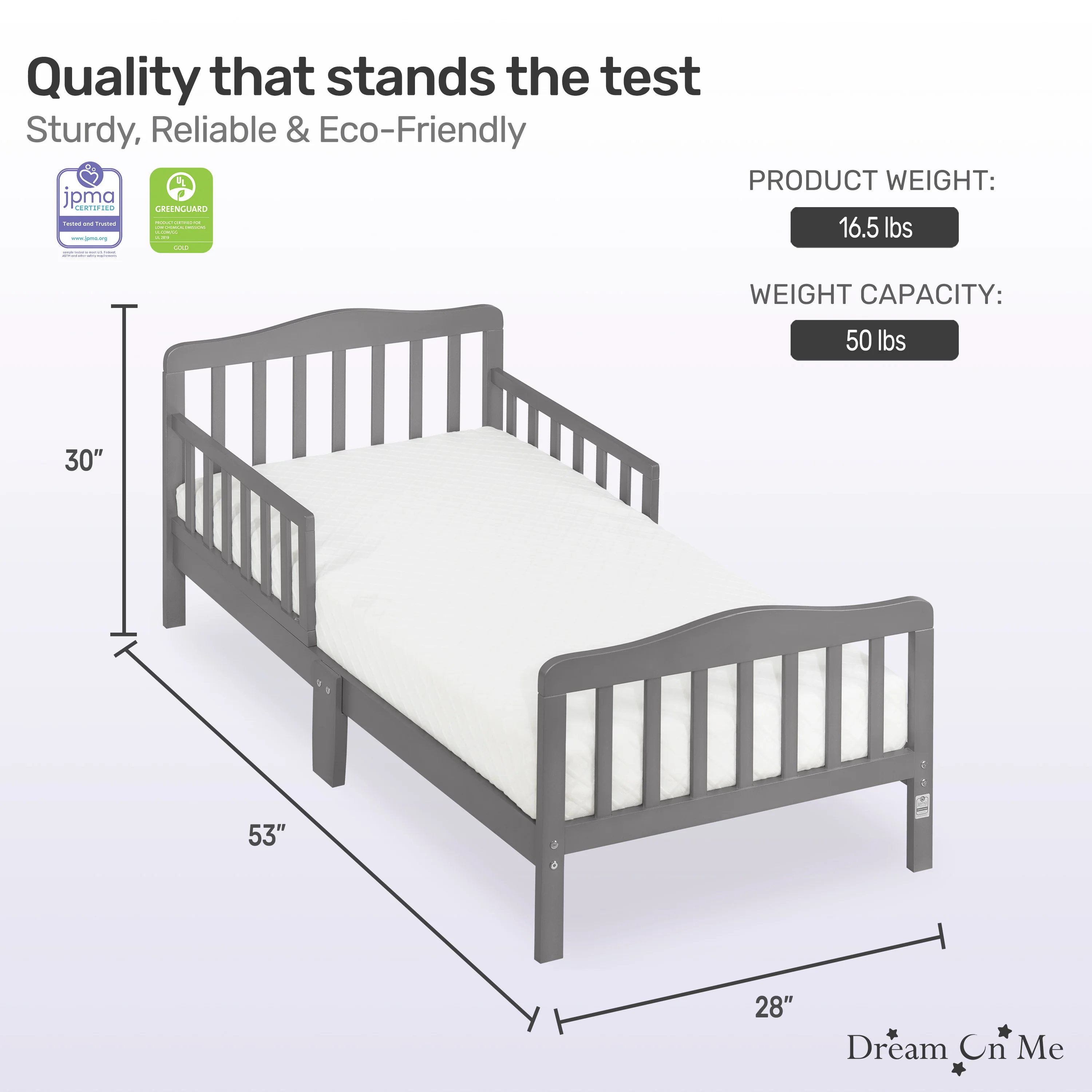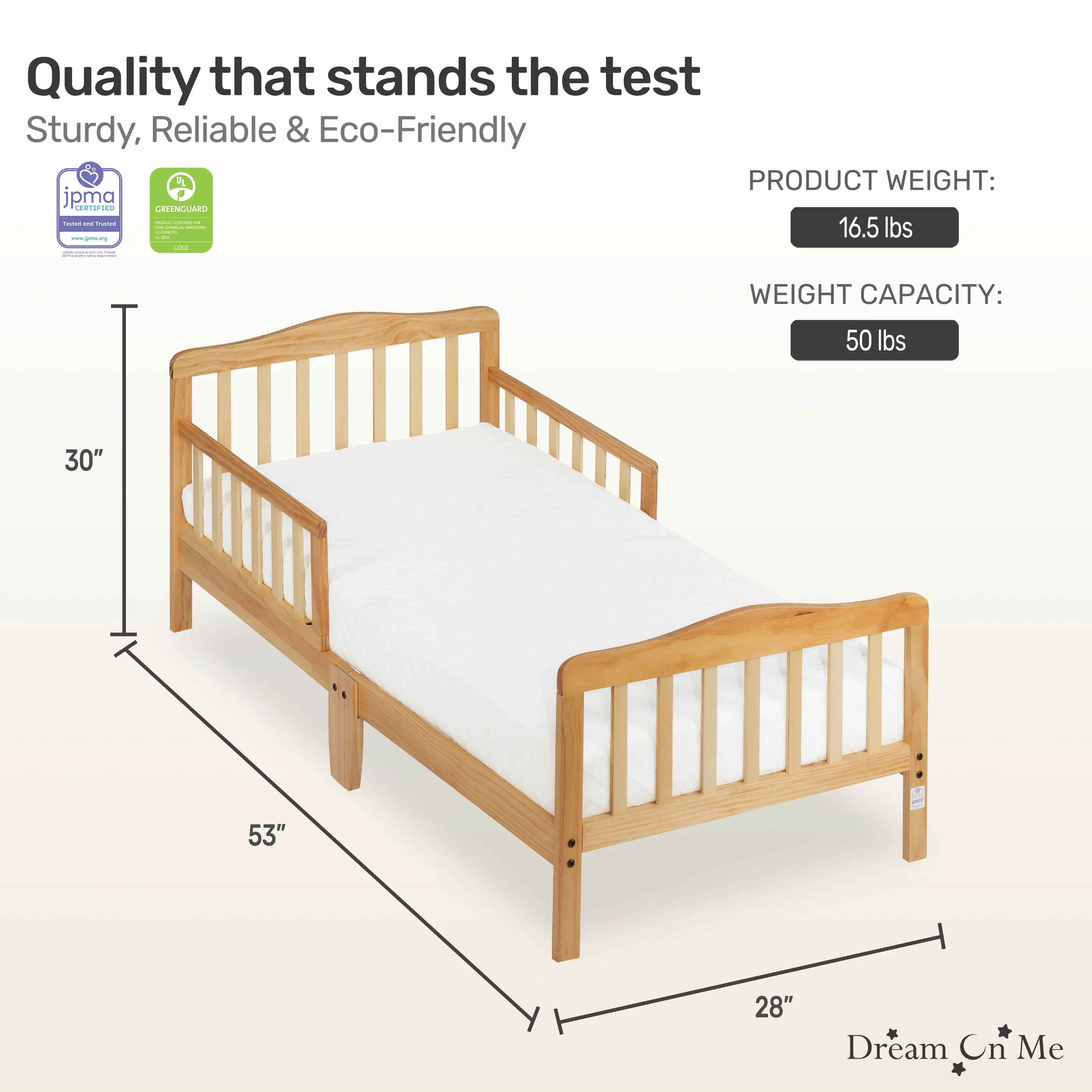 - PRODUCT SPECS: The dimensions are 53 L x 28 W x 30 H inches and it weighs 16.5 lbs; It can accommodate a child up to 50lbs; Choose any Dream On Me non-toxic, Greenguard certified standard crib mattress for a perfect fit
