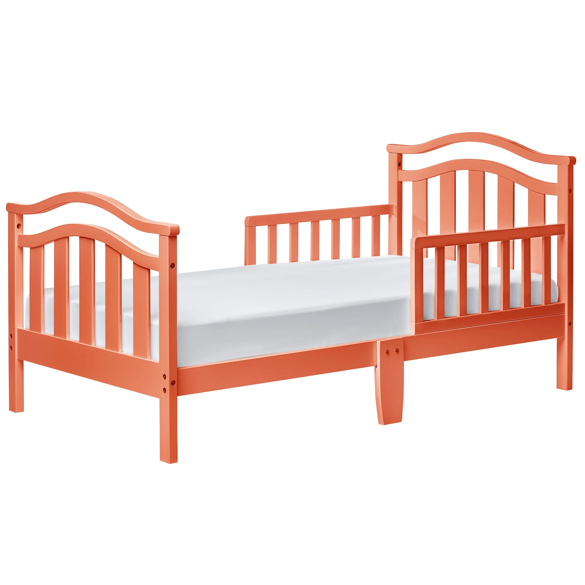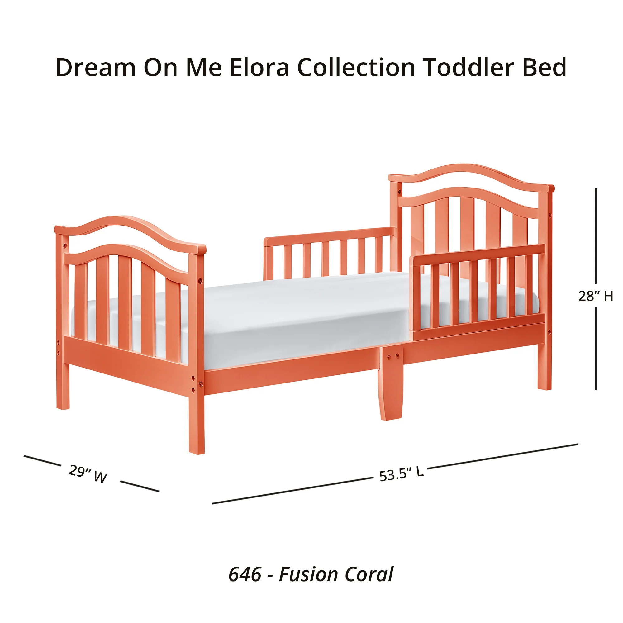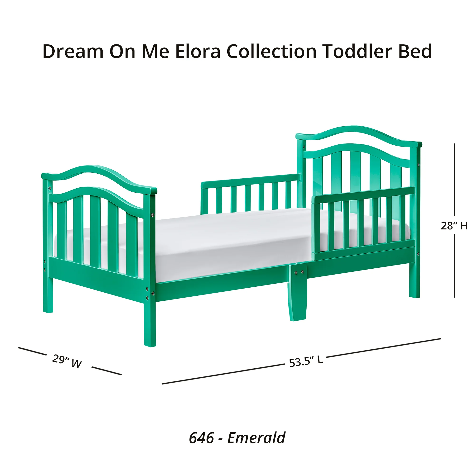Dream On Me, Eldora Toddler Bed is an elegant design made of solid wood and has a beautiful finish. Designed low to the floor so that your toddler can safely get in and out of bed Included are safety guard rail additional middle legs for added support and stability as well as wooden mattress support rails that provide durability . . Recommended for children 18 months to 5 years old with a 50 lb weight limit. Dream On Me, Standard Mattress, sold separately. Comes complete with all necessary tools for easy assembly. Meet the CPSC and ASTM standard .