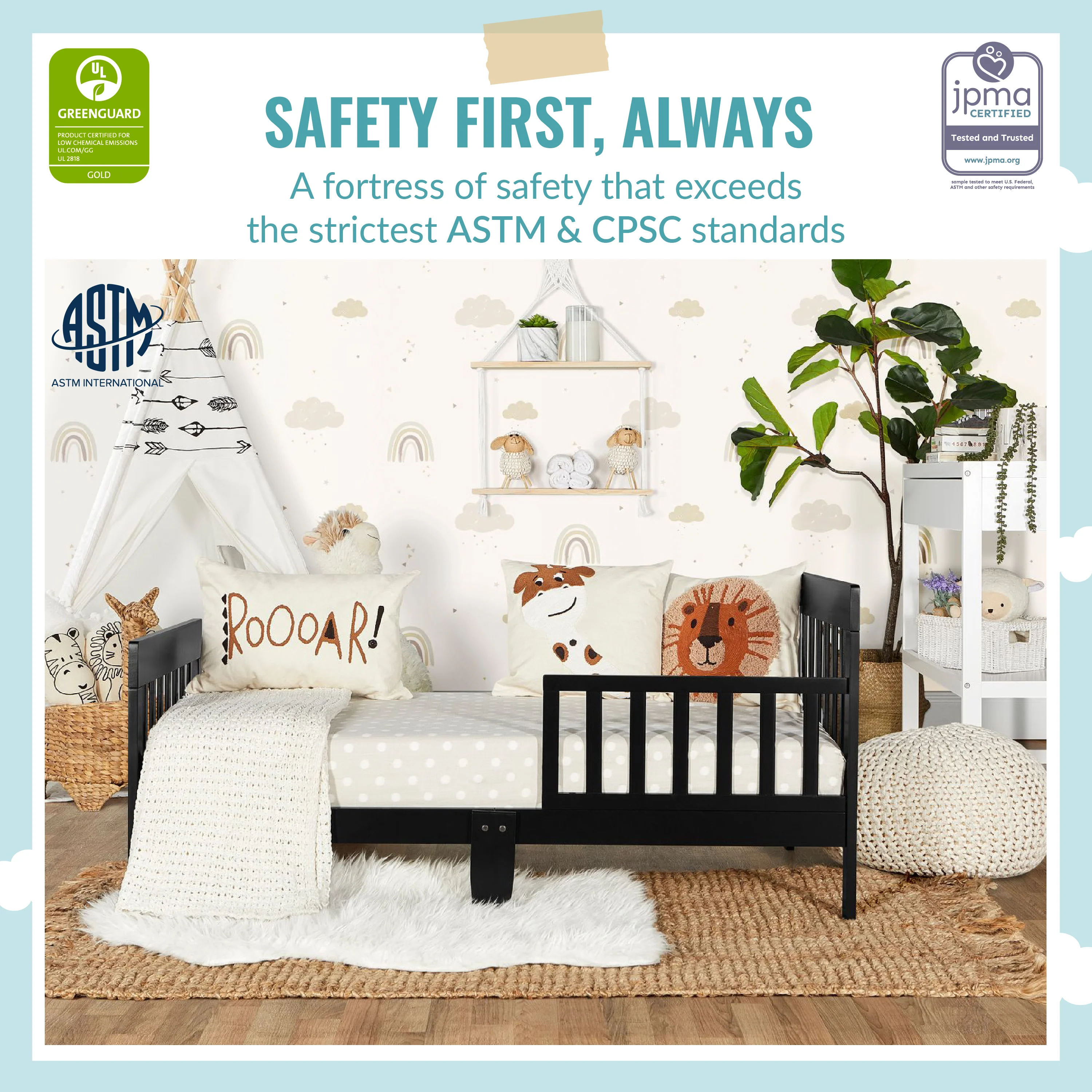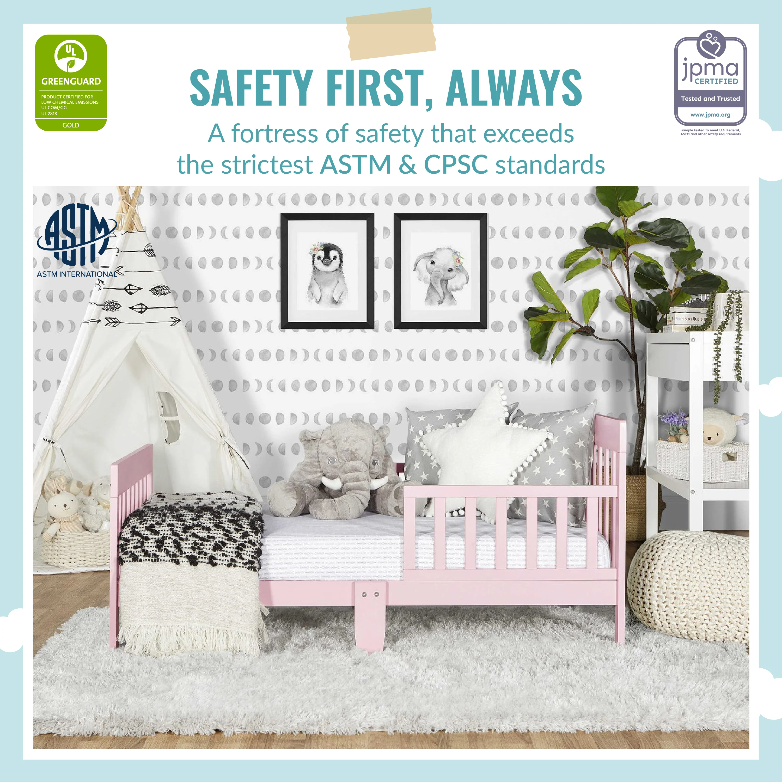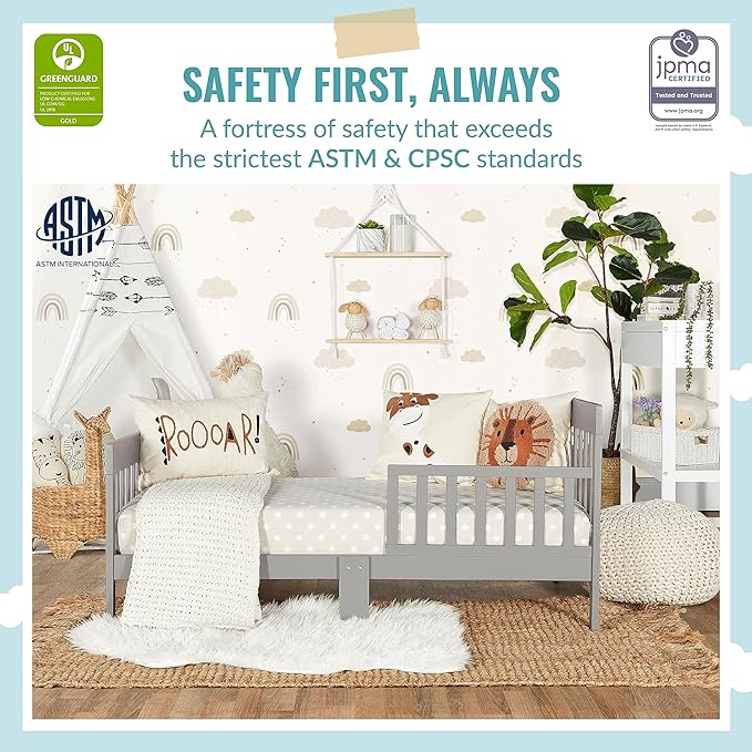 - SAFETY FIRST: Keeping in mind your child’s safety, this toddler bed is both JPMA & Greenguard Gold certified and meets/exceeds ASTM & CPSC standards.