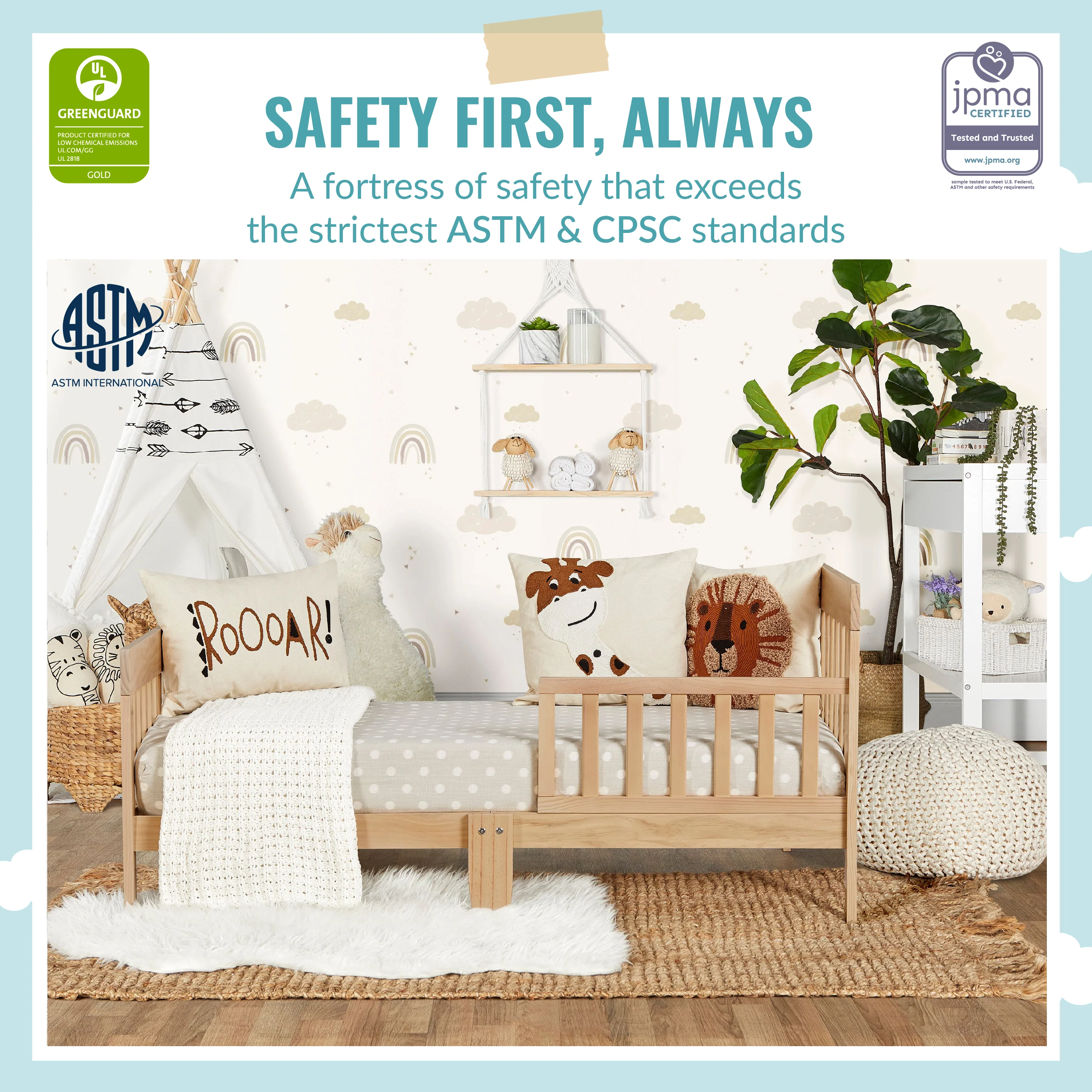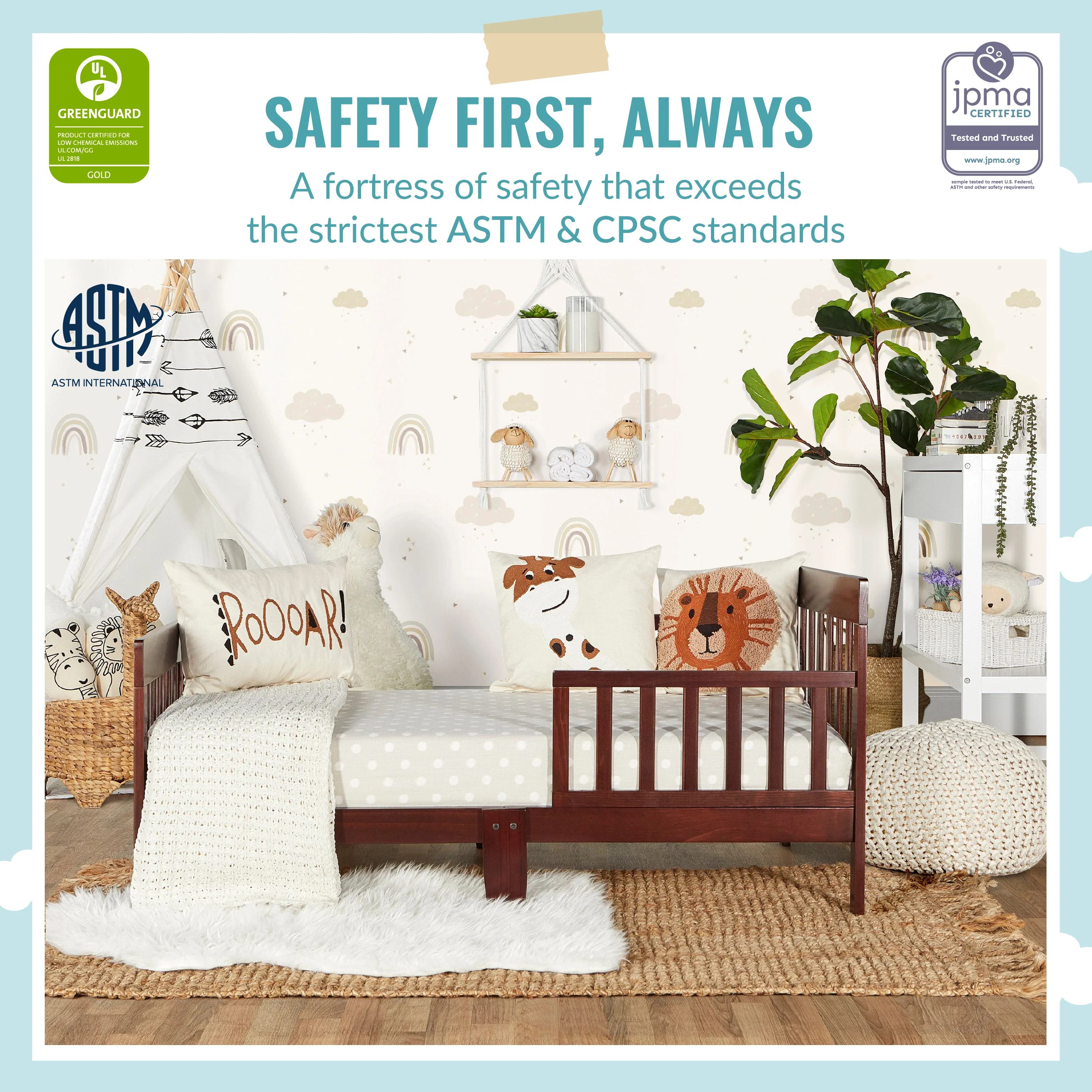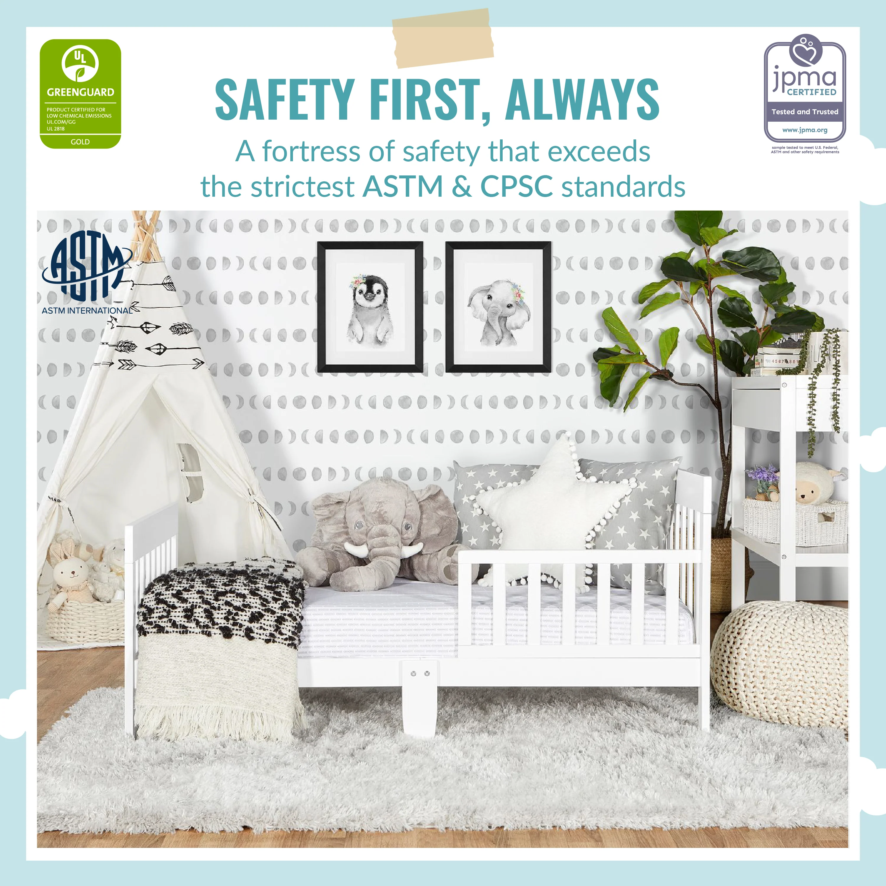 - SAFETY FIRST: Keeping in mind your child’s safety, this toddler bed is both JPMA & Greenguard Gold certified and meets/exceeds ASTM & CPSC standards.