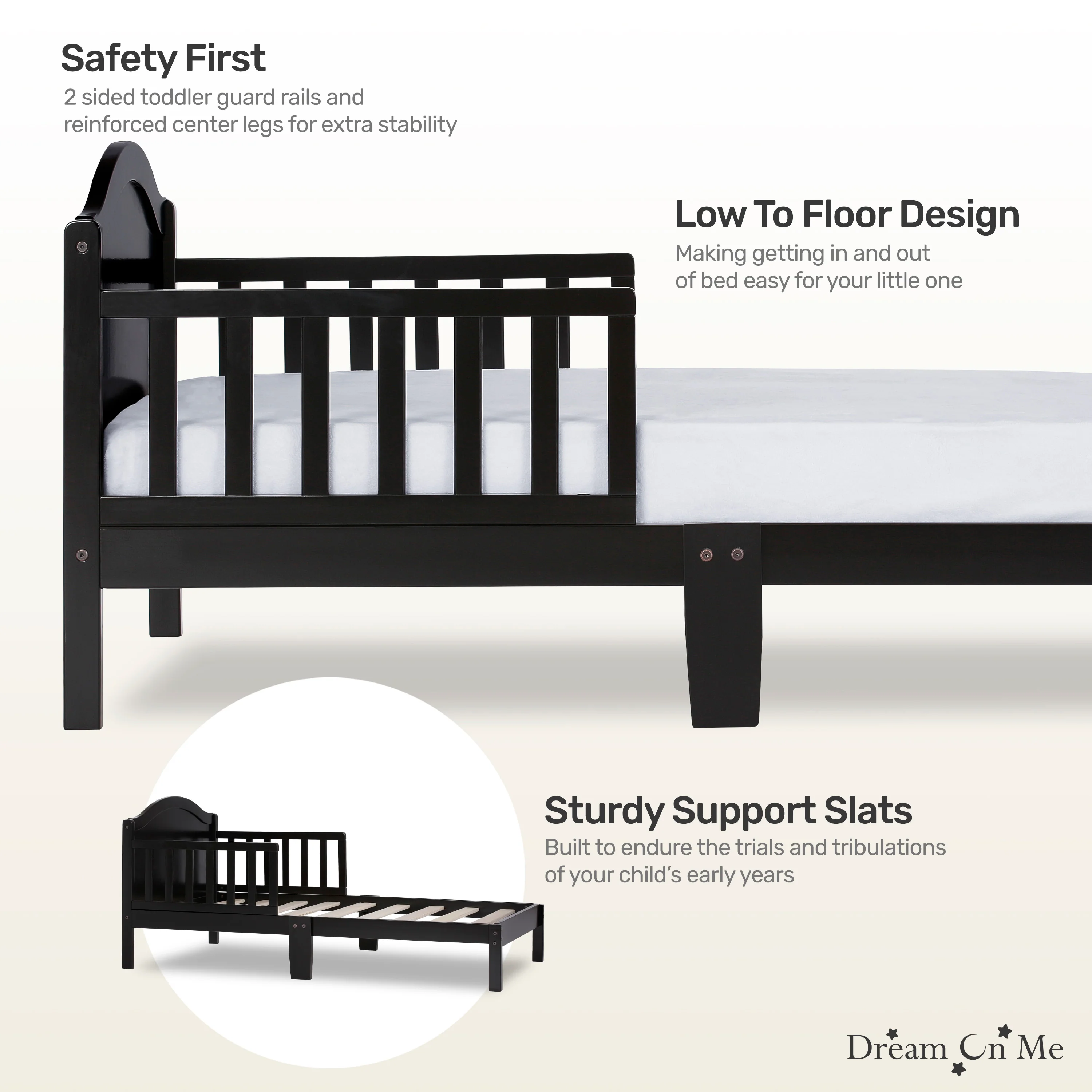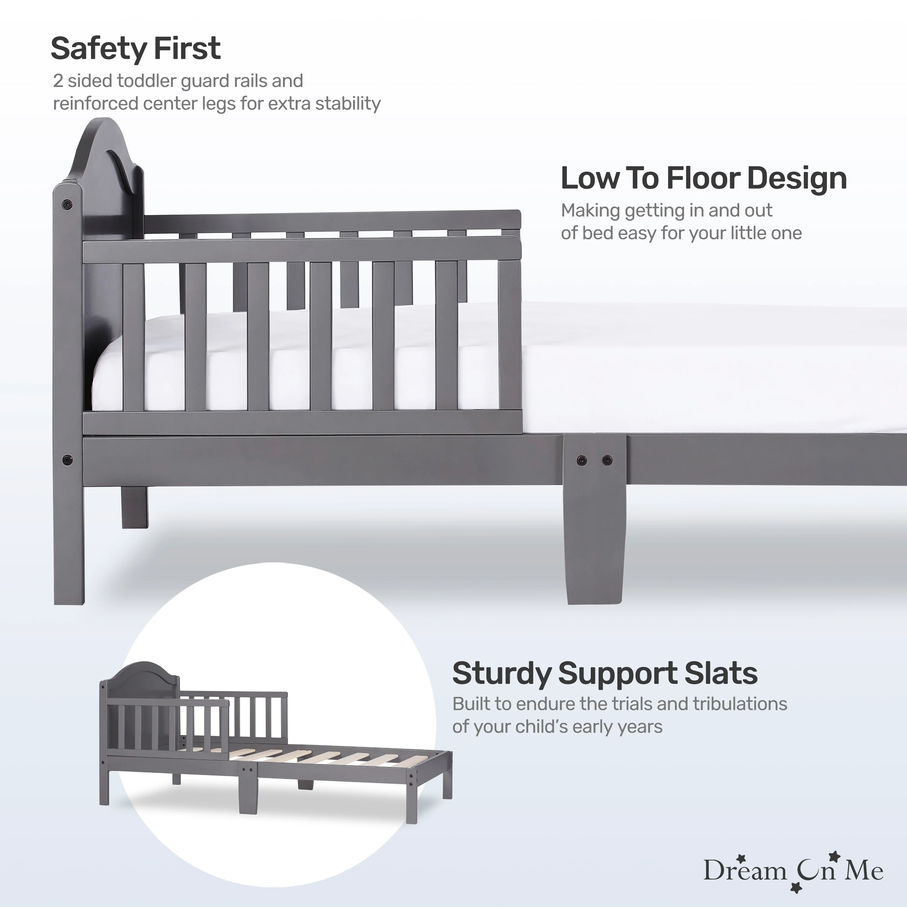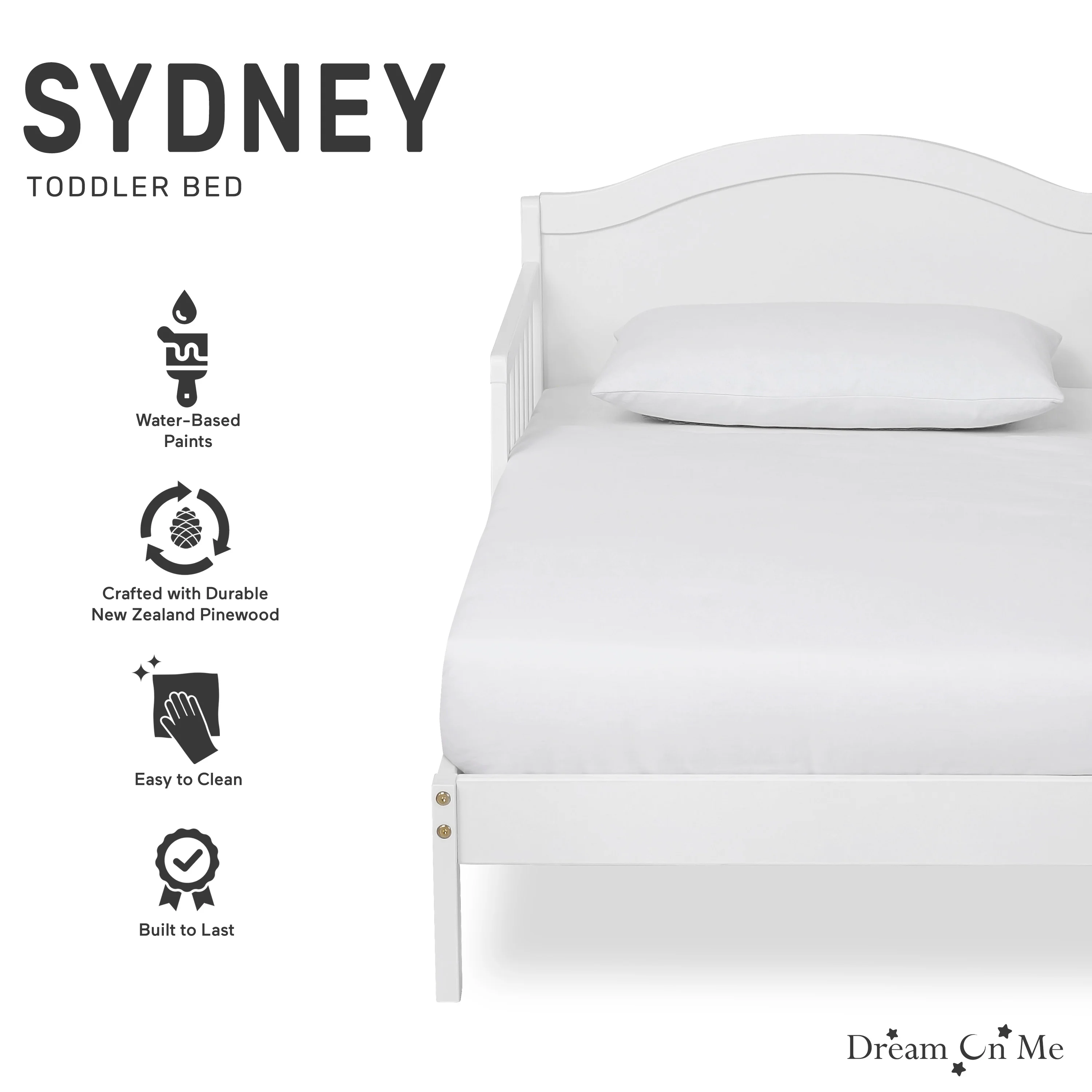 - The Dream On Me Sydney Toddler Bed sits low to the floor and comes with two side safety guard rails and is reinforced for stability with center legs