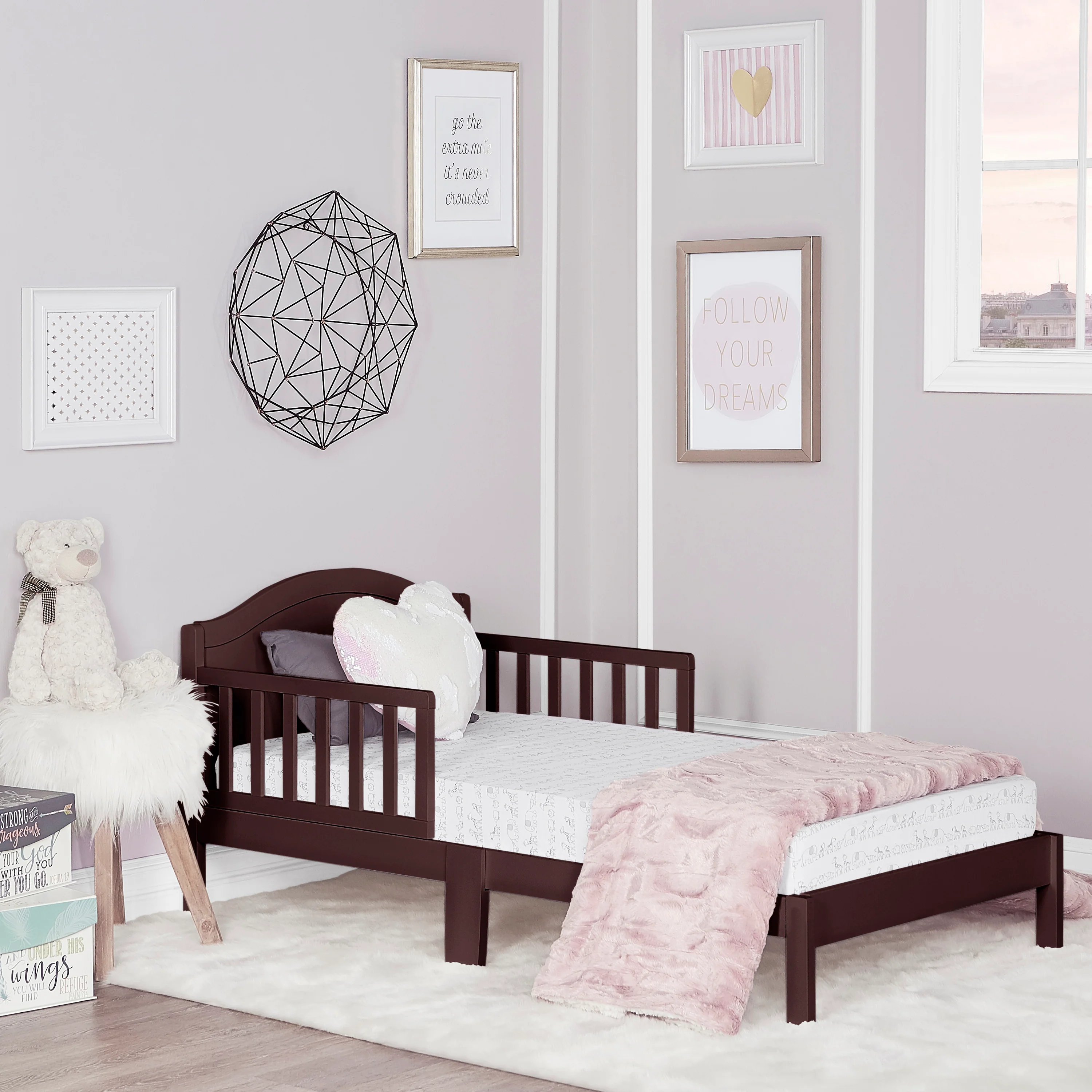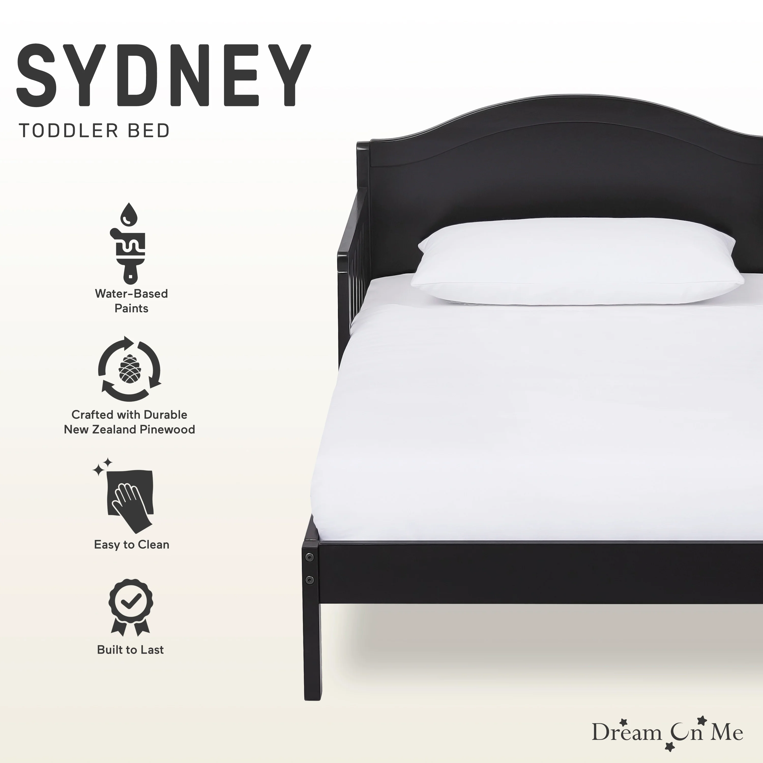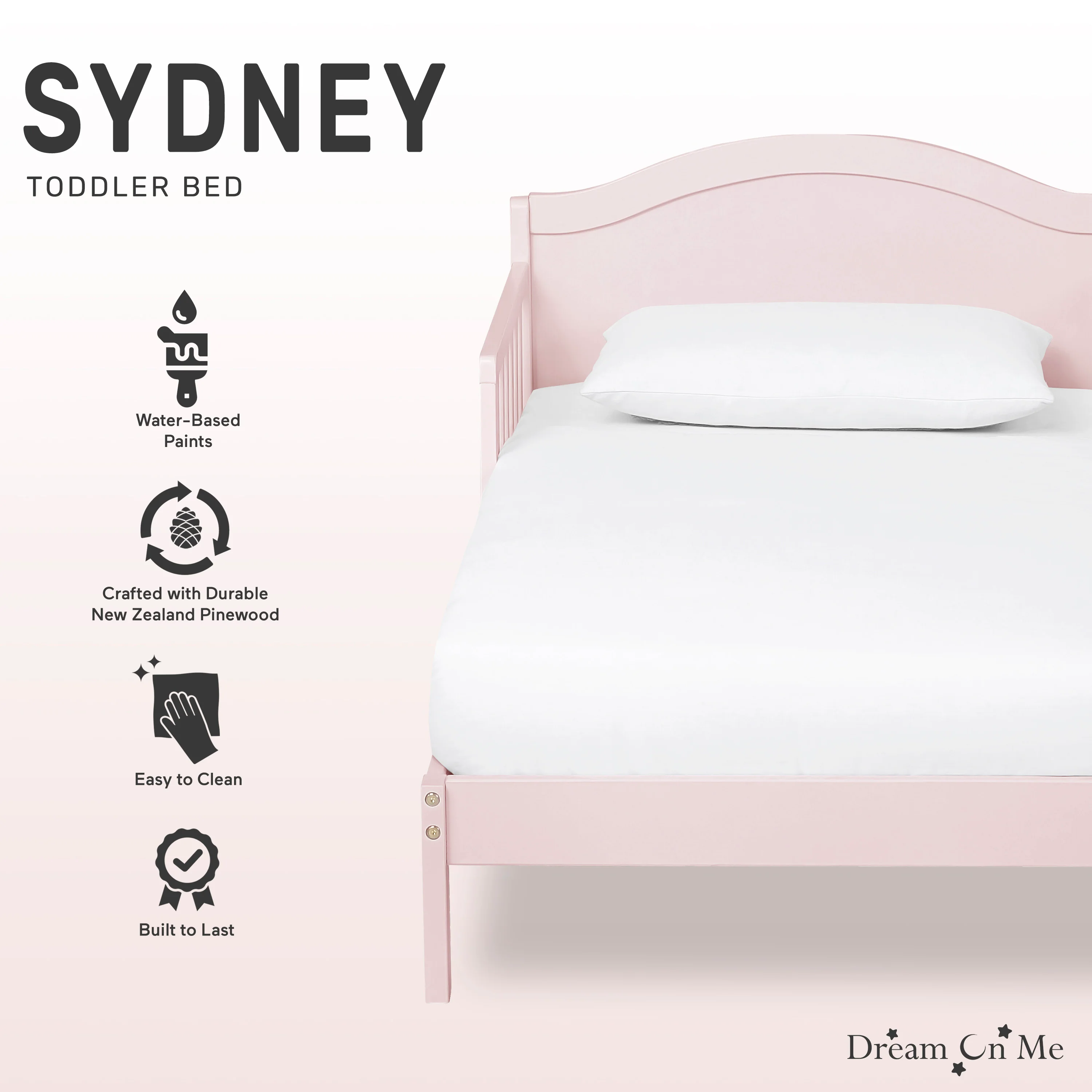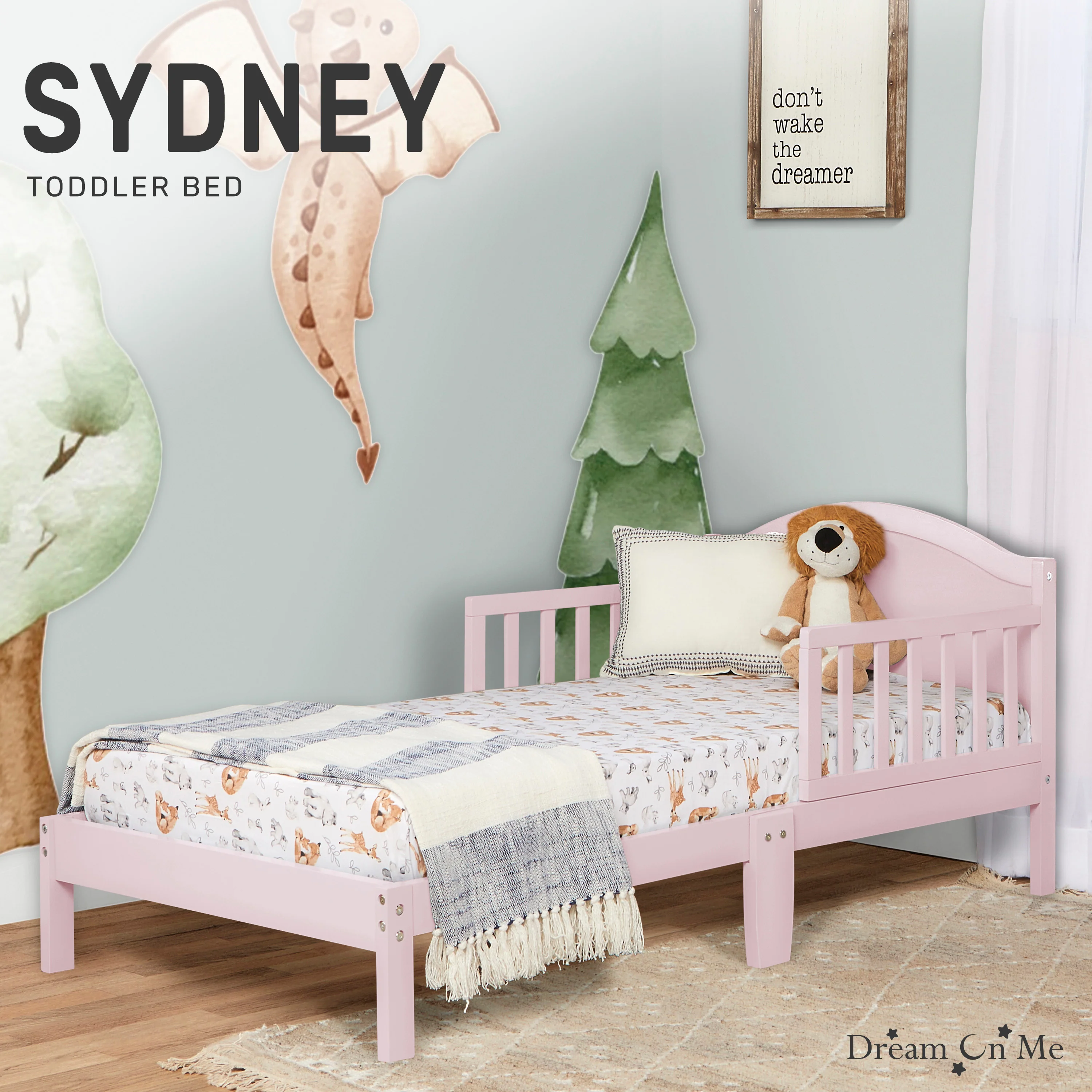 - The Dream On Me Sydney Toddler Bed sits low to the floor and comes with two side safety guard rails and is reinforced for stability with center legs