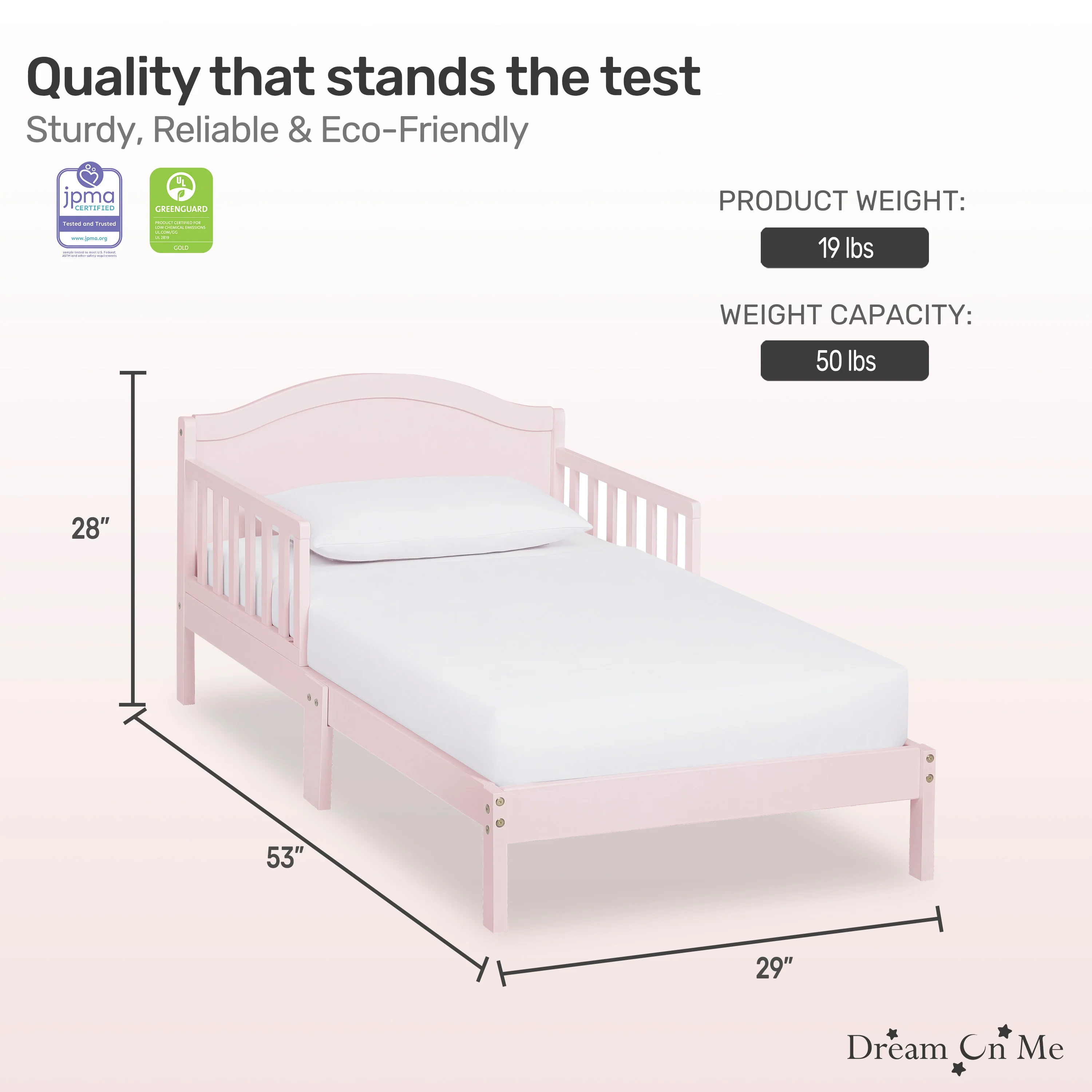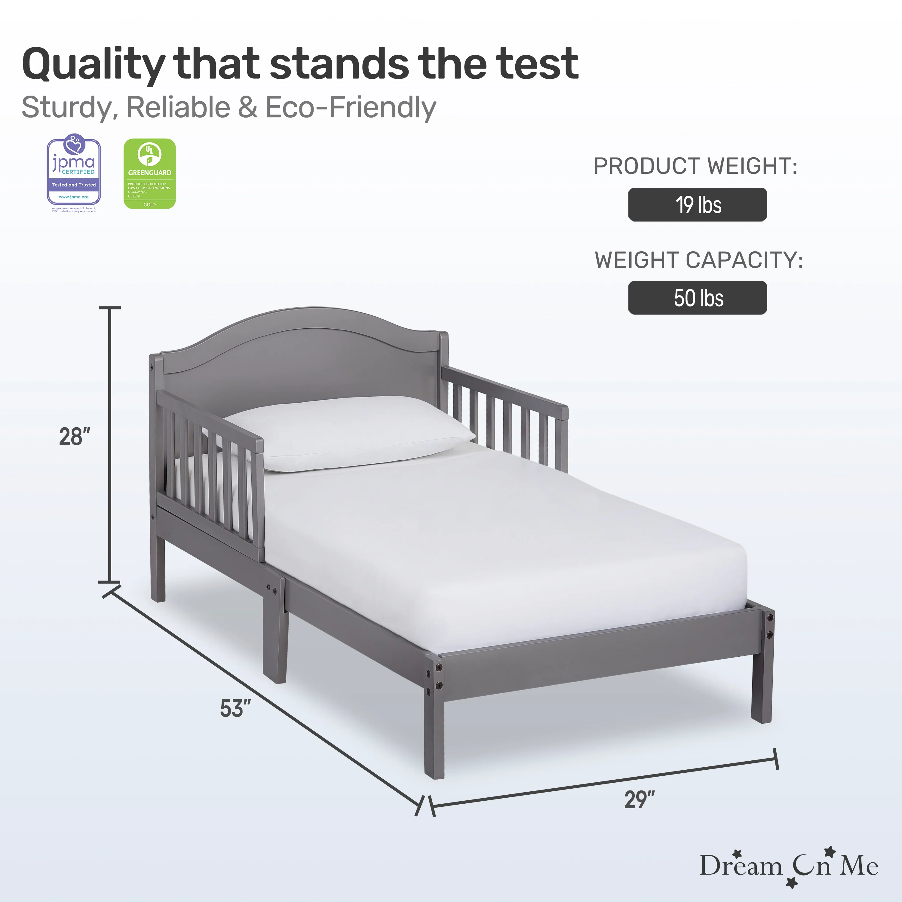 - The toddler bed is JPMA certified and designed to meet or exceed all applicable ASTM and CPSC standards. It is free of phthalates, latex, lead and BPA. Sturdy wooden slats provide mattress support