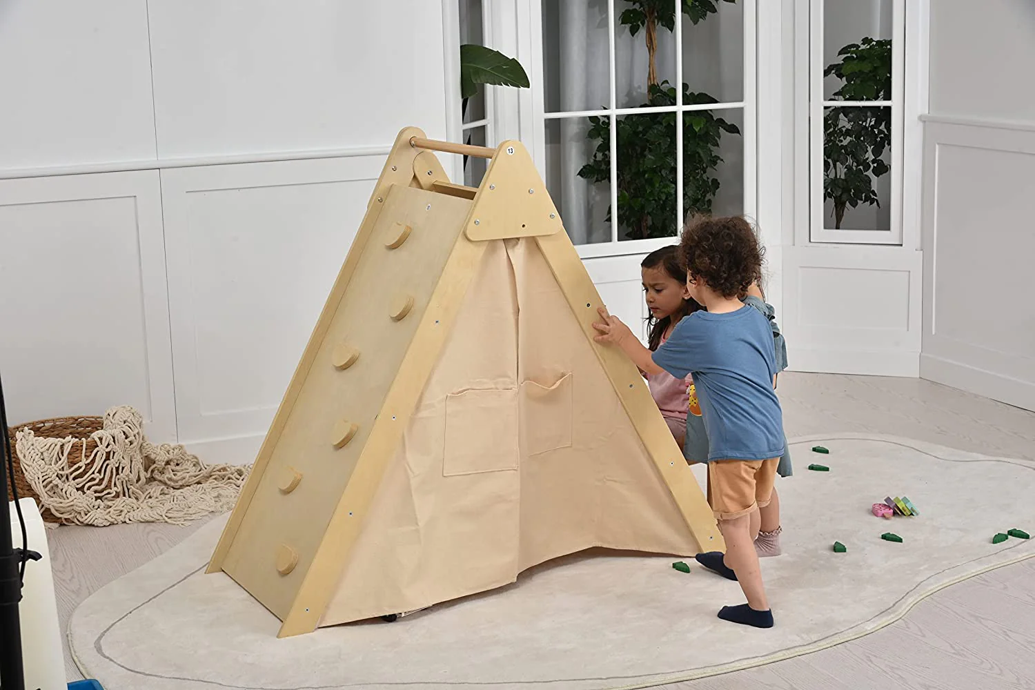 Your little ones will adore the 4-in-1 functionality, transforming from a cozy playhouse to an exciting climber, a game table, and a whiteboard for artistic expression. With ample space inside, they can indulge in imaginative play, quiet reading sessions, or socializing with friends. The adorable canvas curtains add a charming touch and are easily washable.