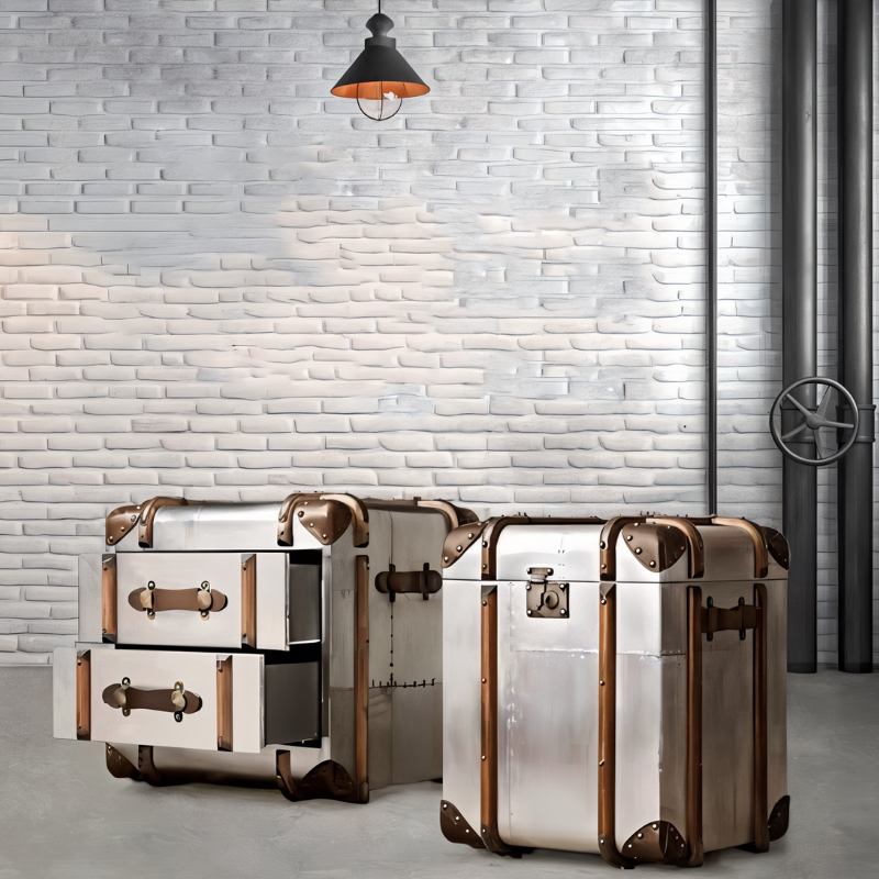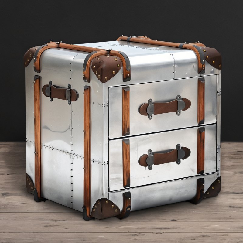 The Rover Side Table, has the look and feel of a traveler's trunk from the turn of the century. Its curved body's distressed aluminum finish gives it an industrial appearance, while the wood paneling, leather accents, and robust brass hardware harken back to an earlier time of discovery and adventure. It is a lovely complement to any interior and lends a nostalgic vibe to your living area. It provides plenty of room for storing all of your nightstand items and aids in maintaining a tidy bedroom environment. The ideal addition to your living area or bedroom is Rover.