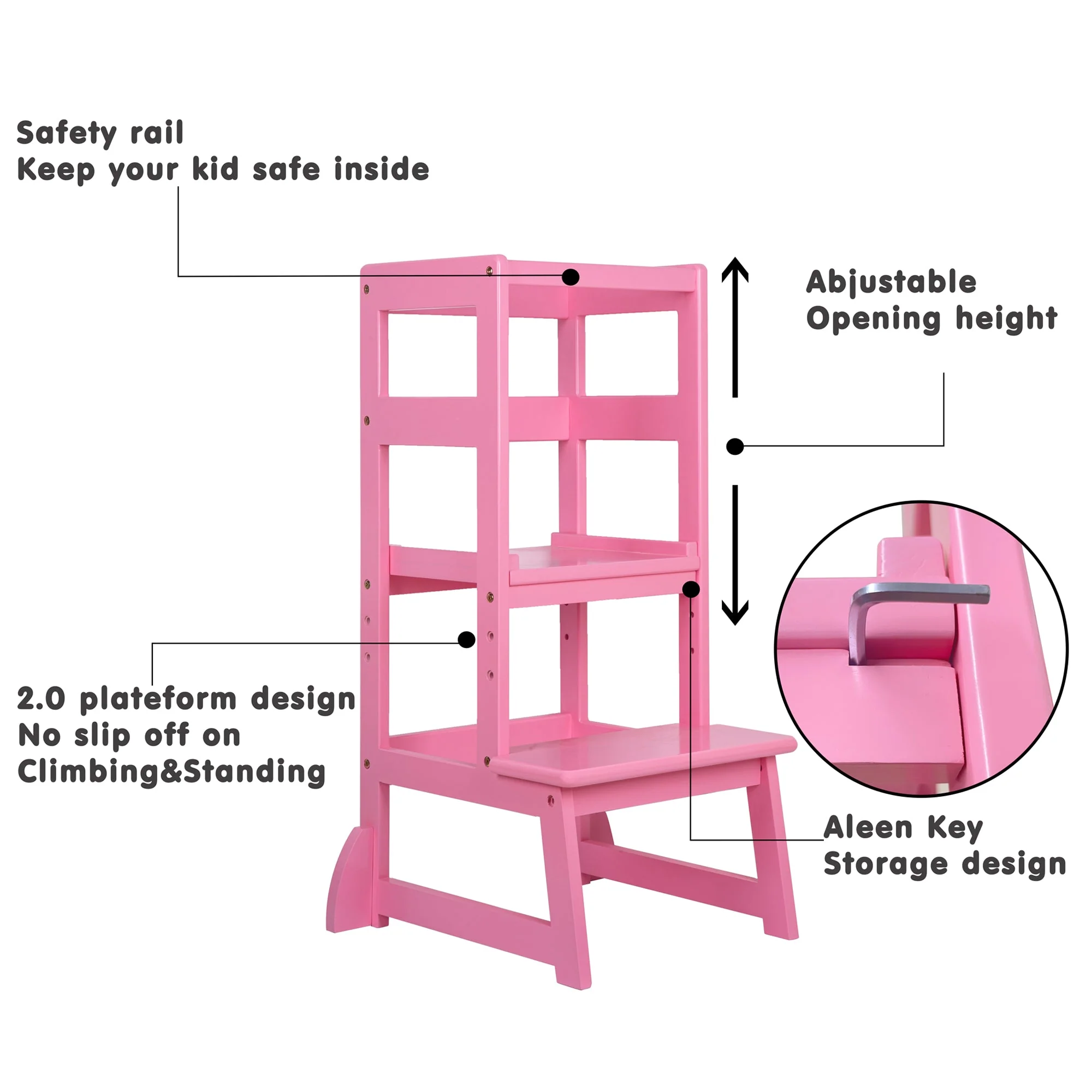 Your little tot will have lots of fun as they grow with the adjustable stool. The grow-up design adjustable height can be changed to accommodate children from 1 to 3 years of age, and the 4-sided railings ensure they stay safe as they use the stool. Great for learning in the kitchen, the stool can also be used to reach the sink in the bathroom, or help fold clothes in the laundry room. Easily move the kid's ladder around the house to make them feel more important and involved with what you're doing.