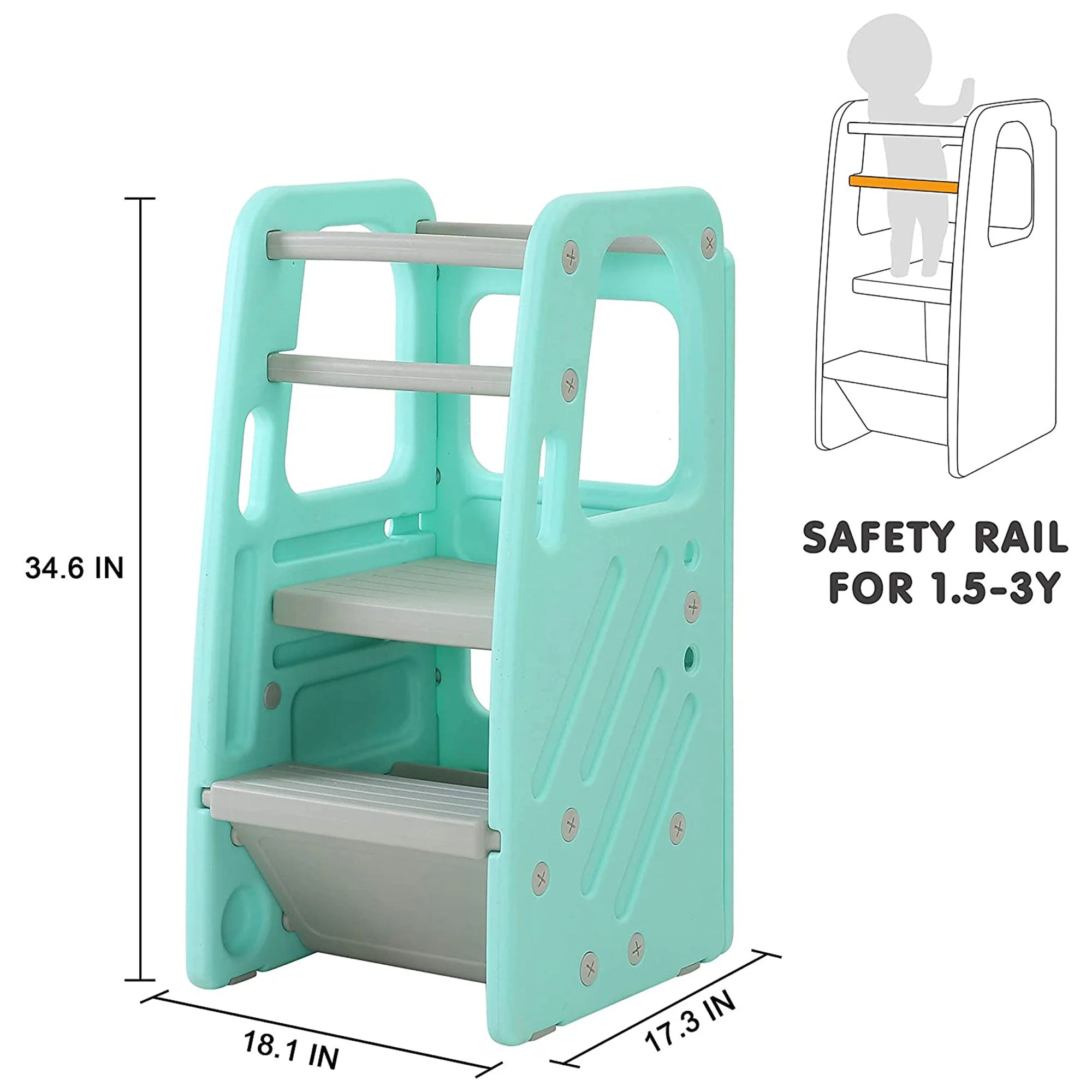 Featuring high guard rails and a wide standing area, this learning stool allows your toddler to reach countertops and other high surfaces in a controlled way that keeps them safe. Adding this stool to your child's life is a fun and safe way to acquaint them with chores, cooking, bathroom tasks, and more. Toddlers can learn independence and how to be a helping hand around the house thanks to this impressive stool.