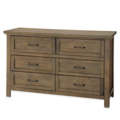 The Westfield 6-Drawer Dresser by Westwood Design is perfect for creating a farmhouse-style nursery. Constructed with charming accents such as rustic hardware and a distressed finish, it is ideal for storing baby items, clothes, bedding, and more.