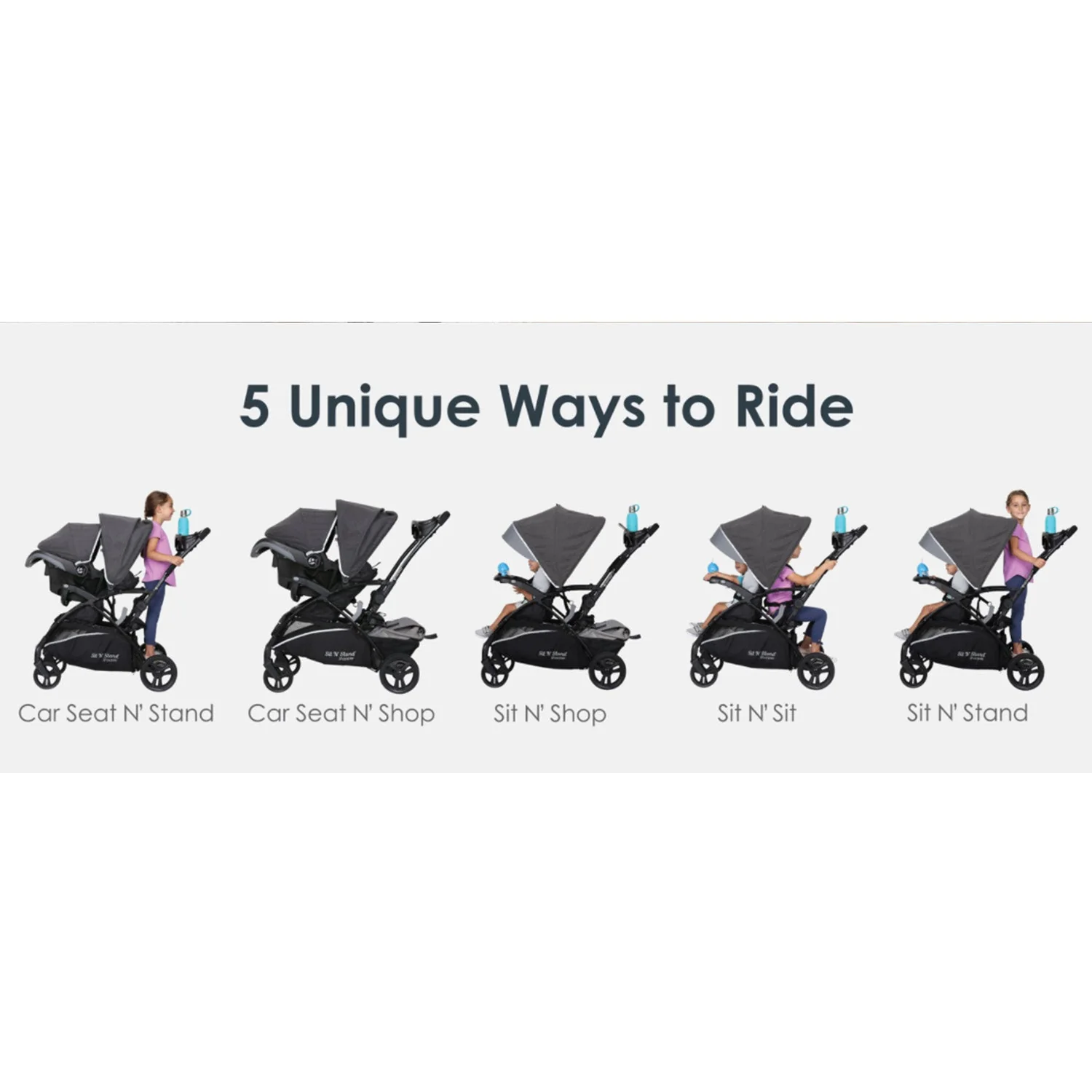 • 5 ways would be Car Seat N' Stand, Car Seat N' Shop, Sit N' Shop, Sit N' Sit, and Sit N' Stand