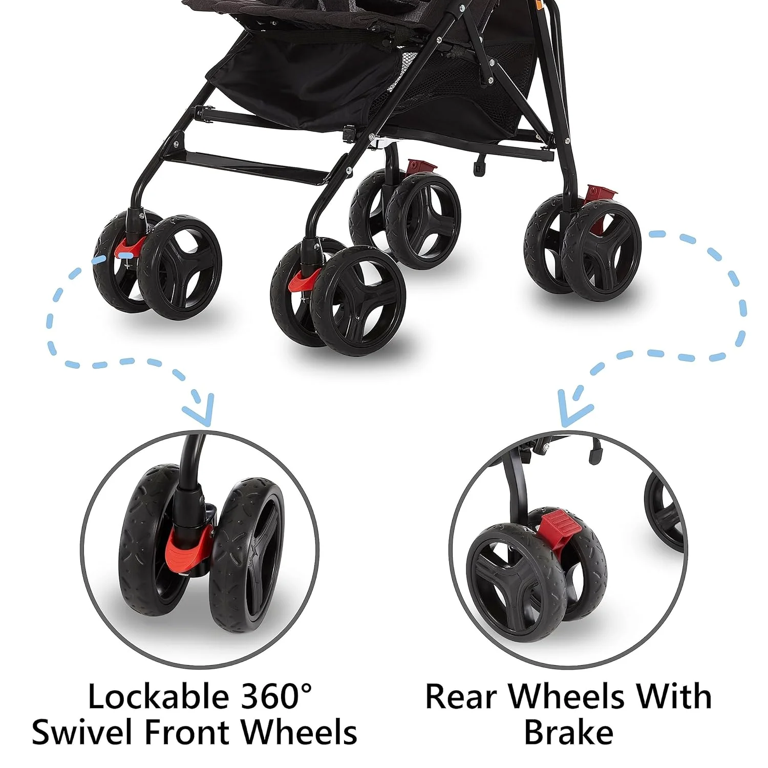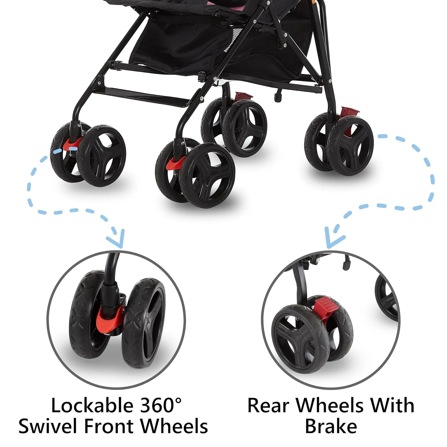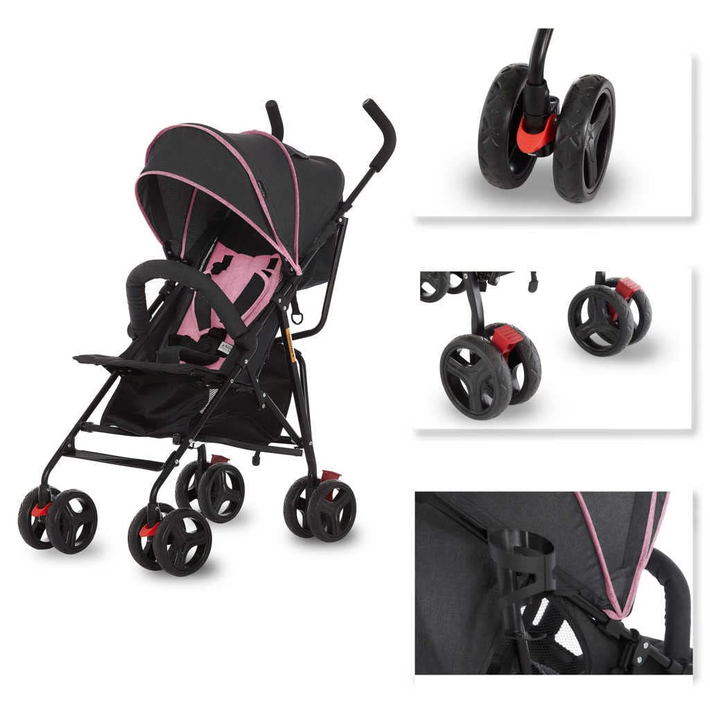 • Comes with a padded 5-point harness system, rear wheel brakes and swivel front wheels for a smoother ride over bumps, which lock in, when straight.