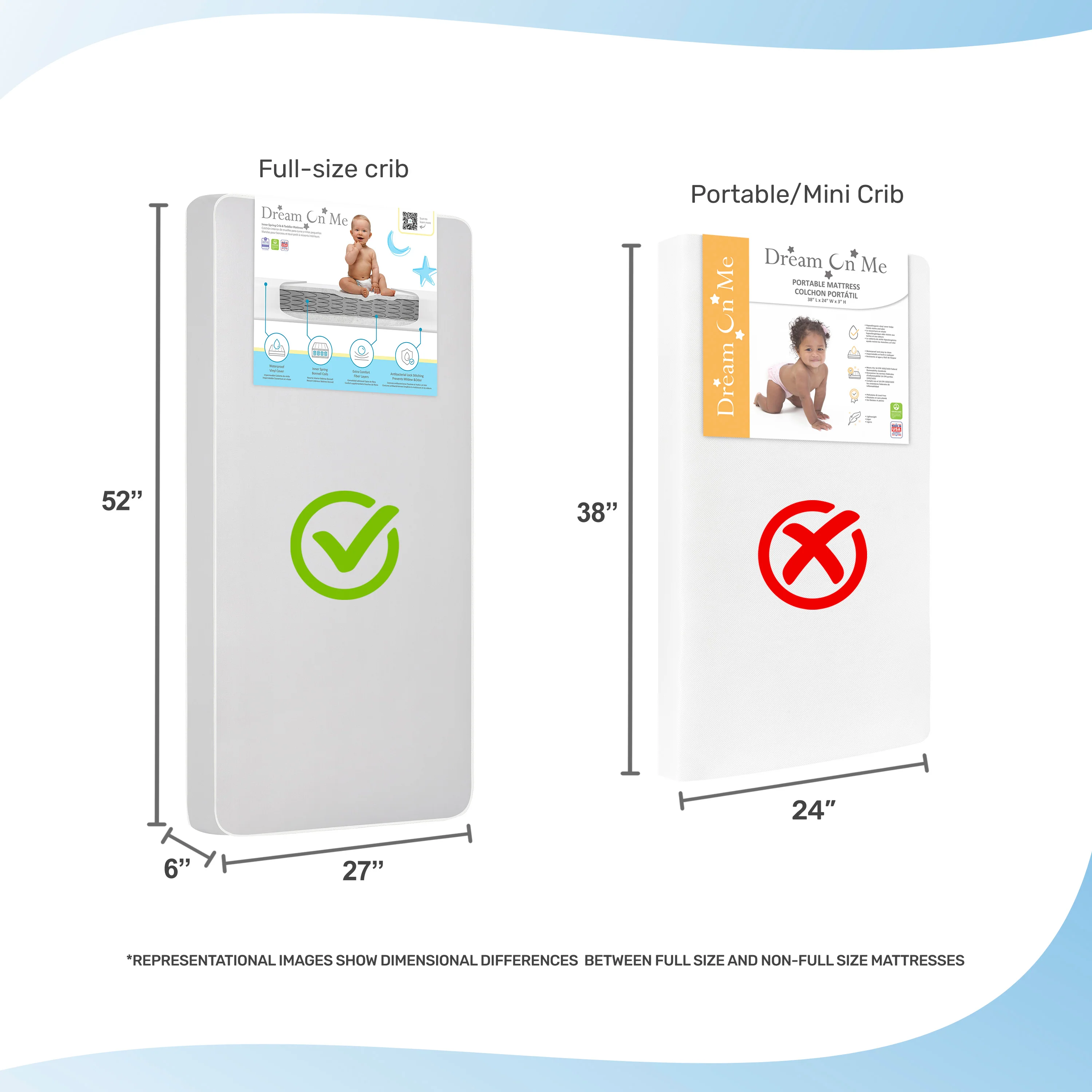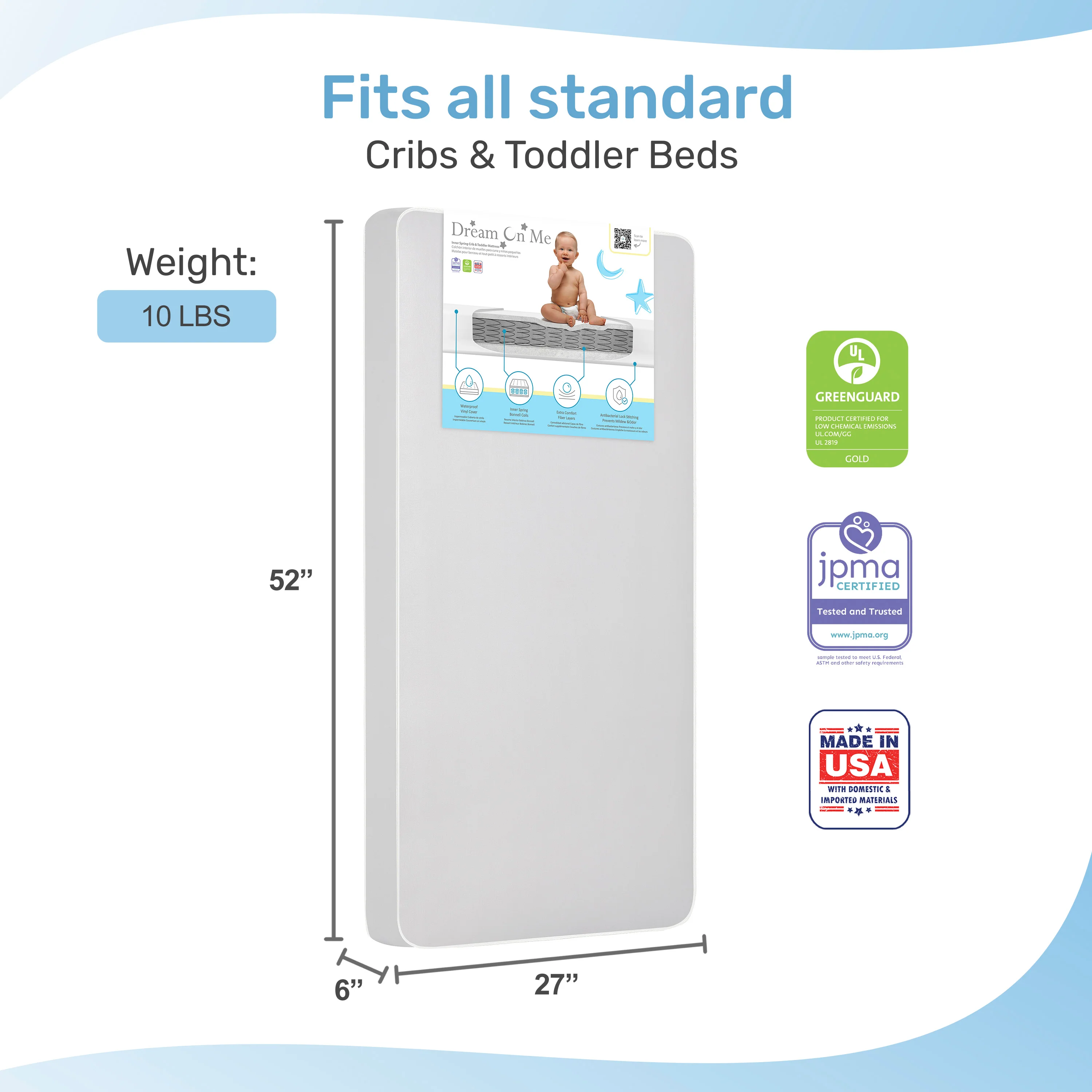 The Dream On Me Nirvana 6” 96 Coil Inner Spring Crib And Toddler Mattress is all about unparalleled safety, comfort and durability. Made in the USA, this mattress is Greenguard Gold certified and meets/exceeds all flammability (16 CFR 1632/1633), phthalate, lead & toxicity tests. It is constructed with a layer of fire blocker and comes with a 10-year manufacturer warranty. The Dream On Me Nirvana 6” 96 Coil Inner Spring Crib And Toddler Mattress creates a firm sleeping foundation for your child courtesy a core of 96 interwoven, heat tempered, spring steel coils. Comfort is assured with the protective polyurethane foam wrap on either side. The reinforced waterproof cover locks out moisture and stains while the metal-free airflow pockets ensure freshness. To clean, simply wipe with soap and water. Durable features like a fiber insulating layer and lockstitch waterproof binding make the Dream On Me Nirvana 6” 96 Coil Inner Spring Crib And Toddler Mattress a long-term investment, suitable for both standard size cribs and toddler beds