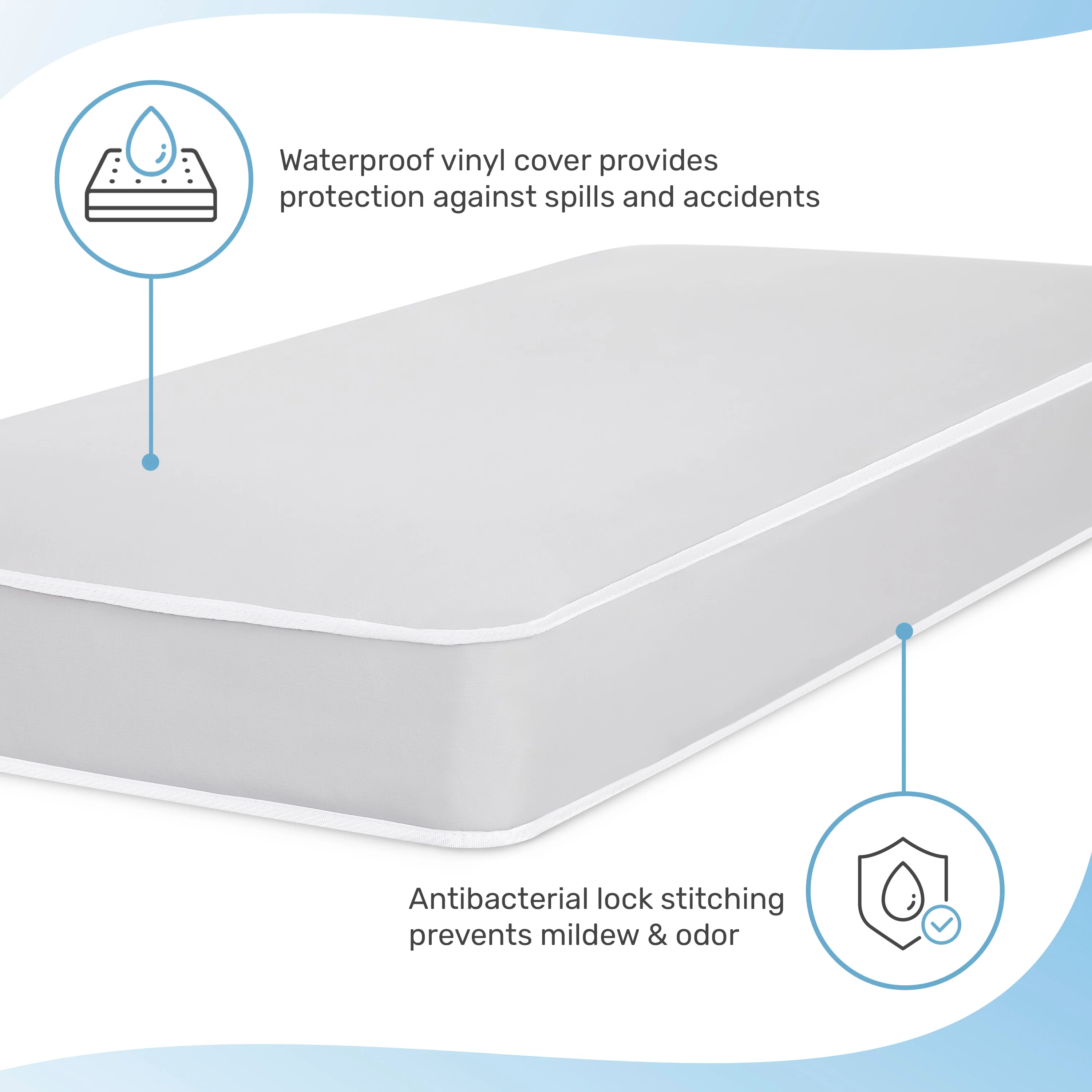 - LOCKS OUT DAMPNESS: The reinforced waterproof cover keeps stains and moisture at bay. Metal-free airflow pockets ensure freshness. It comes in a vinyl cover with a blue cloud and baby print.