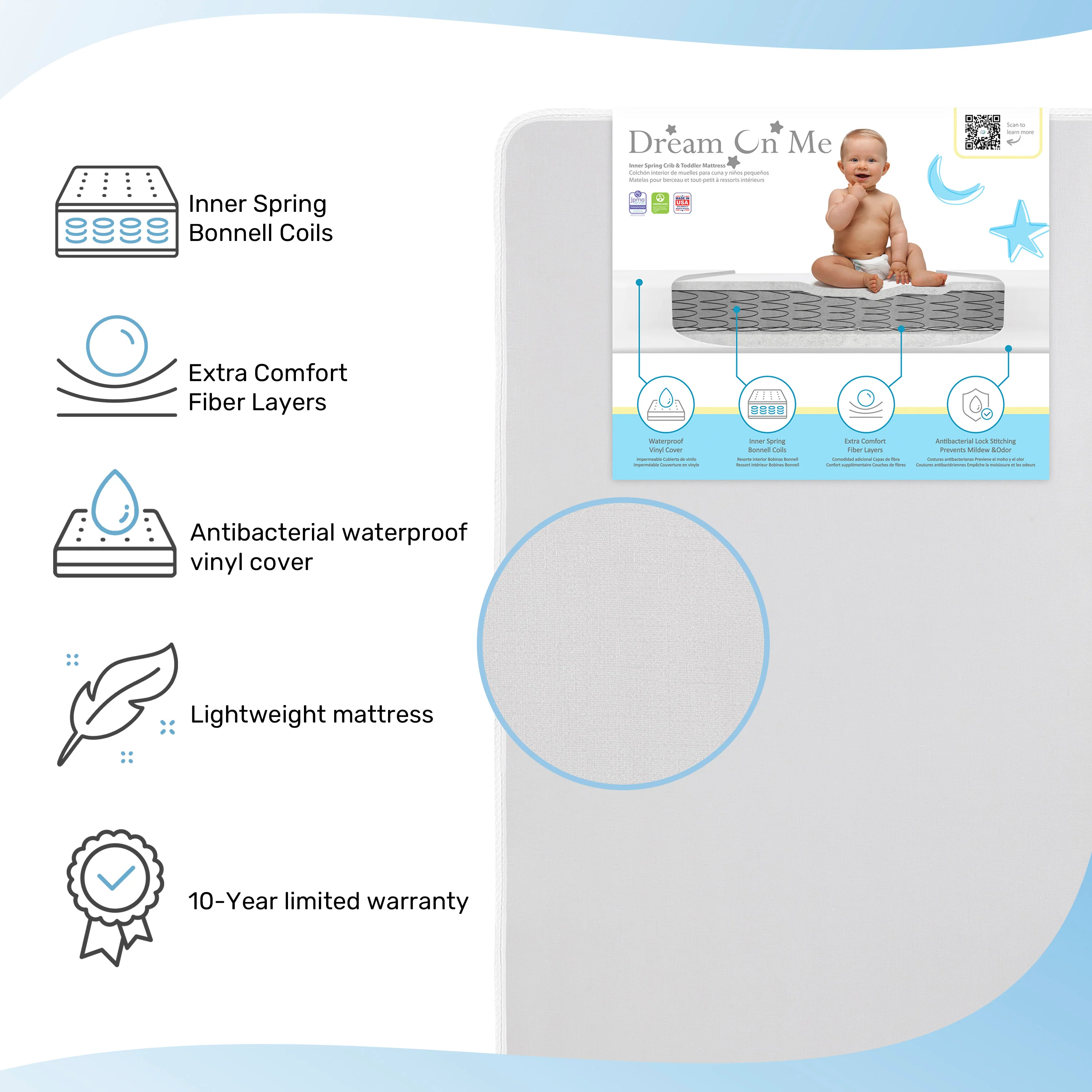- Lightweight; 96 interwoven coils; hypo allergenic, waterproof cover; Phthalate and lead free