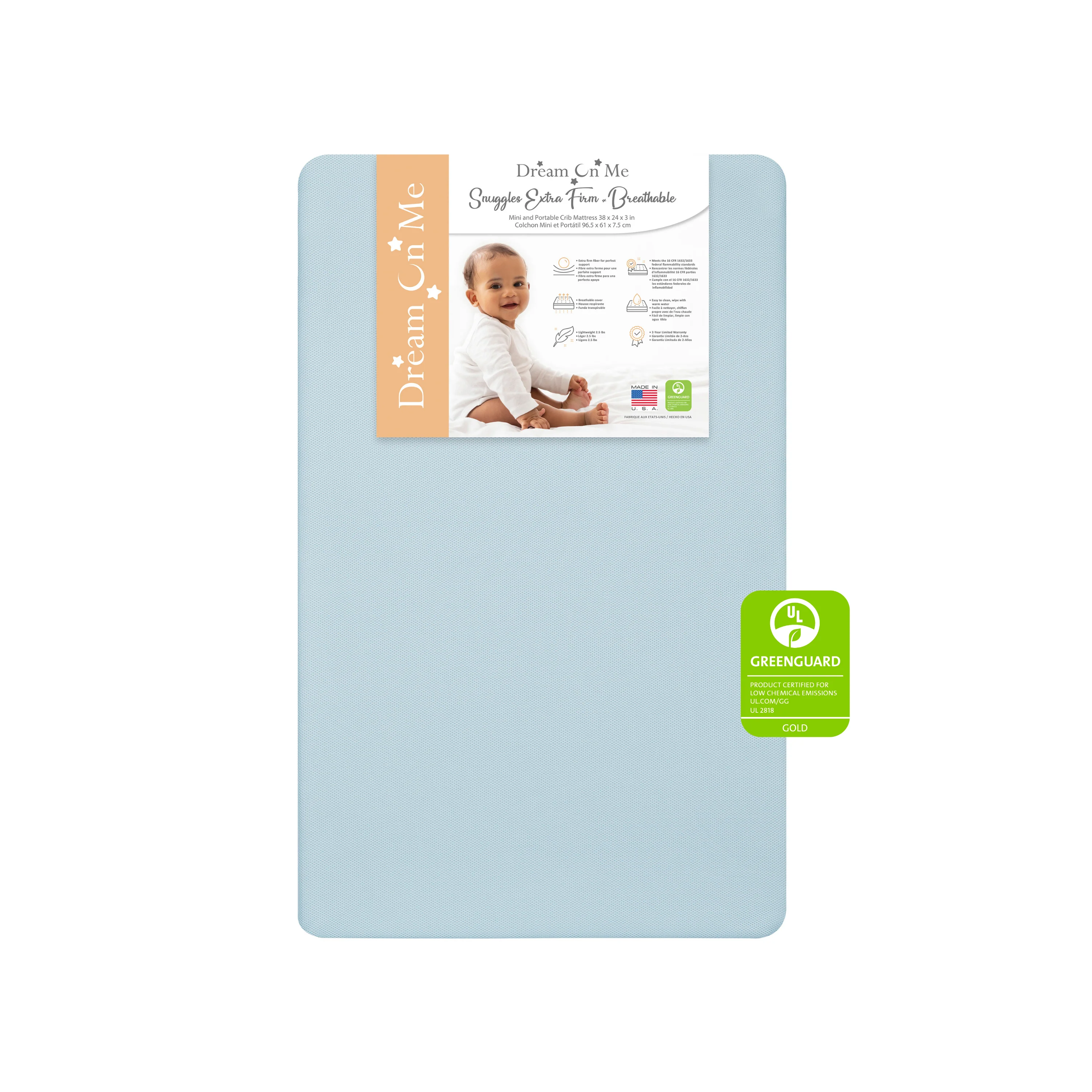 - The Dream on Me Snuggles Potable Crib Mattress is proudly made in USA with quality workmanship. Ideal for most portable/mini cribs and is not meant for playards with dimension 38L X 24W X 3H inches.