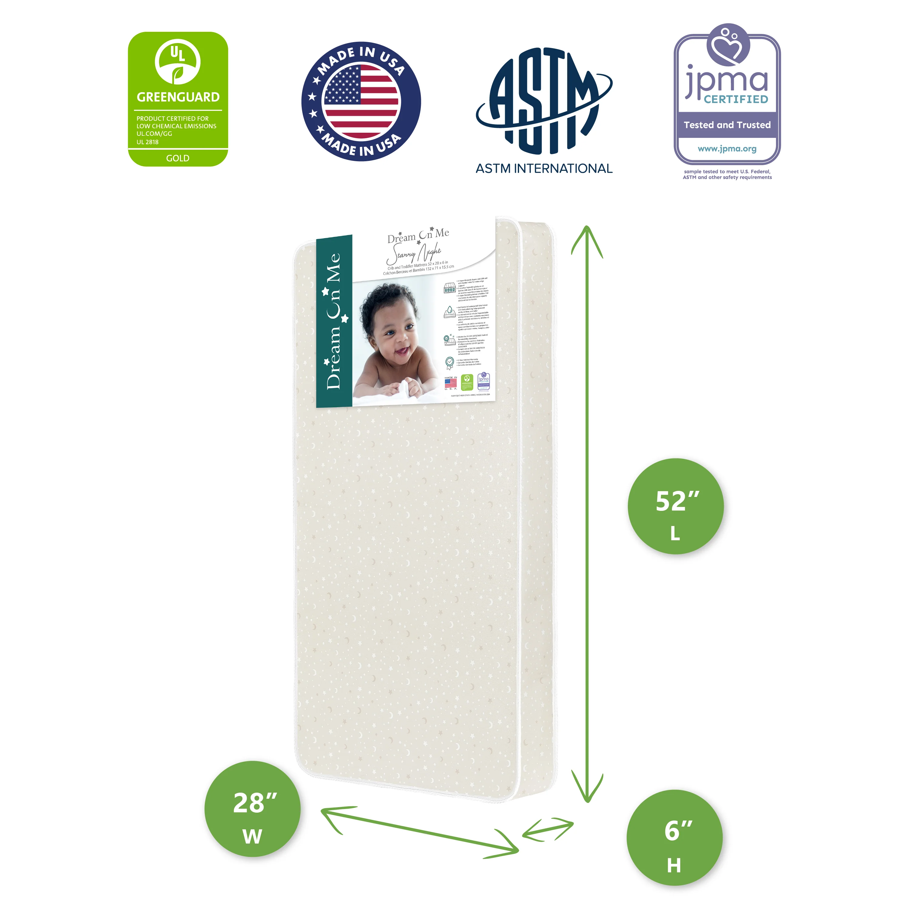 - Proudly made in the USA, the Crib and Toddler Mattress comes with a 5-year limited warranty as well as a JPMA & Greenguard Gold Certification.