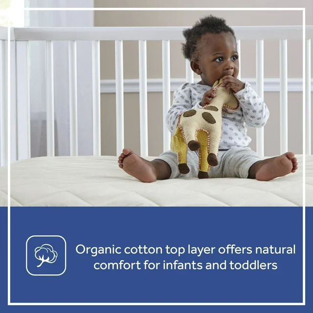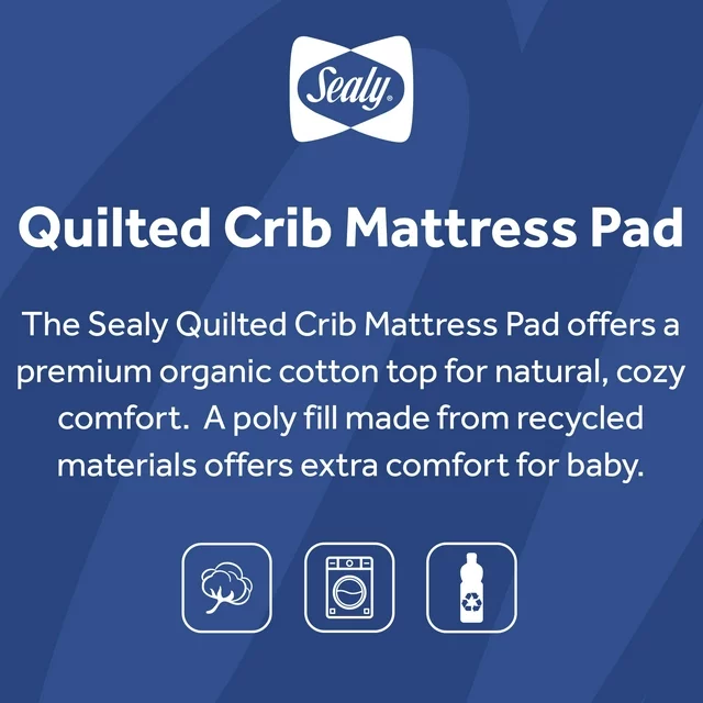 The Sealy Quilted Crib Mattress Pad offers a 100 percent organic cotton top for natural softness. Hypoallergenic, easy-clean polyester filling provides additional cushioning and comfort for baby, with just the right amount of plush softness to maintain a flat sleeping surface for infant safety.