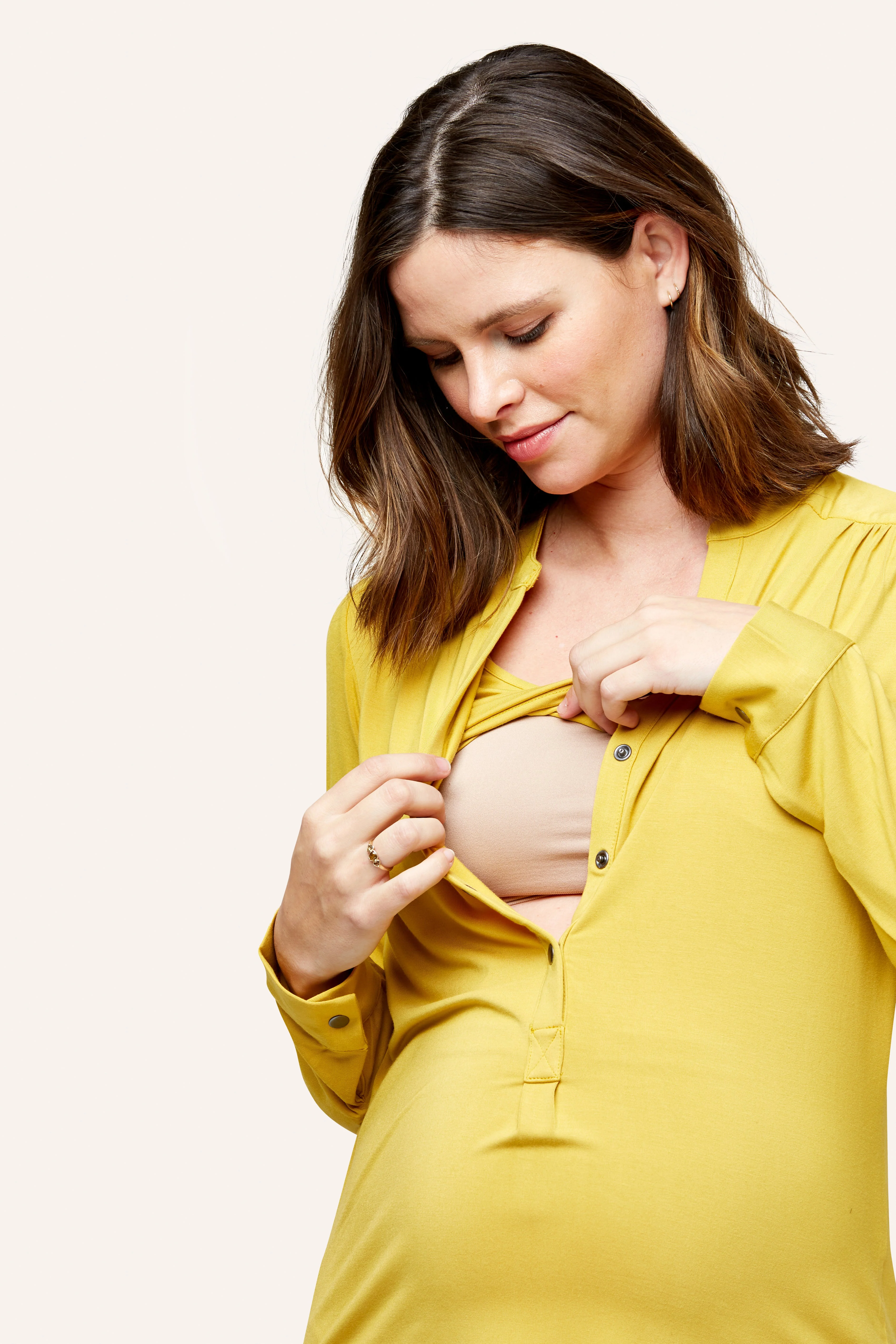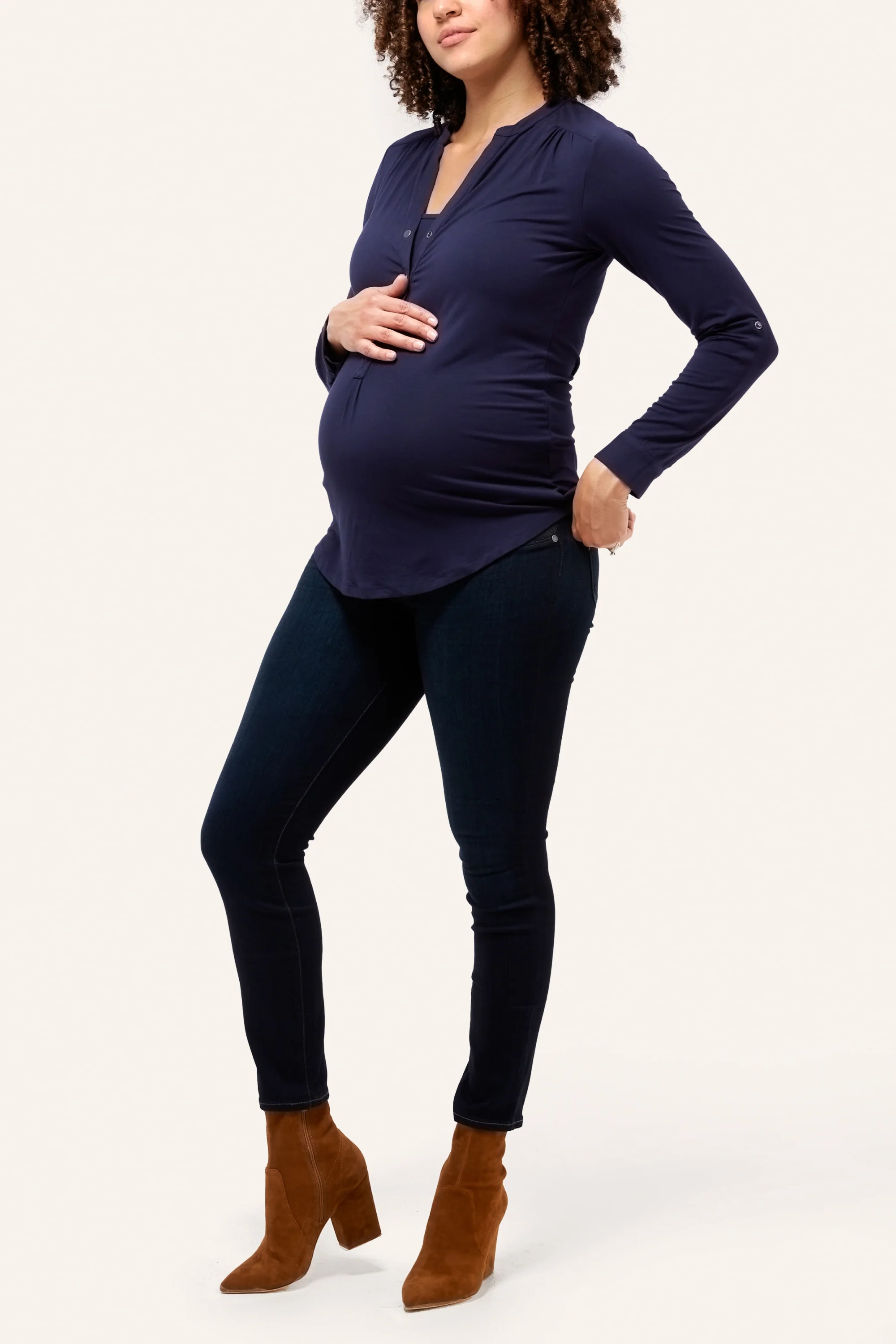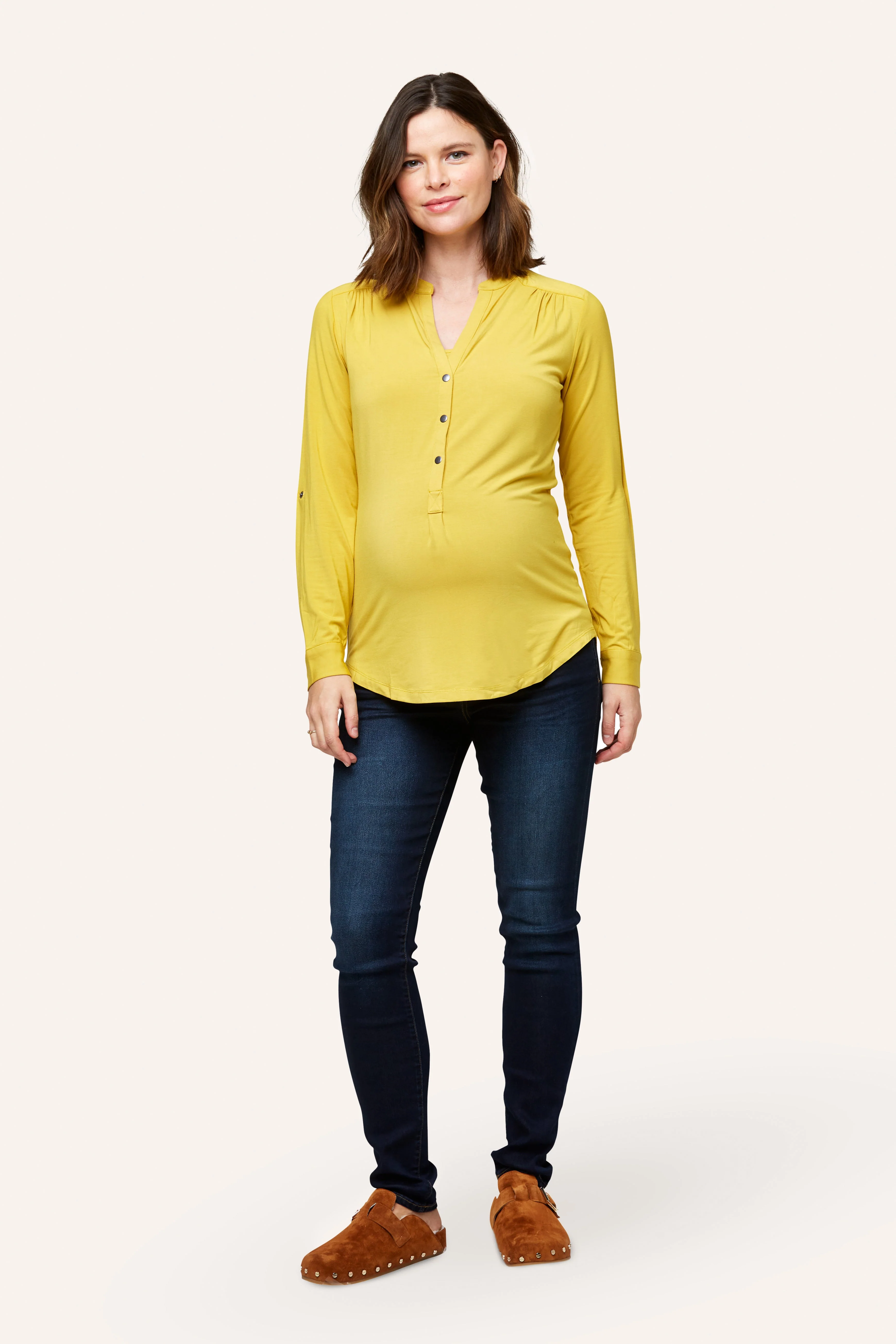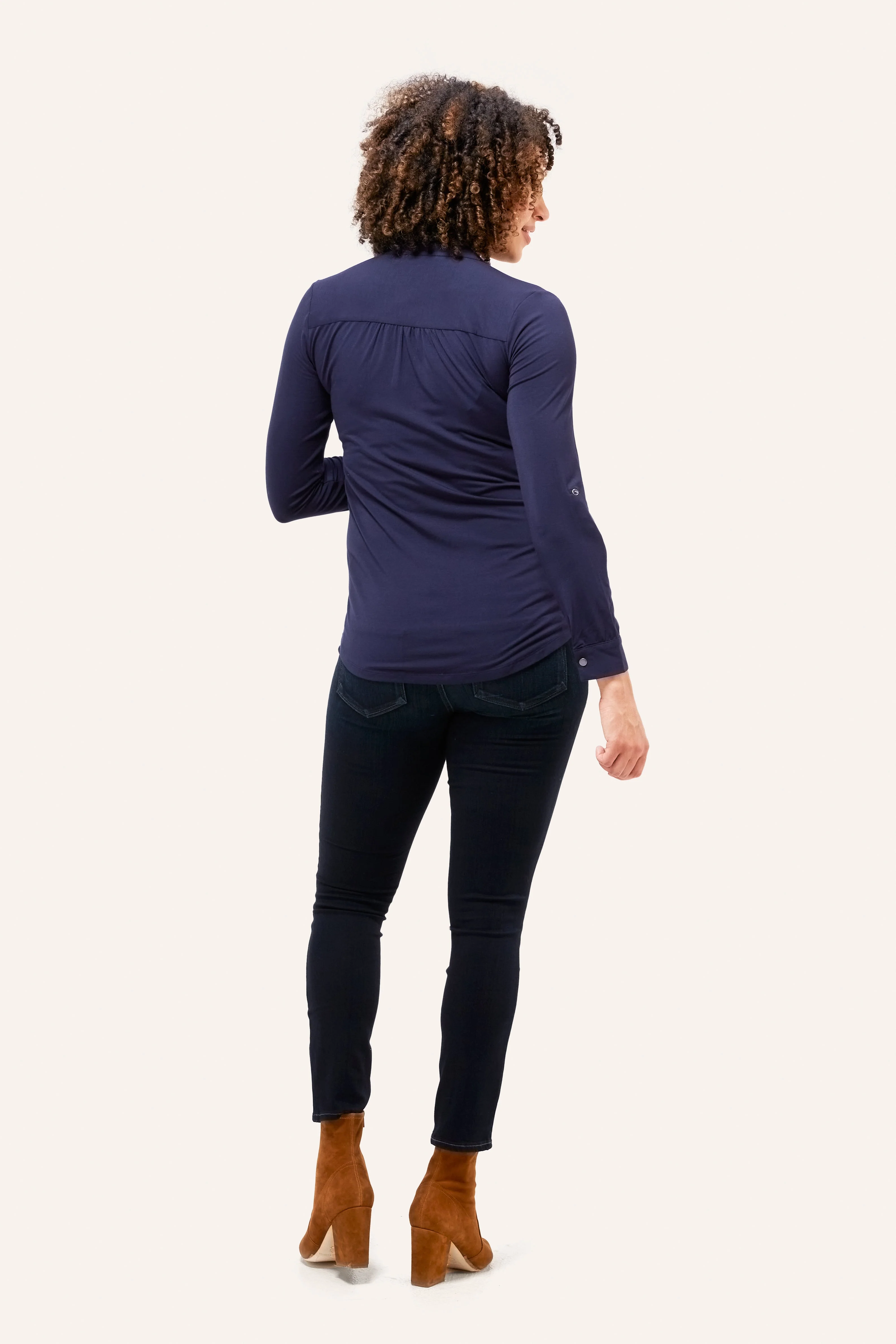 Designed to flatter all body shapes and sizes, the Amelie has a shirttail hem, button tab roll-up sleeve and hidden nursing modestly layer that make it a maternity AND nursing everyday favorite. We recommend picking one up in every color. Added length for a flattering fit through all trimesters (and after).