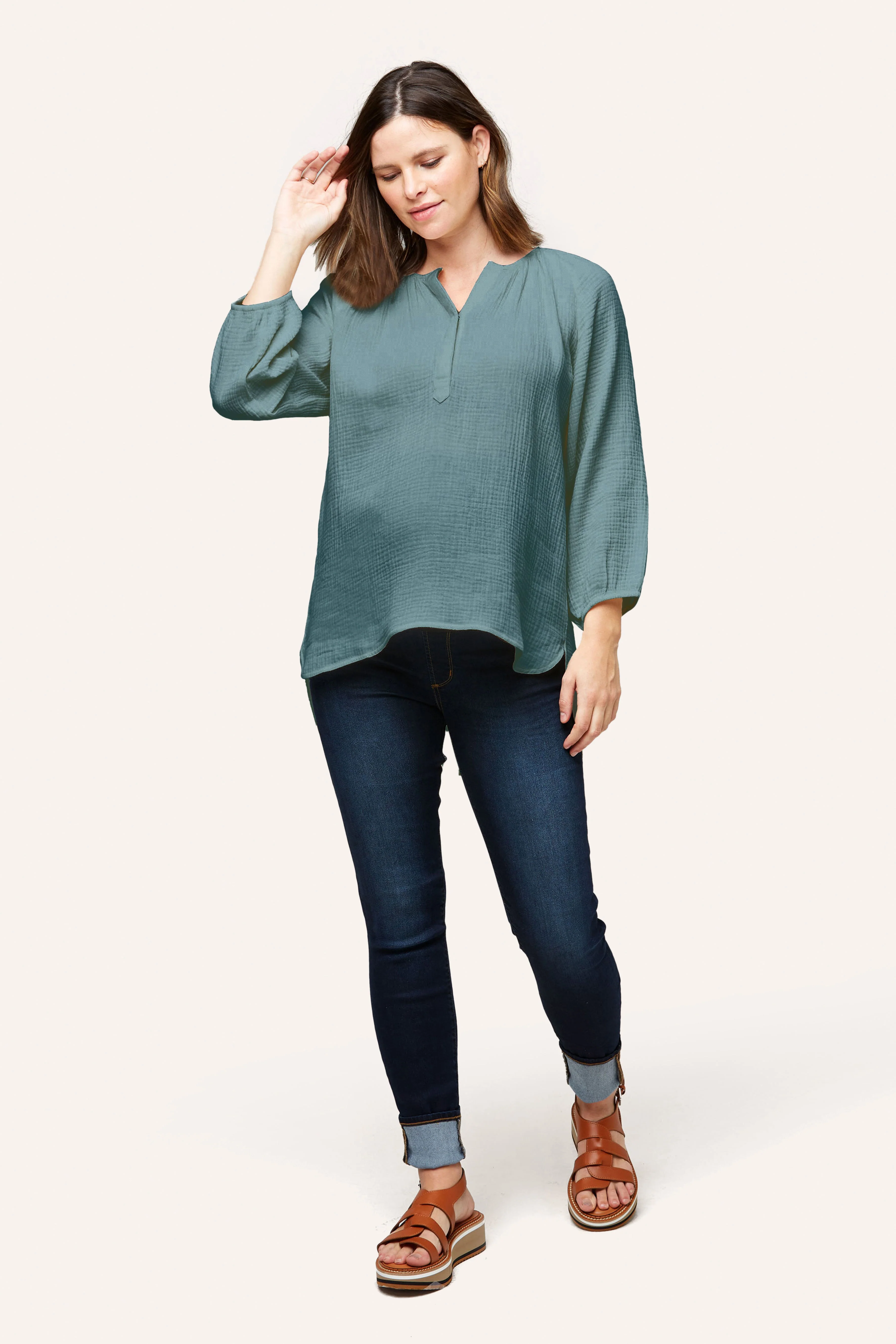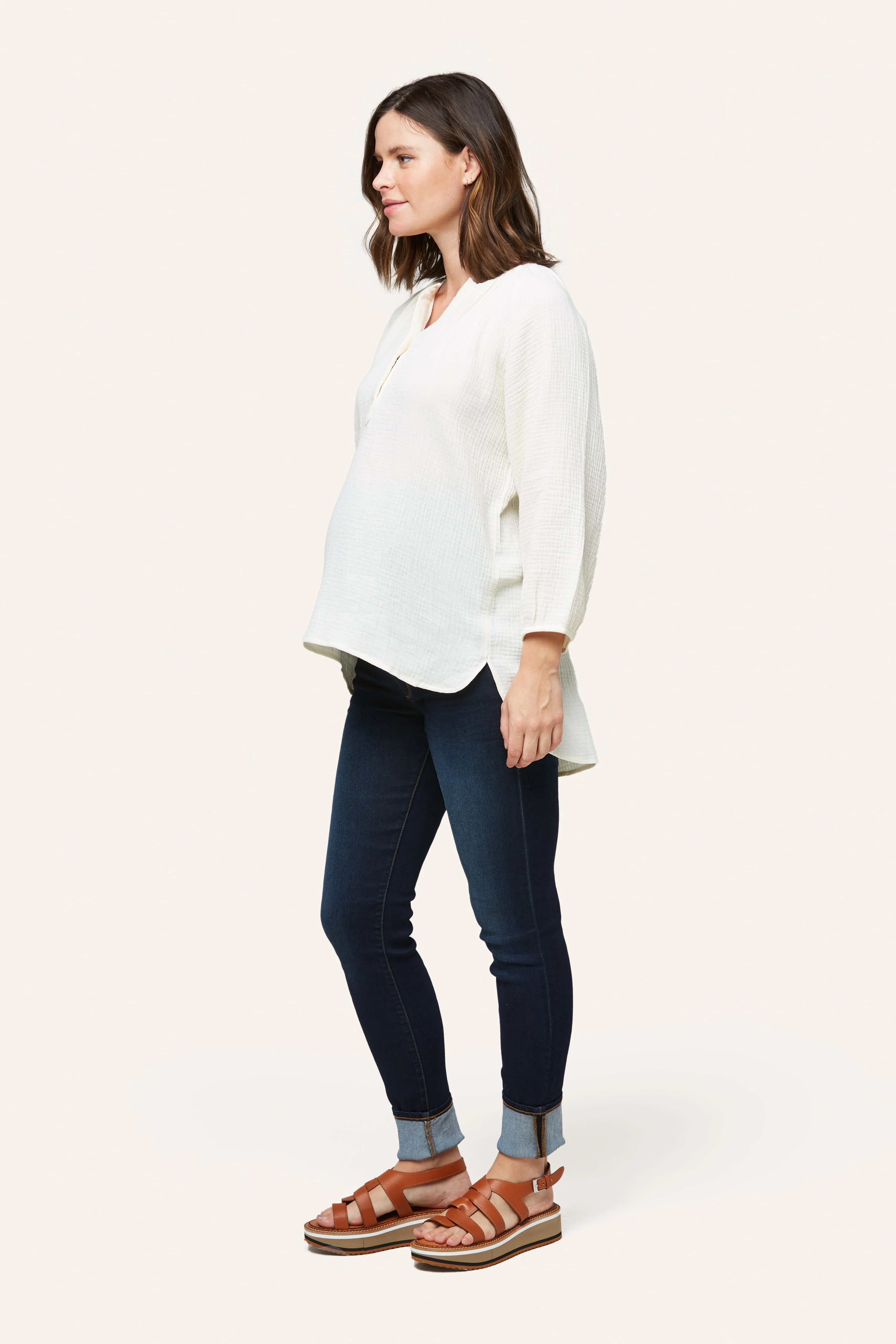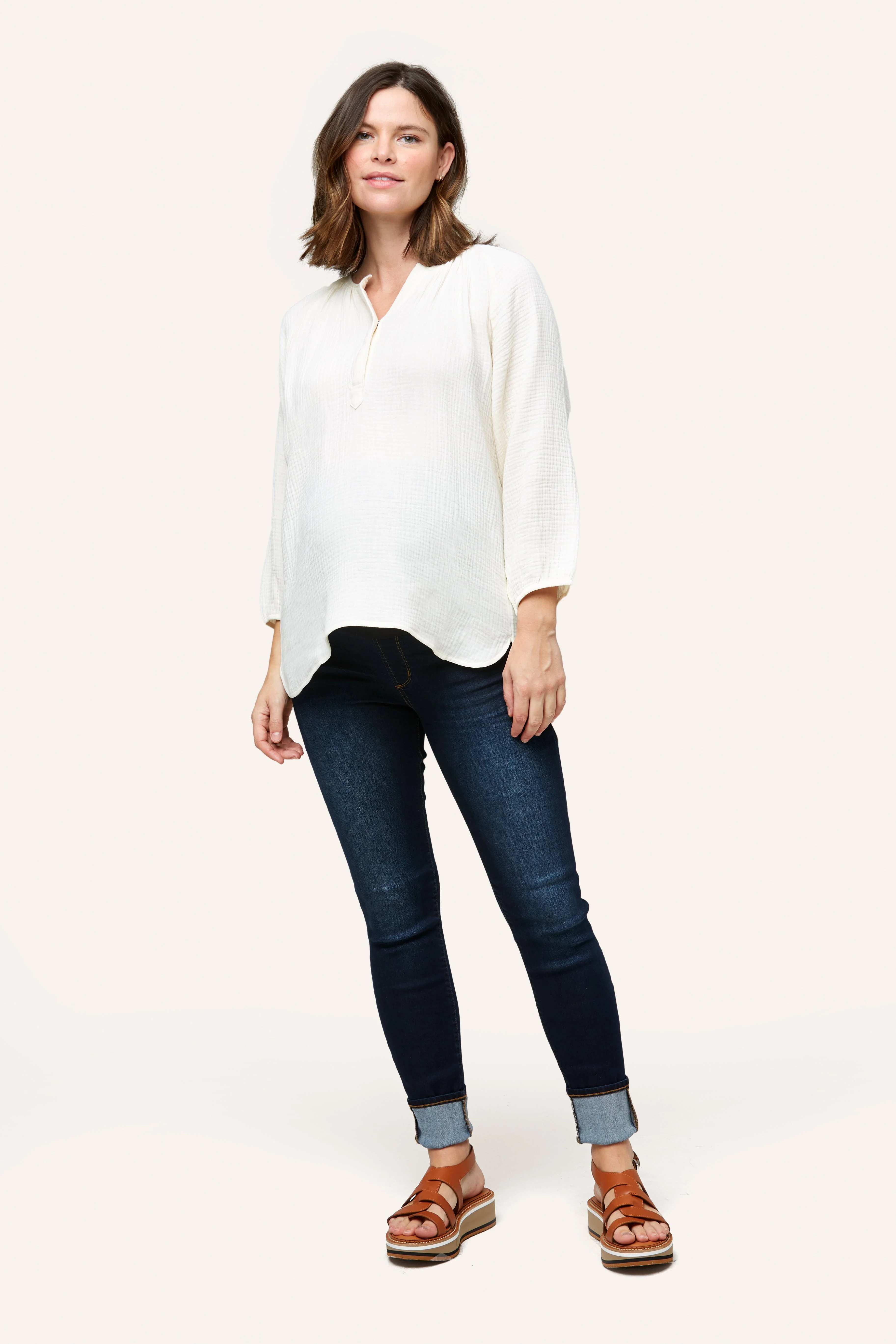 The Ava is one of our favorite easy tops for maternity + nursing. Designed in 100% cotton double layer gauze, Ava features a snap placket for easy nursing access and cute shirt tail hem. We made her a little longer for that easy style paired back to leggings, shorts or denim. Pair with our cotton gauze pants and shorts (Remy Pant or Berlin Short) for that super cute summer set.