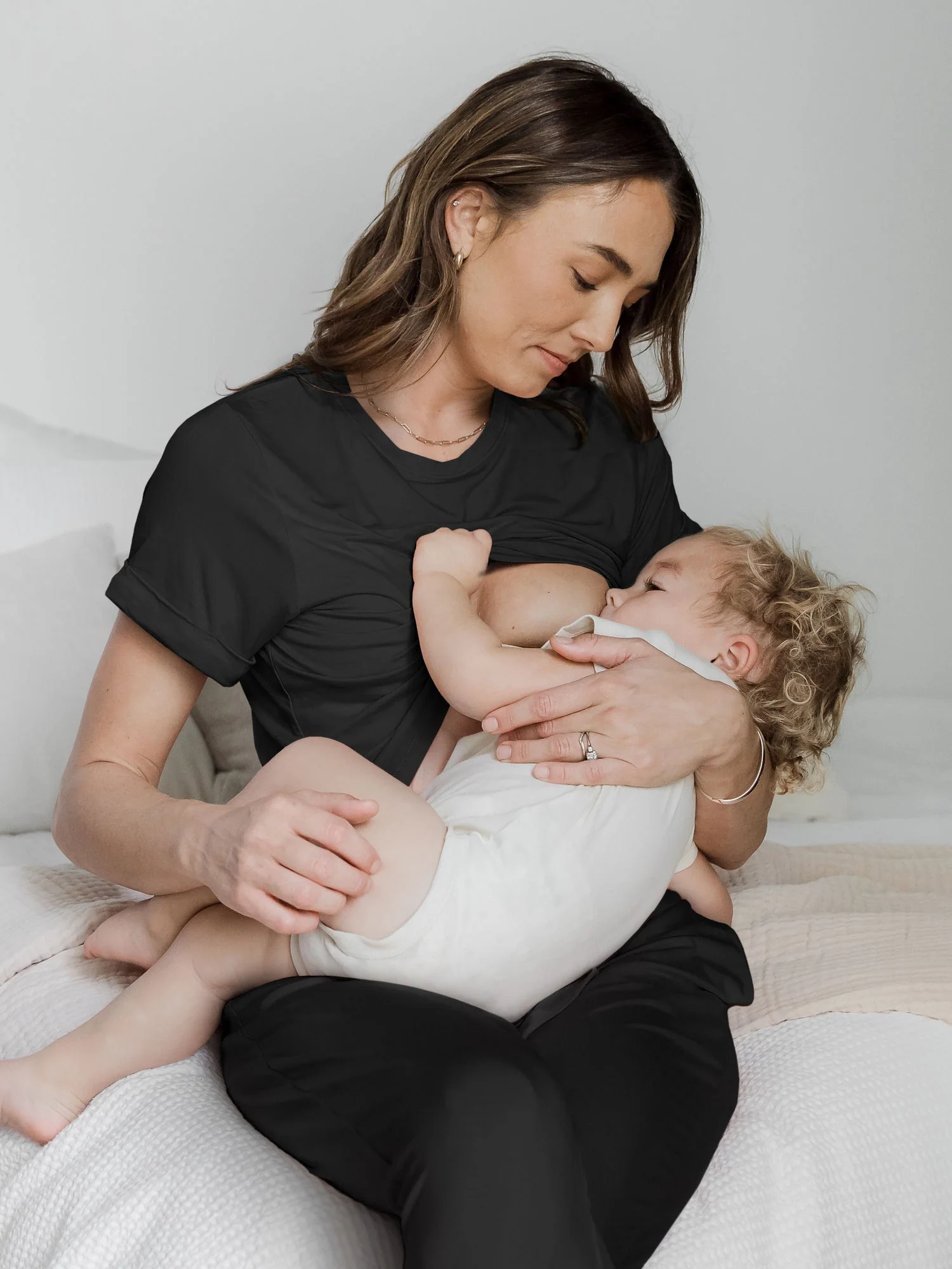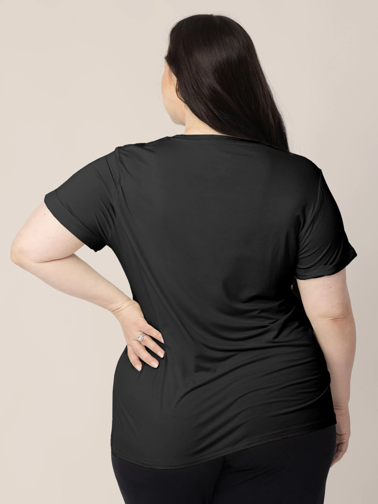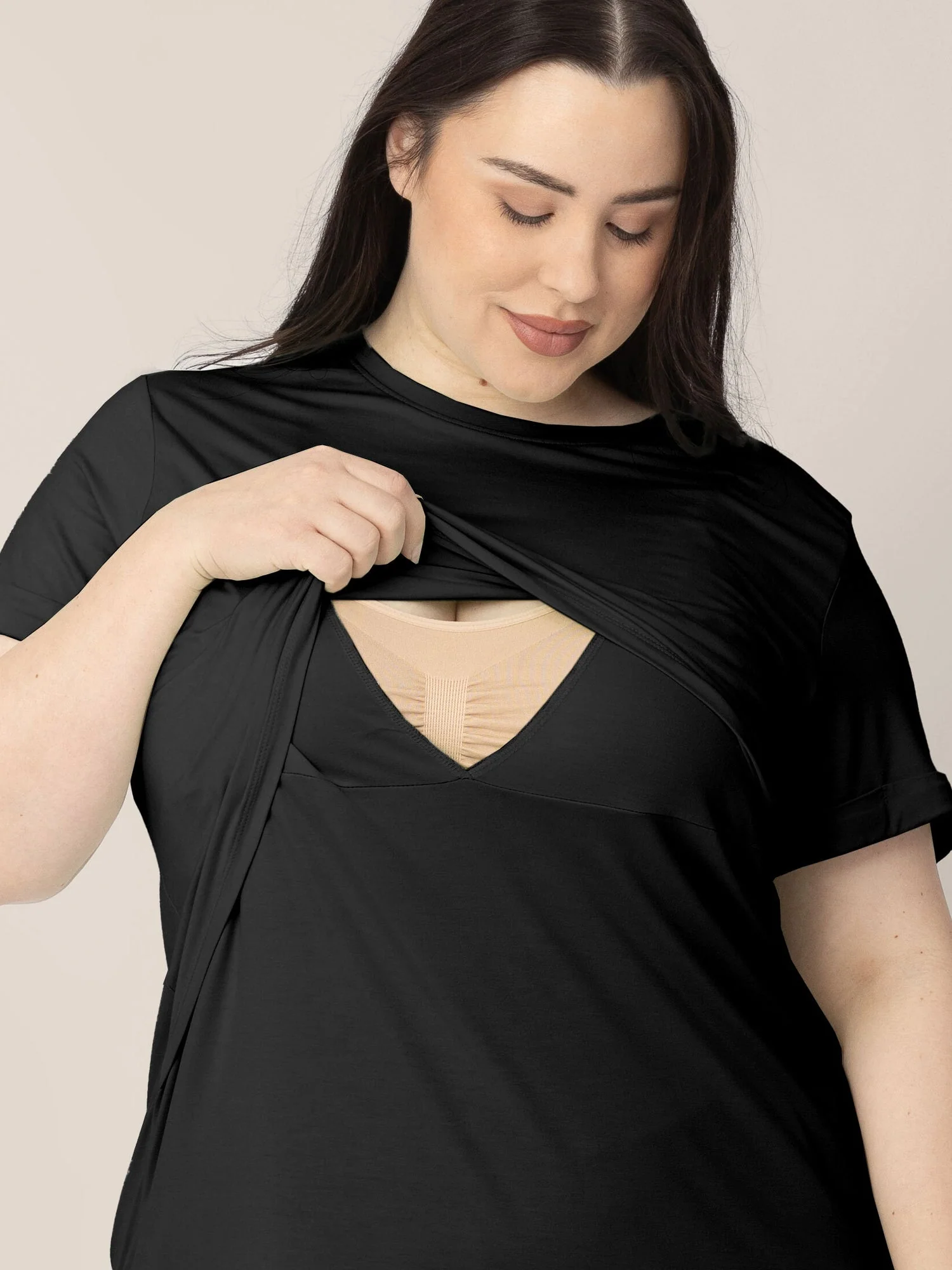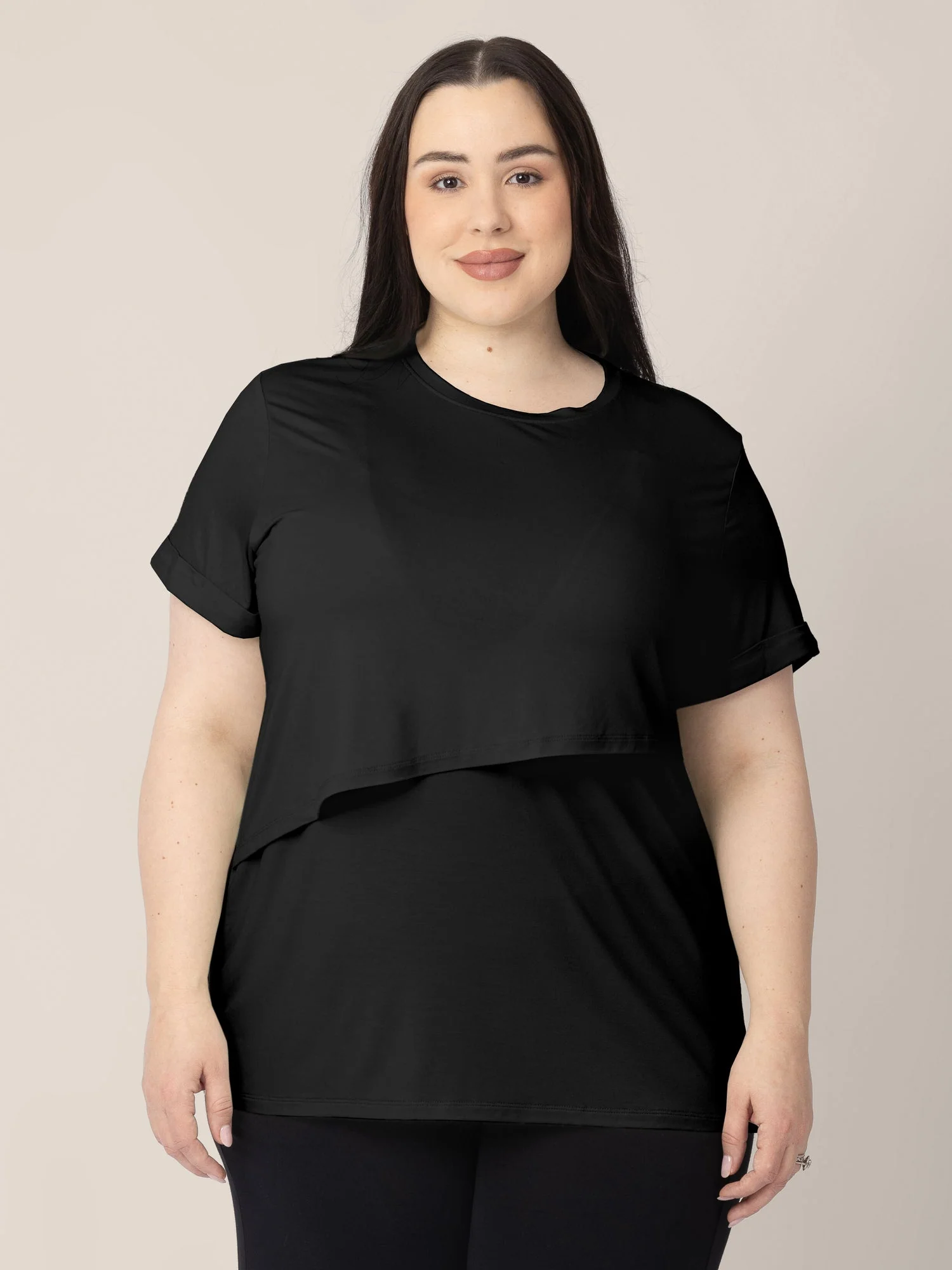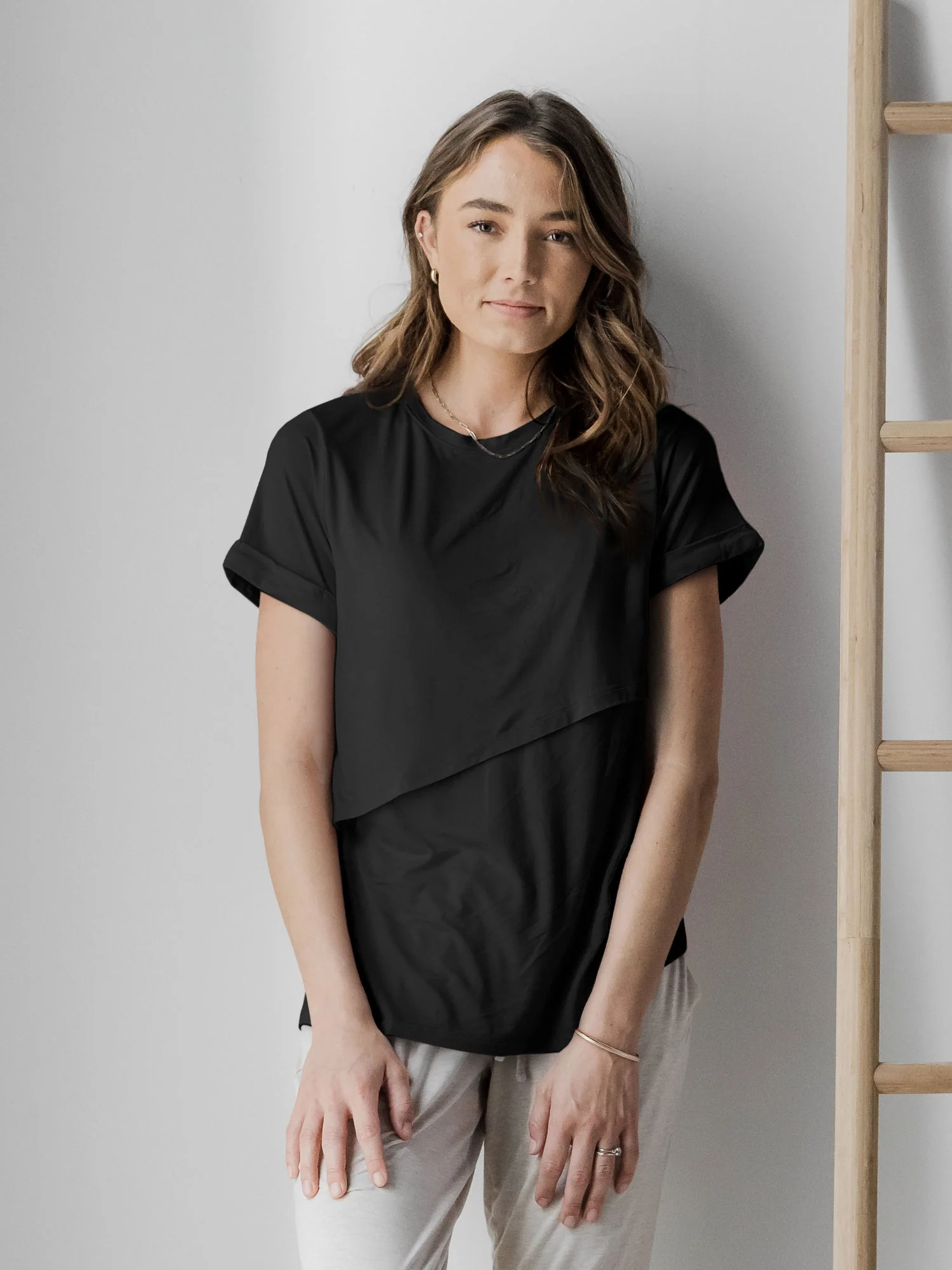 The staple nursing tee you need for spring and summer! This super-soft, breastfeeding-friendly shirt has a relaxed drape and discreet nursing panel - ideal for feeding on the go. For breastfeeding access, lift up the asymmetrical nursing panel and pull aside the inner V-neck layer. With a modern fit, flattering crew neckline, and decorative cuffs, this short-sleeve nursing shirt pairs perfectly with jeans, joggers, or leggings.
