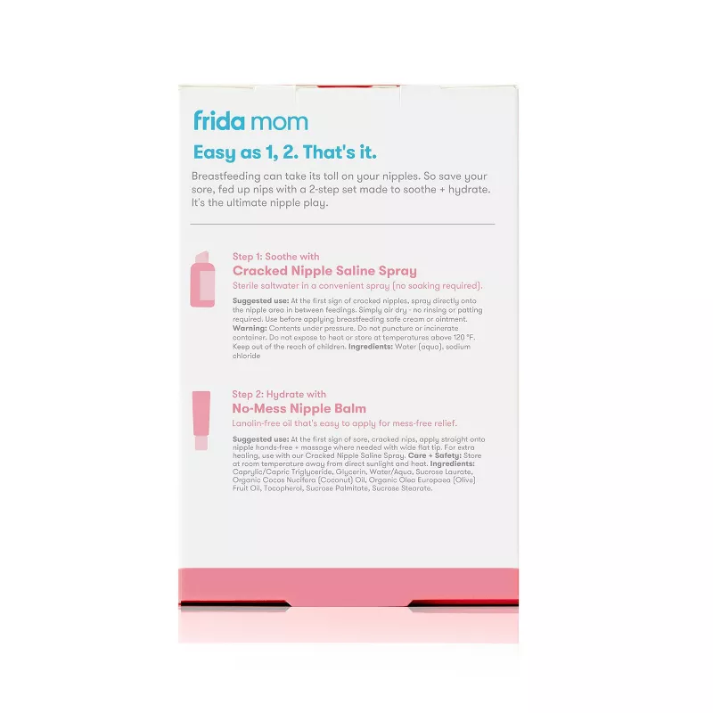 Save your sore, fed up nipples with the 2-step Sore Nipple Set from Frida Mom. Includes a 2 fl. oz. cracked nipple saline spray and a 1.5 fl. oz. no-mess nipple balm to soothe and hydrate. Safe for your baby's lips.