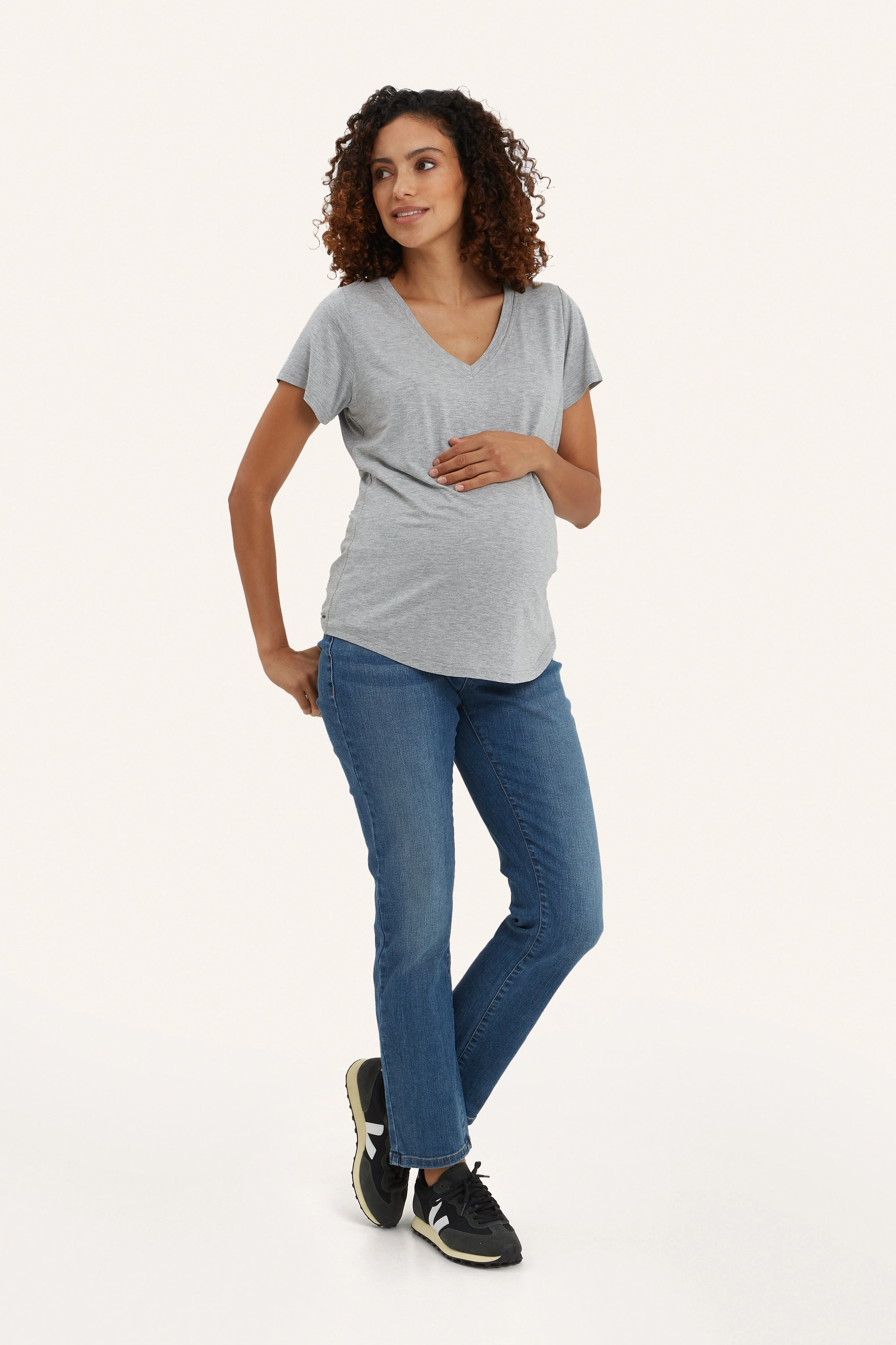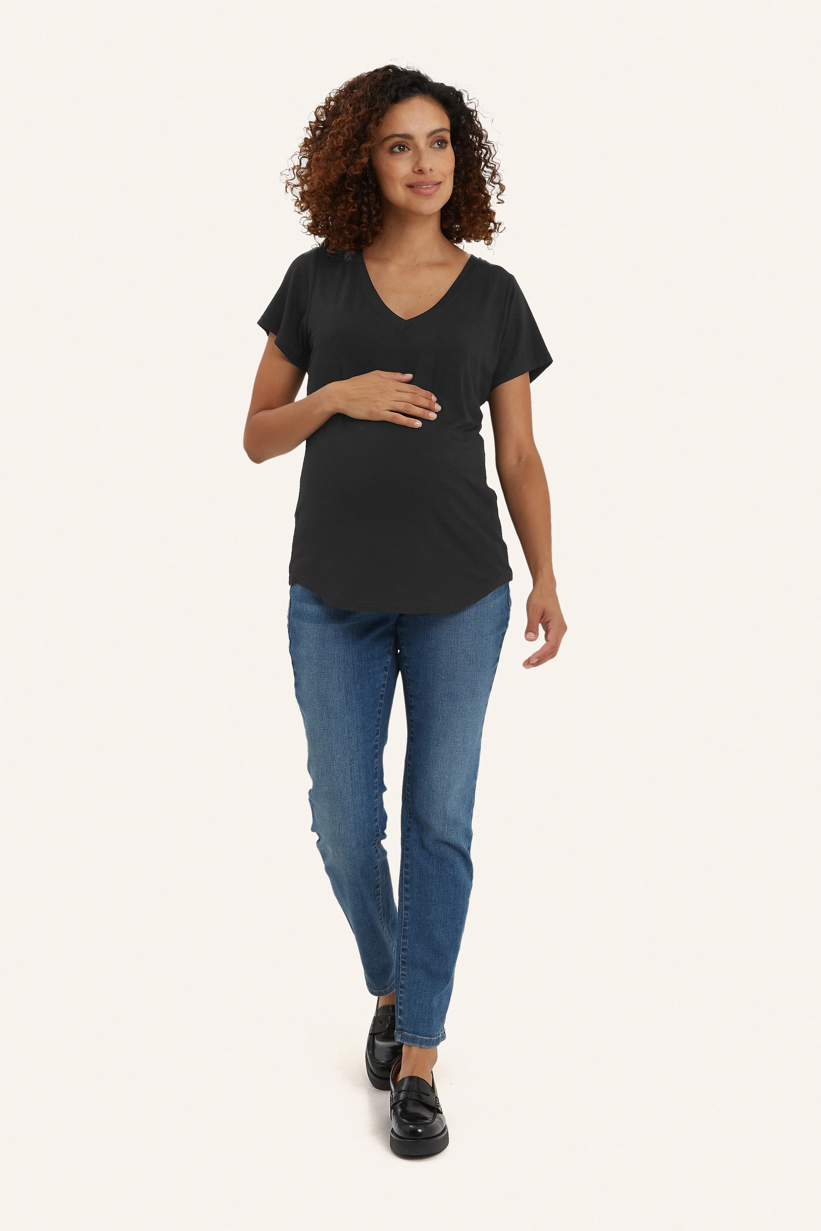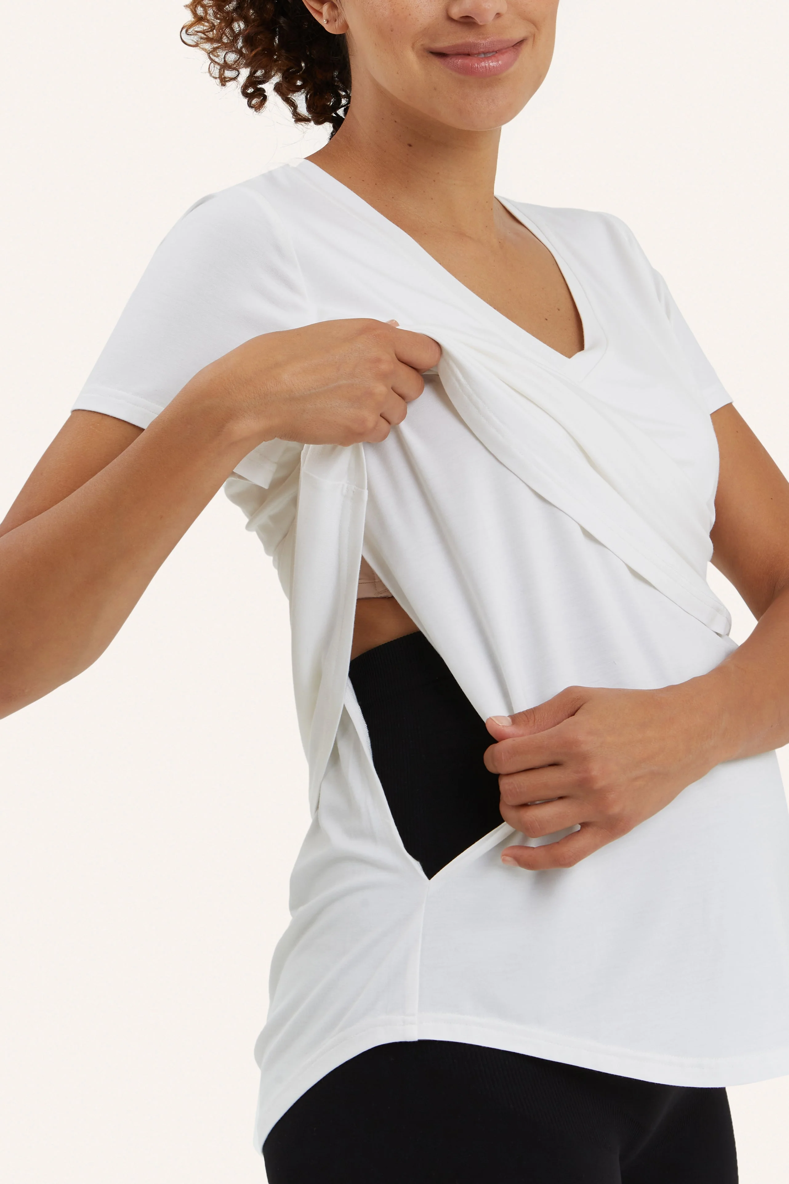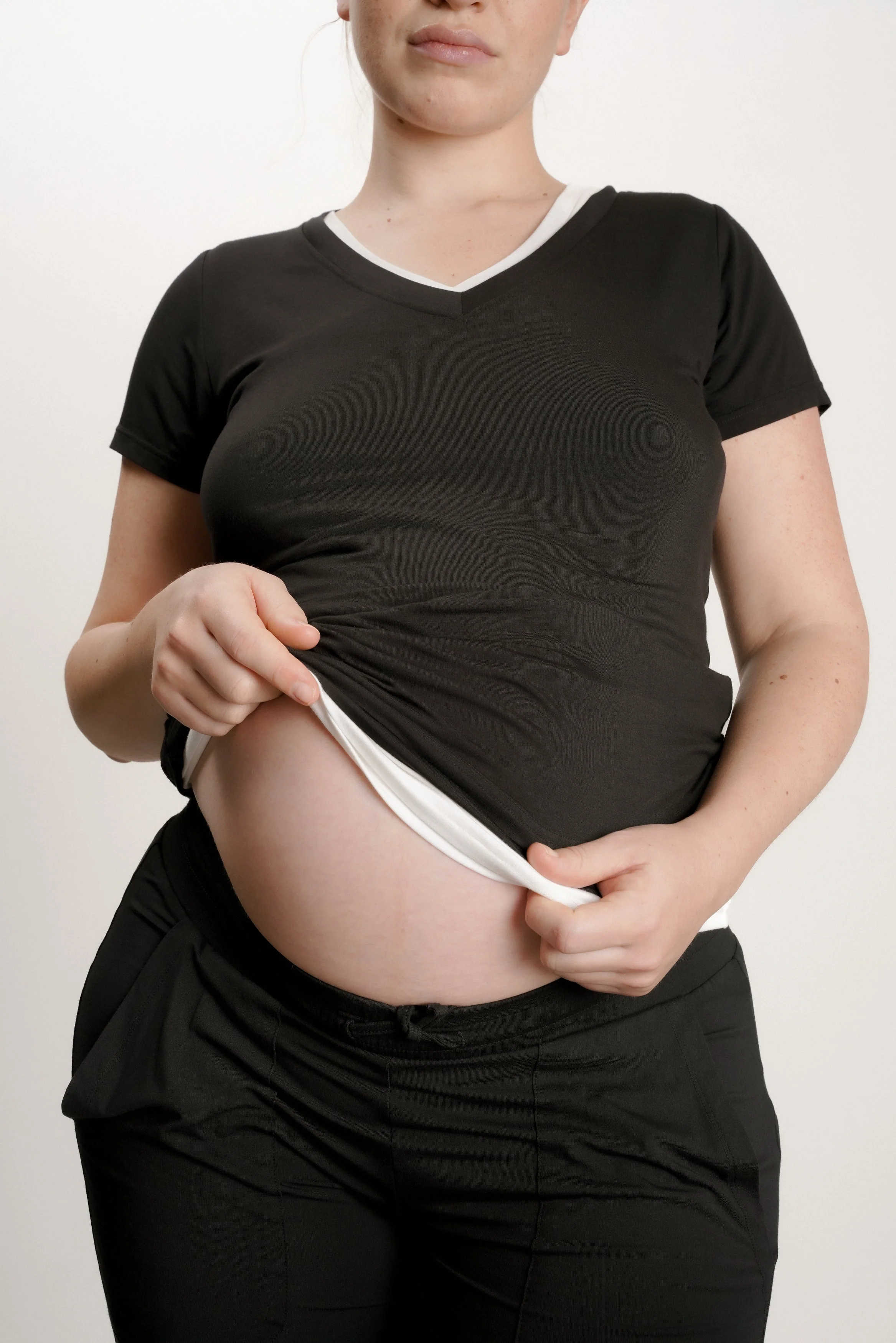 The Perfect V Neck shirt designed for bump and nursing. Made in our incredibly soft Bamboo fabric, The Nursing Tee has an inner layer that opens up for easy nursing access. A throw in your hospital bag staple that will make your fourth trimester a little easier and more comfortable.