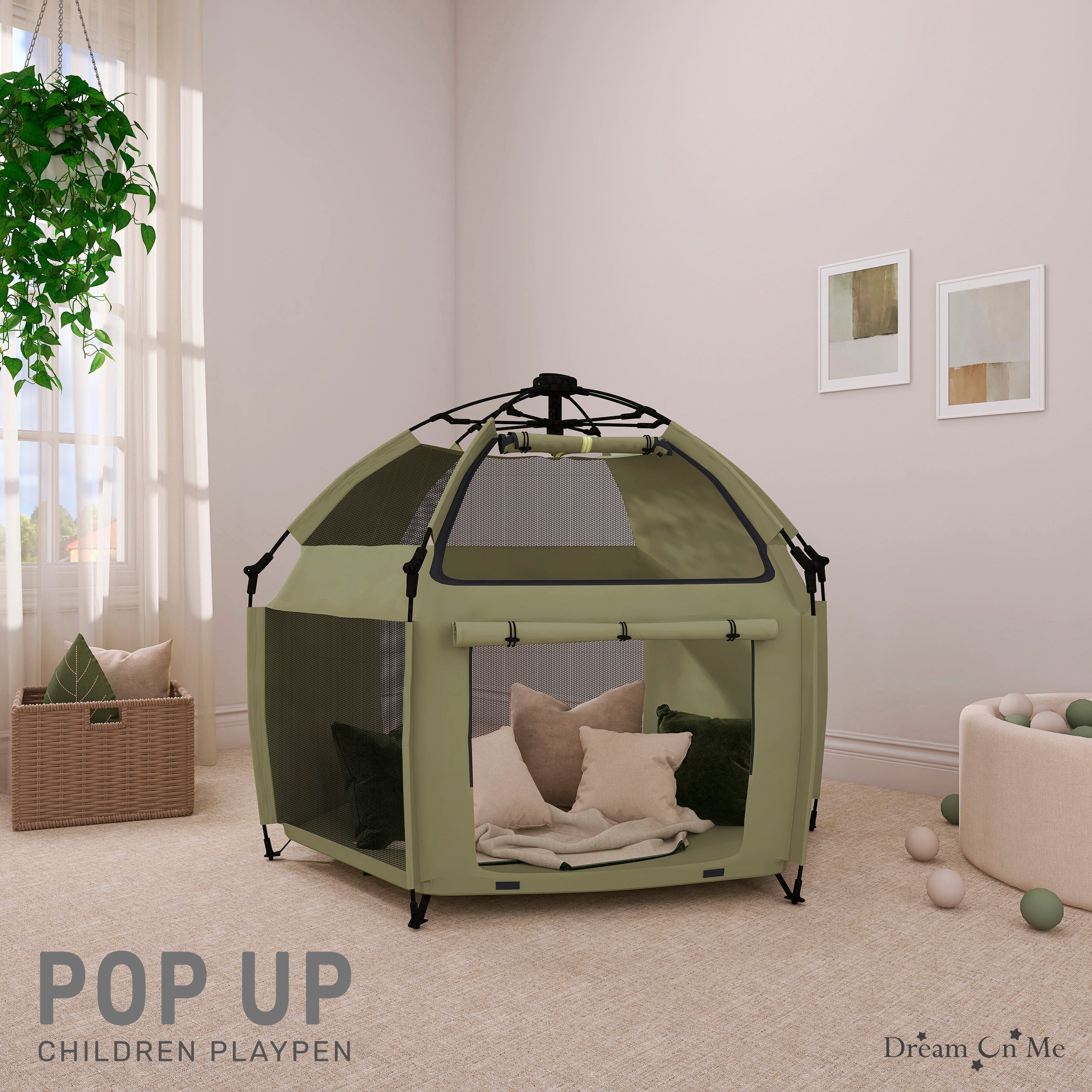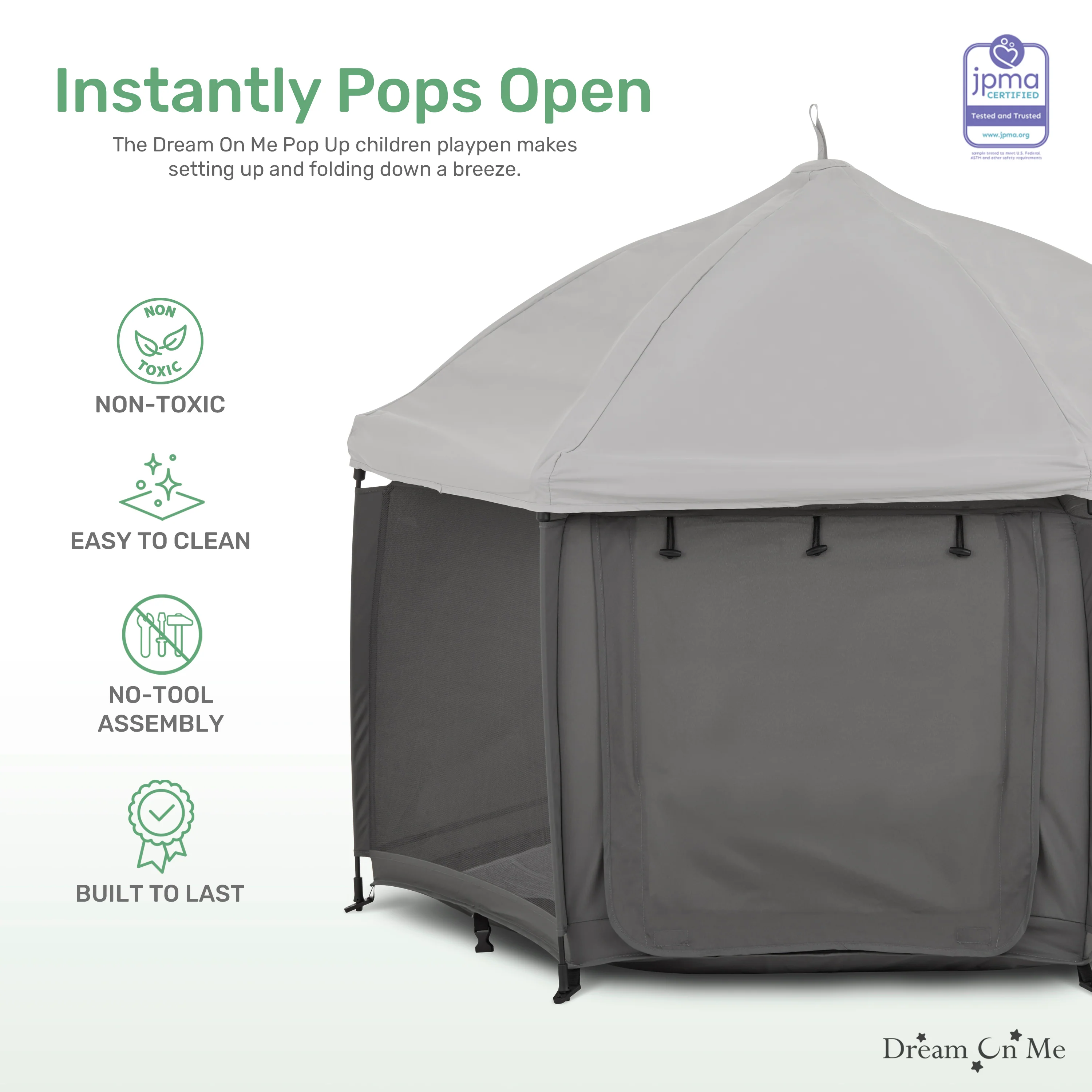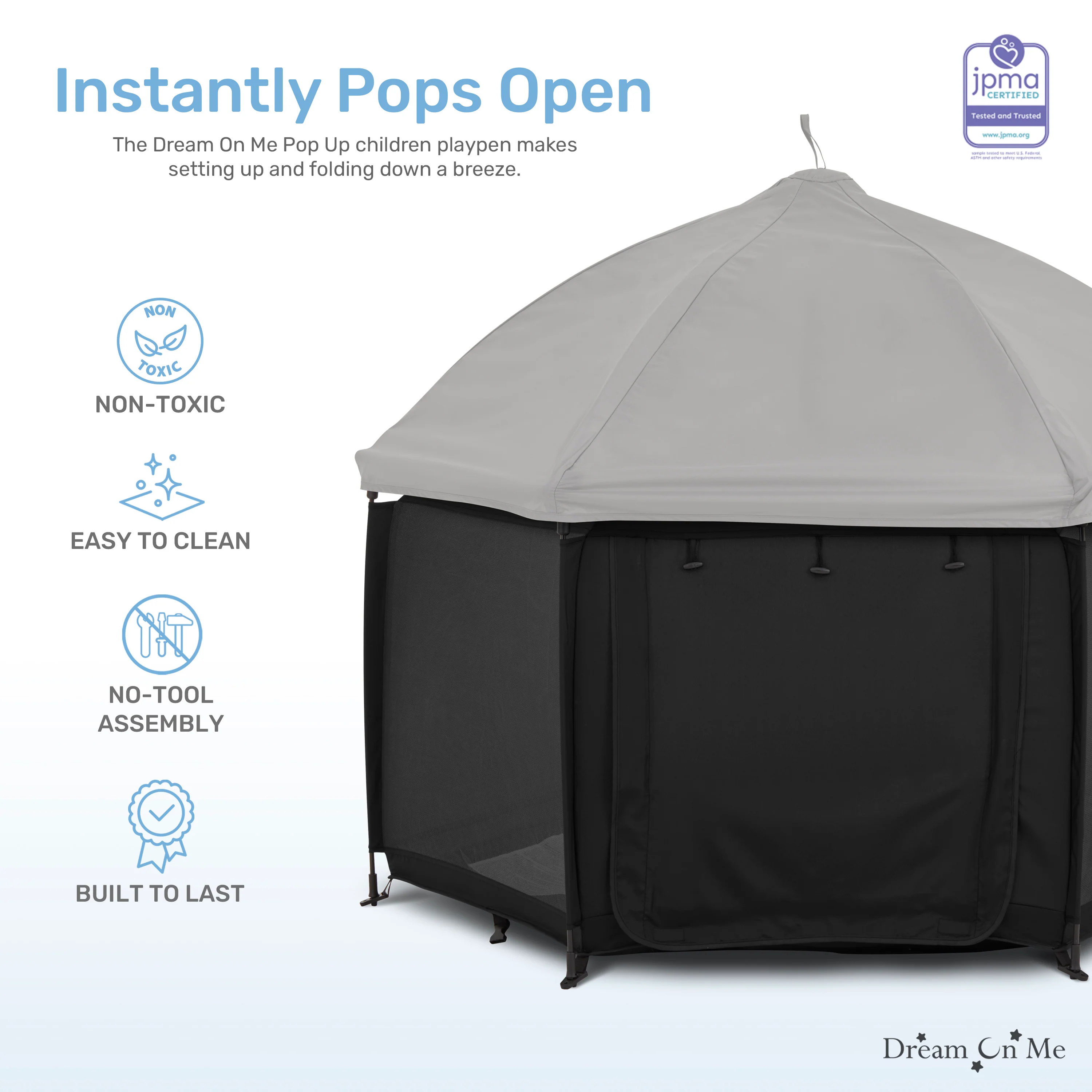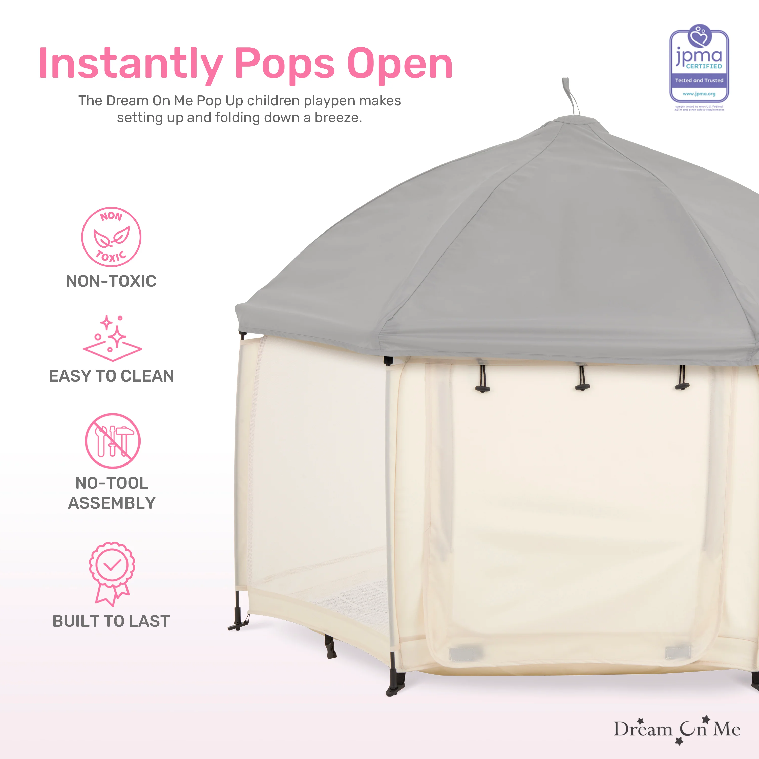 - COMPLETE SAFETY: The Dream On Me Pop Up Children Playpen meets/exceeds ASTM safety standards and boasts an automatic instant pop-up feature that makes setting up and folding down a breeze.