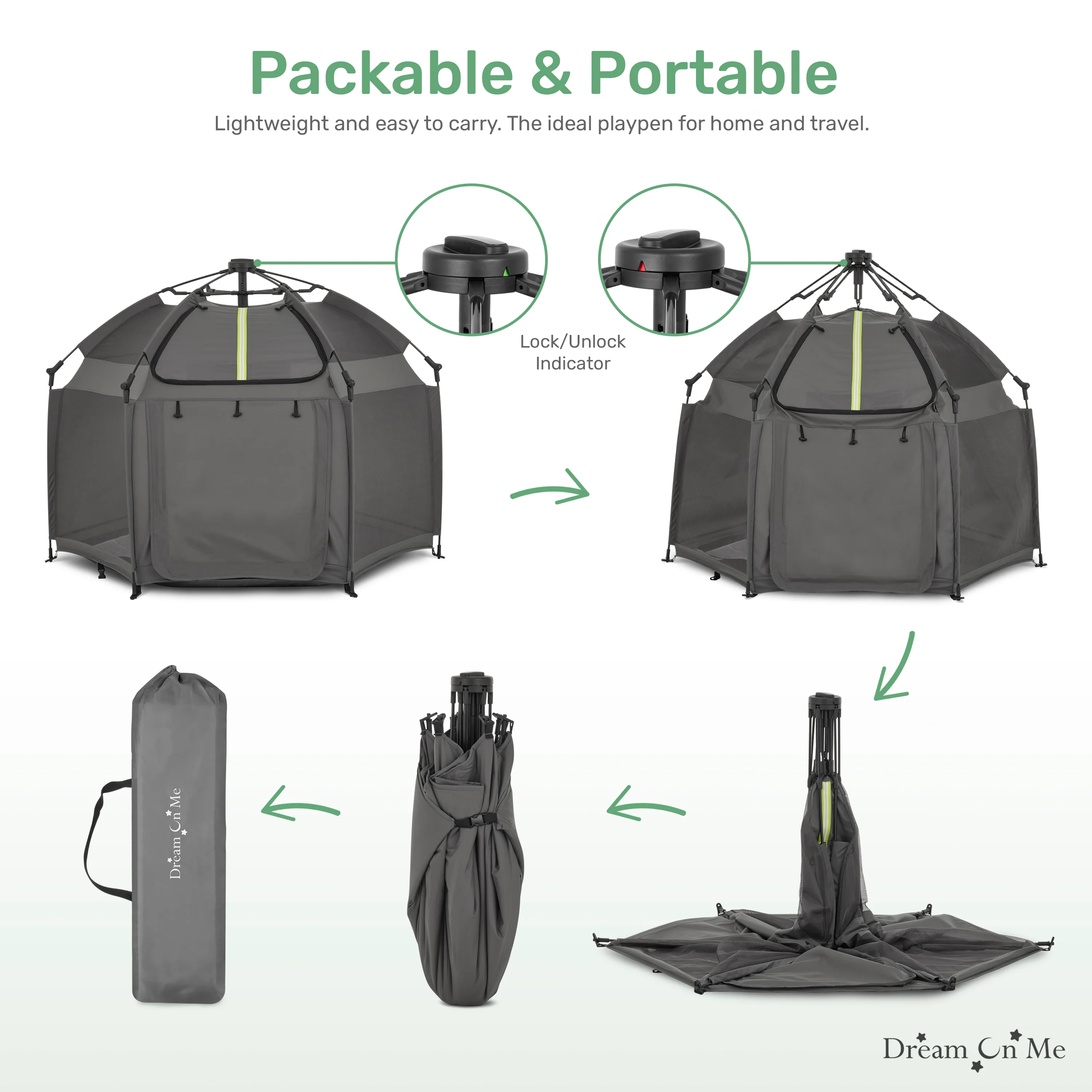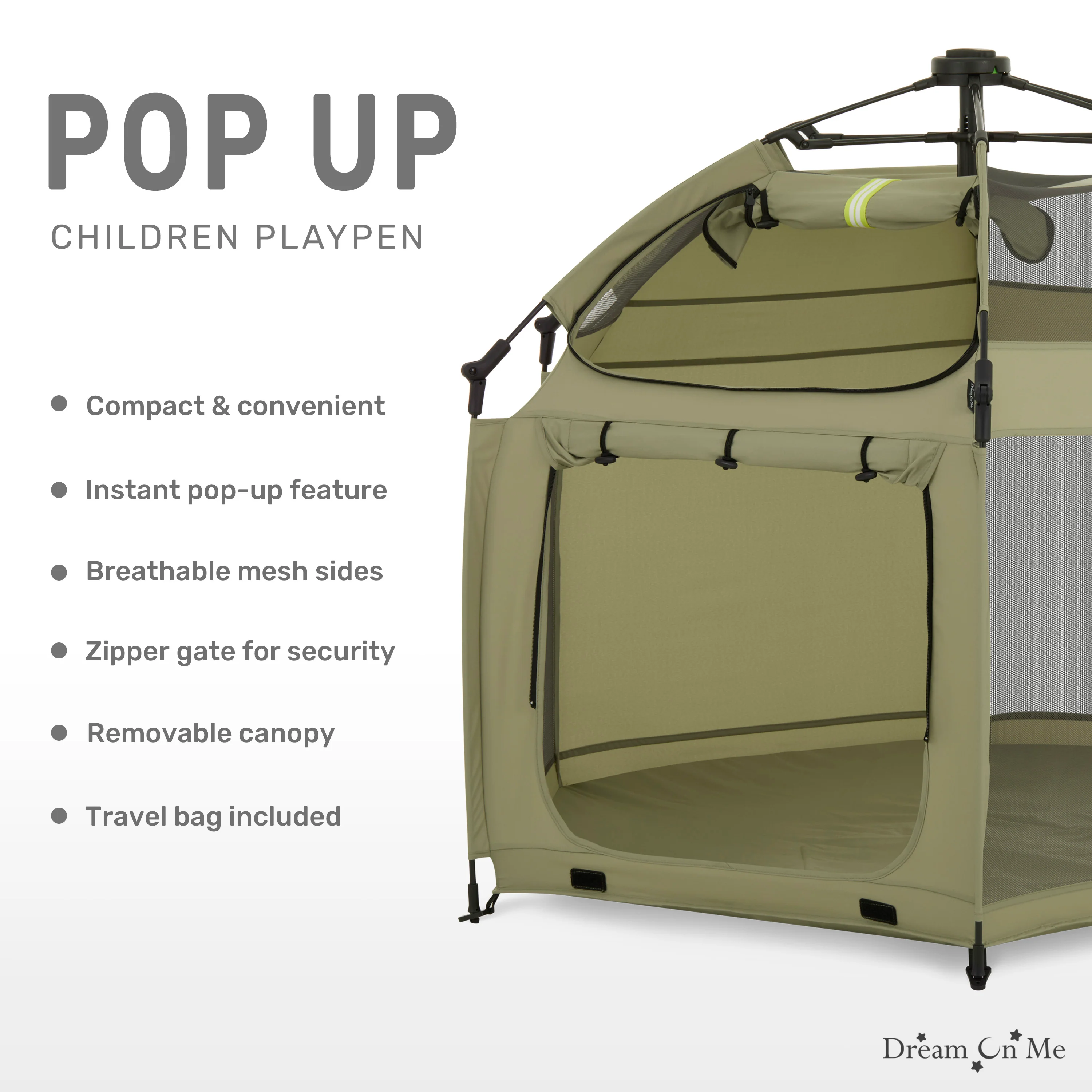 Unleash the fun with our Dream On Me Pop Up Children Playpen – the perfect blend of convenience and entertainment for your little one! Super lightweight & easy to carry, it's an ideal companion for home use, beach outings, or park adventures. The air-through mesh netting ensures breathable environment, while the canopy cover gives protection & the zipper gate adds an extra layer of security The Dream On Me Pop Up Children Playpen meets/exceeds ASTM safety standards and boasts an automatic instant pop-up feature that makes setting up and folding down a breeze. Plus, its compact size after folding makes it a travel-friendly option for families on the go. Now available in four stylish colors – Black, Taupe Green, Charcoal Gray, and French White, it's an experience designed for children aged 3-36 months. Product dimensions are 59.5” L x 47.24” W x 36.02” H, with a maximum weight capacity of 50 Lbs.