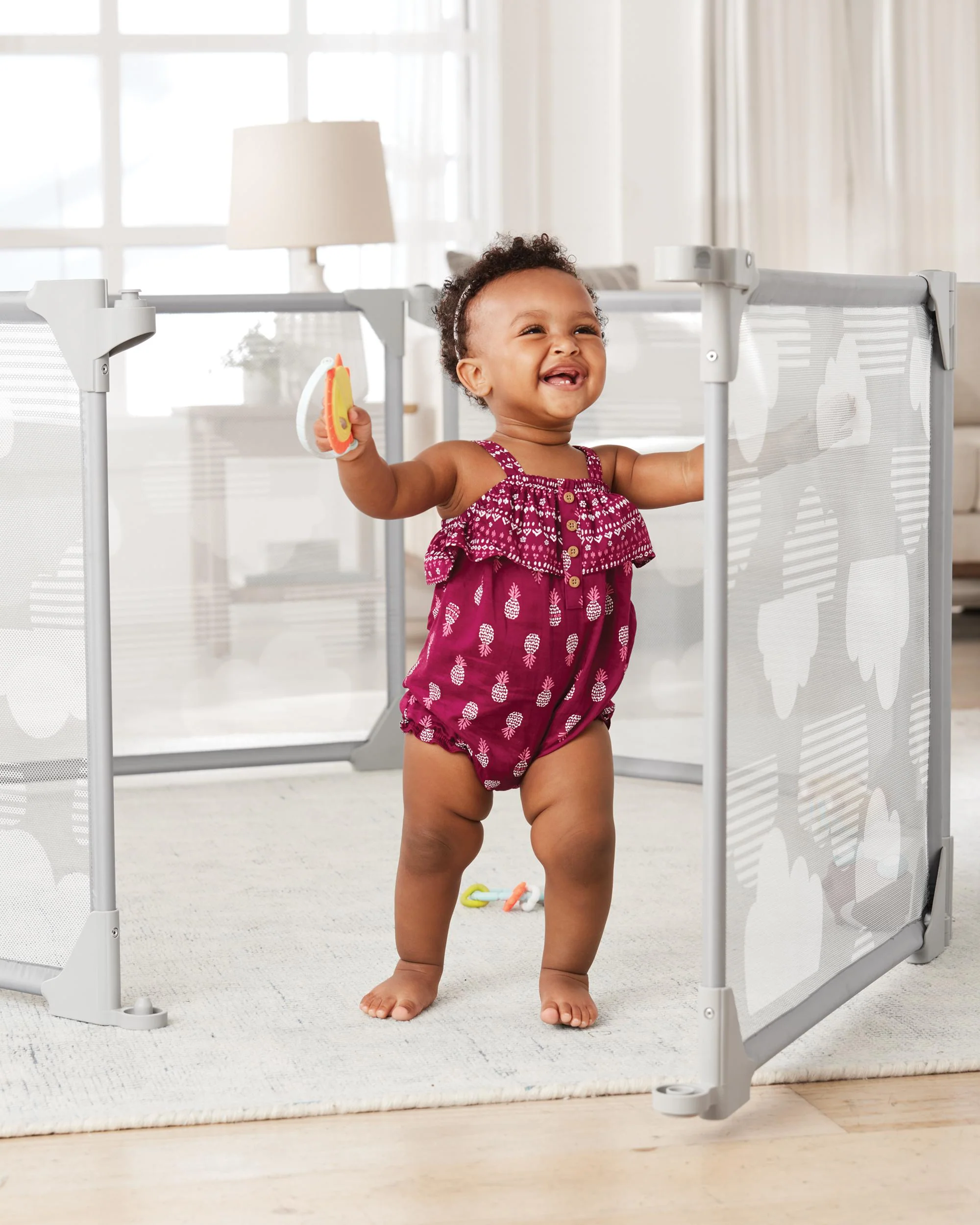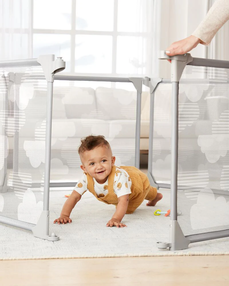 - Modular steel frame panels keep baby safely contained
