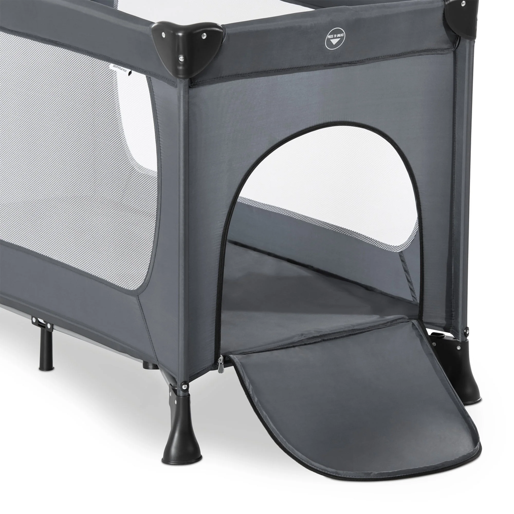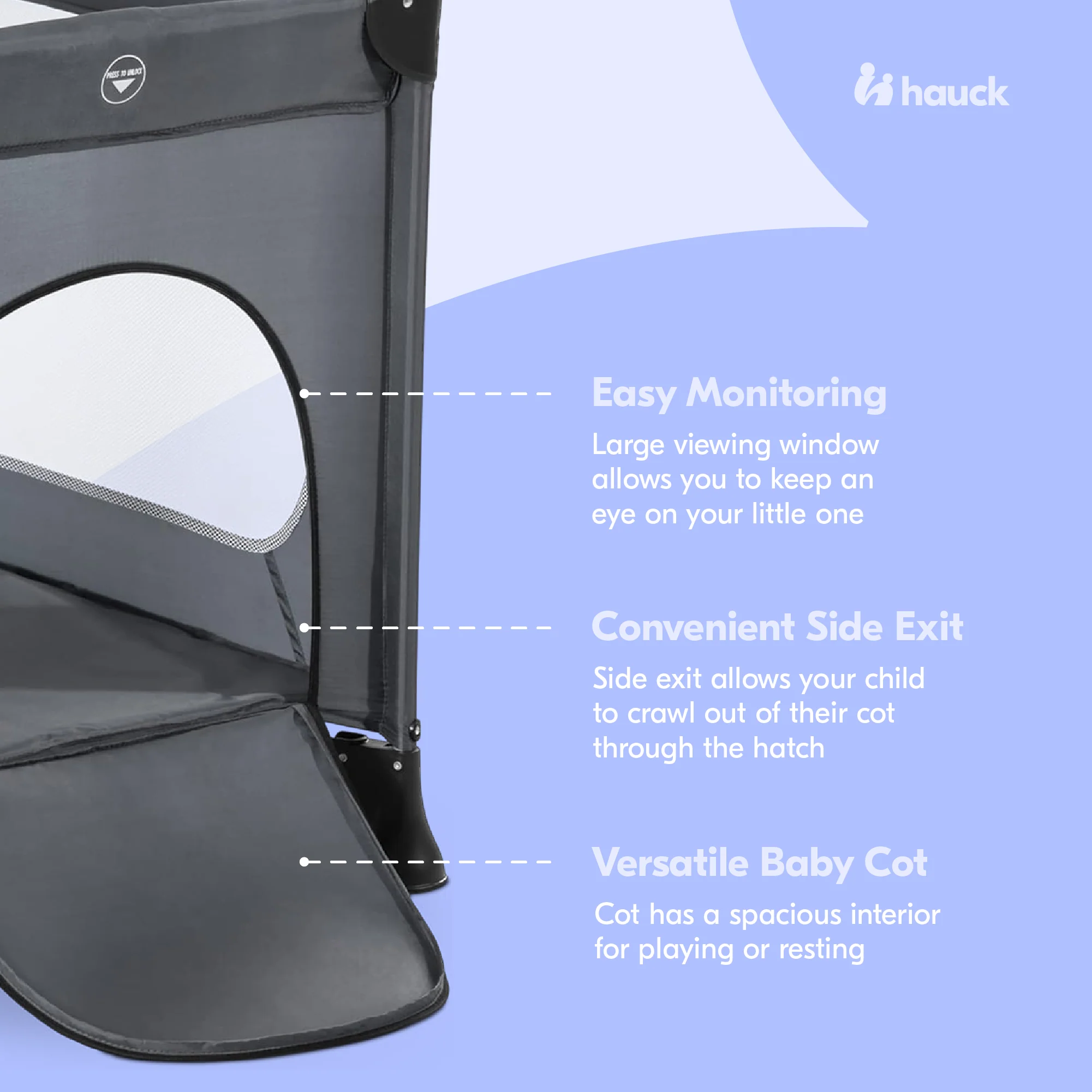 The hauck Dream'n Play features large, breathable viewing windows, allowing you to keep an eye on your little one as they sleep or play comfortably. This travel cot provides your child with the necessary sense of security, whether you're on the go or at home. The side zip, which can only be opened from the outside, allows children to enter and exit independently, ensuring hours of fun and freedom.