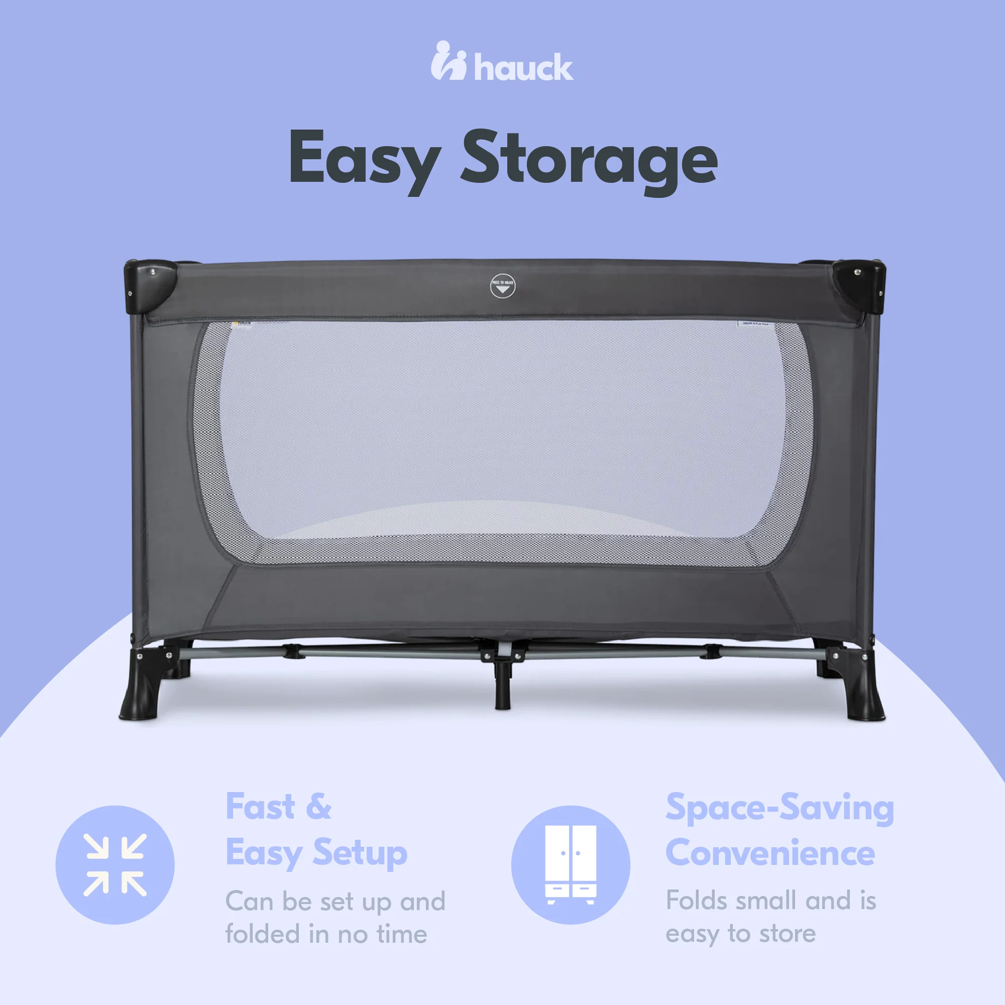 Experience the perfect blend of comfort, convenience, and security with the hauck Dream'n Play Travel Cot Plus for Babies and Toddlers up to 33 pounds. This lightweight travel cot is your most practical companion, whether you're on holiday or visiting family. Designed for portability, the cot can be easily folded for space-saving storage and set up again in just a few simple steps, making it an ideal solution for travel.